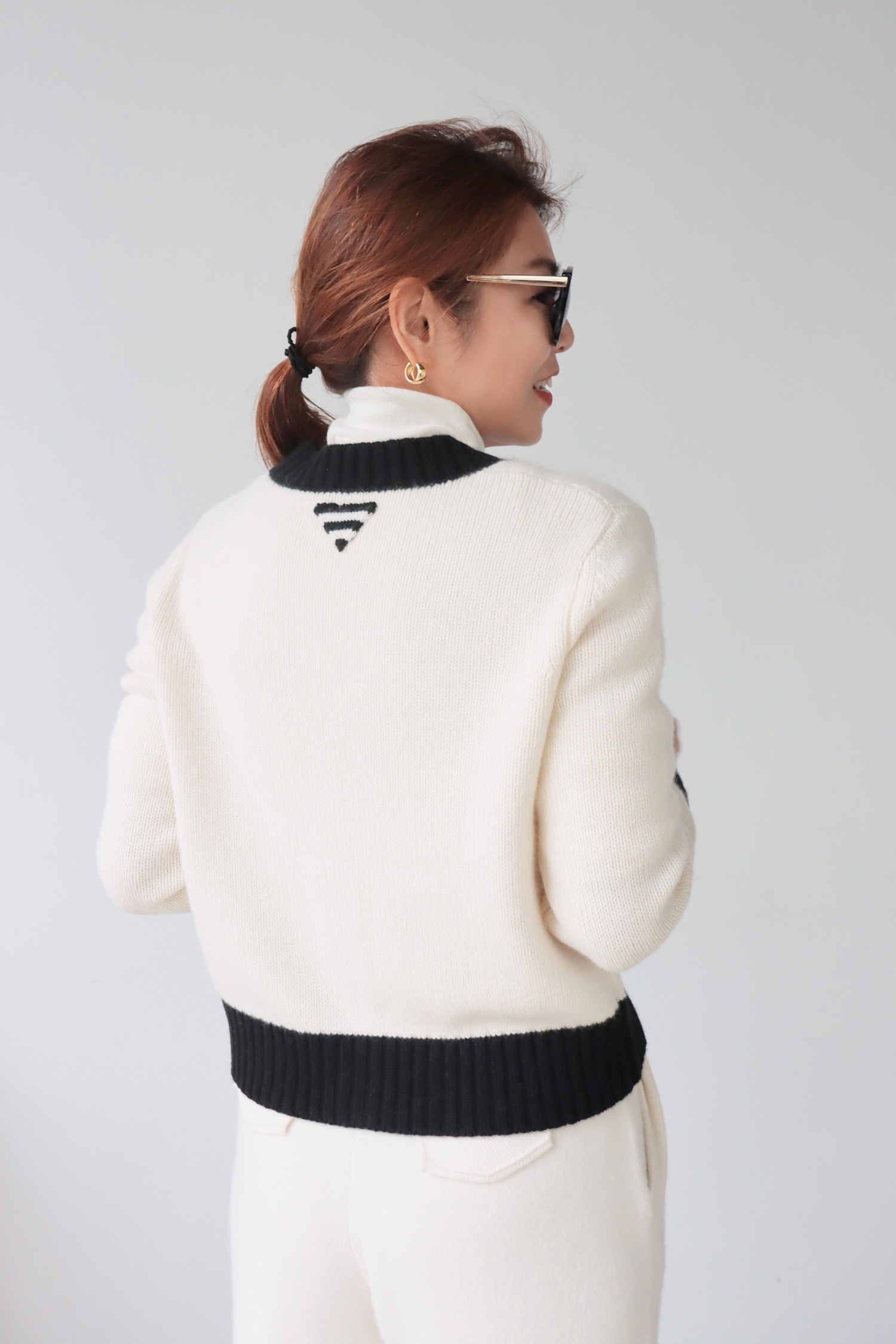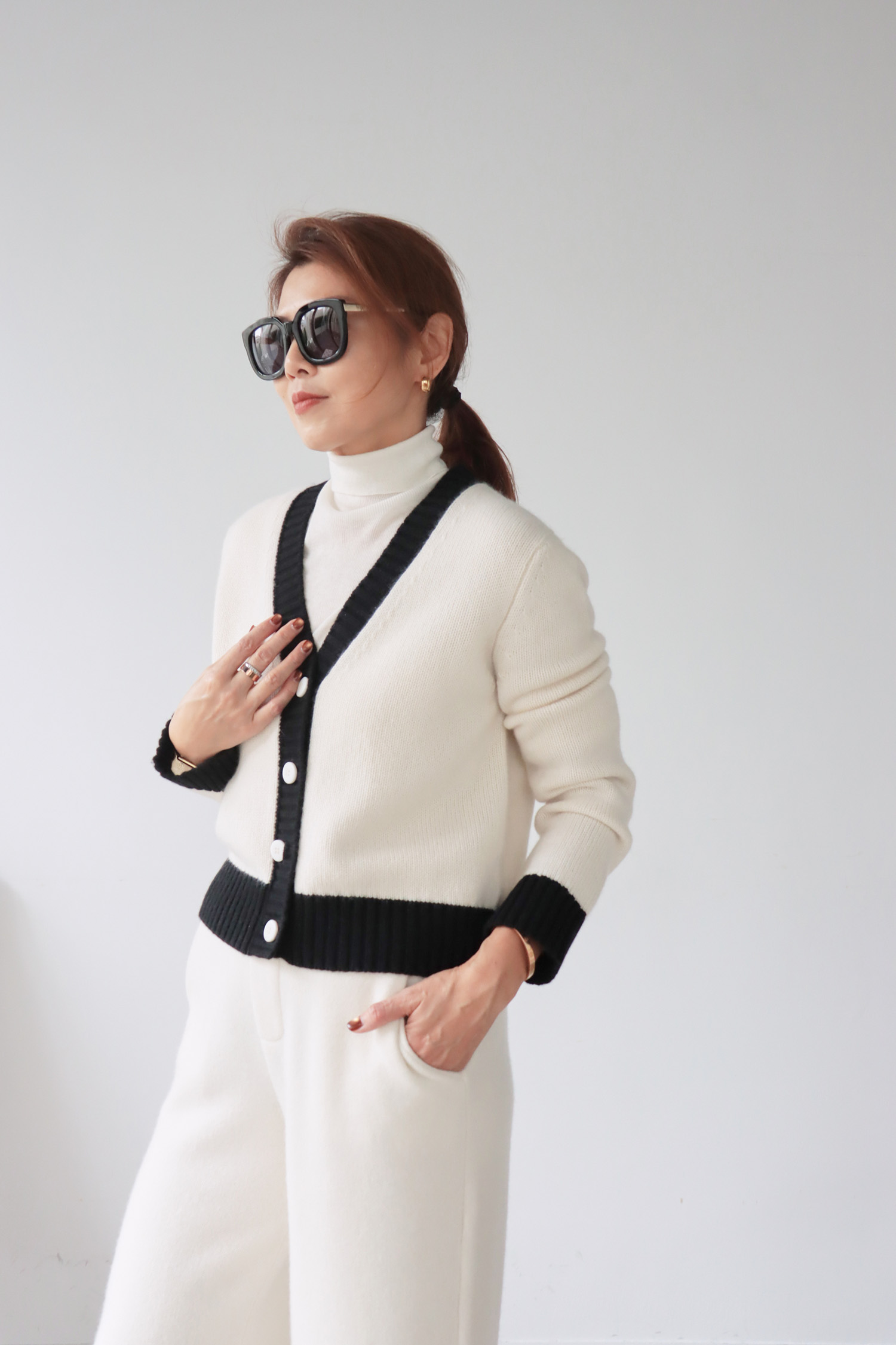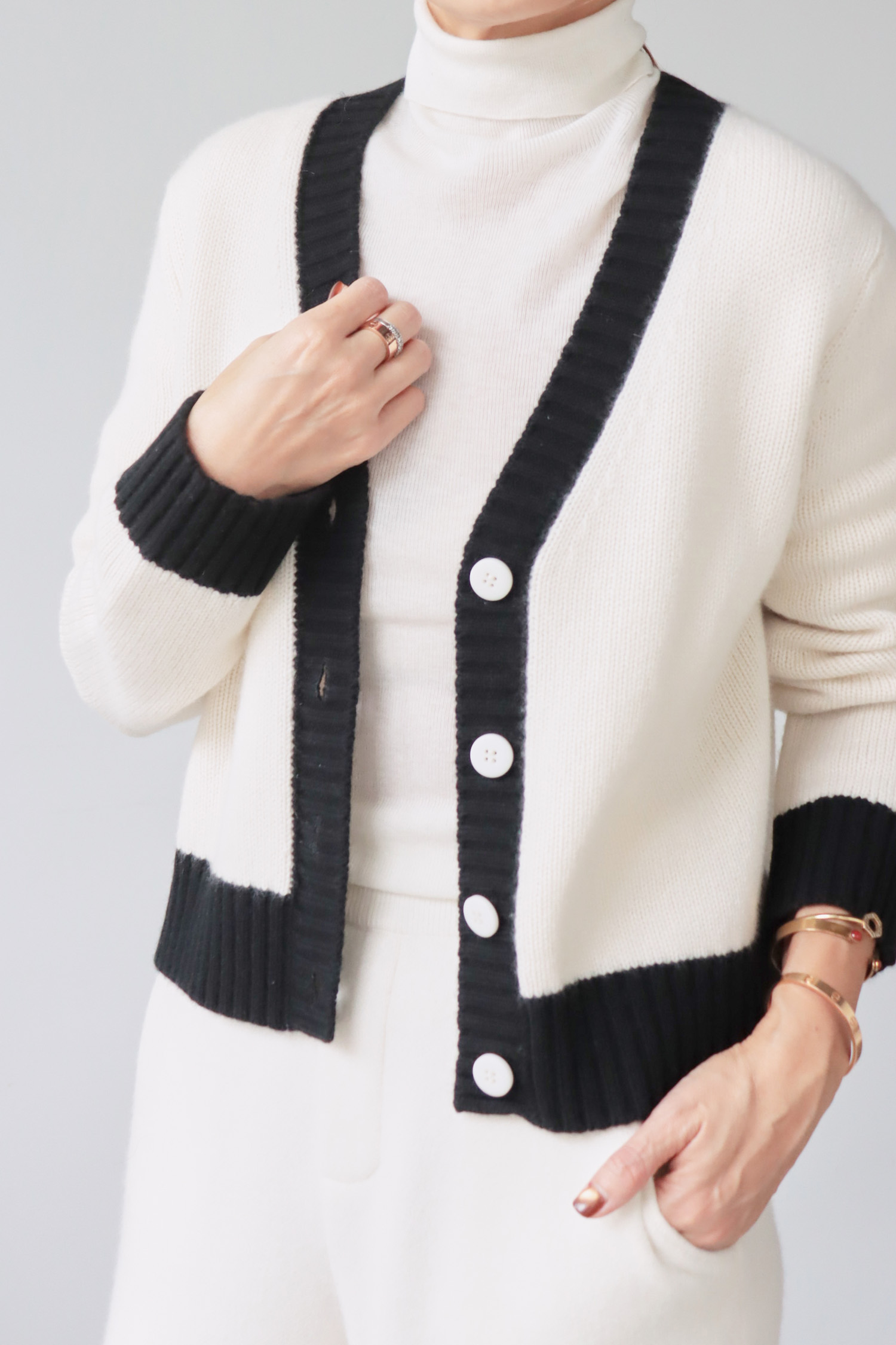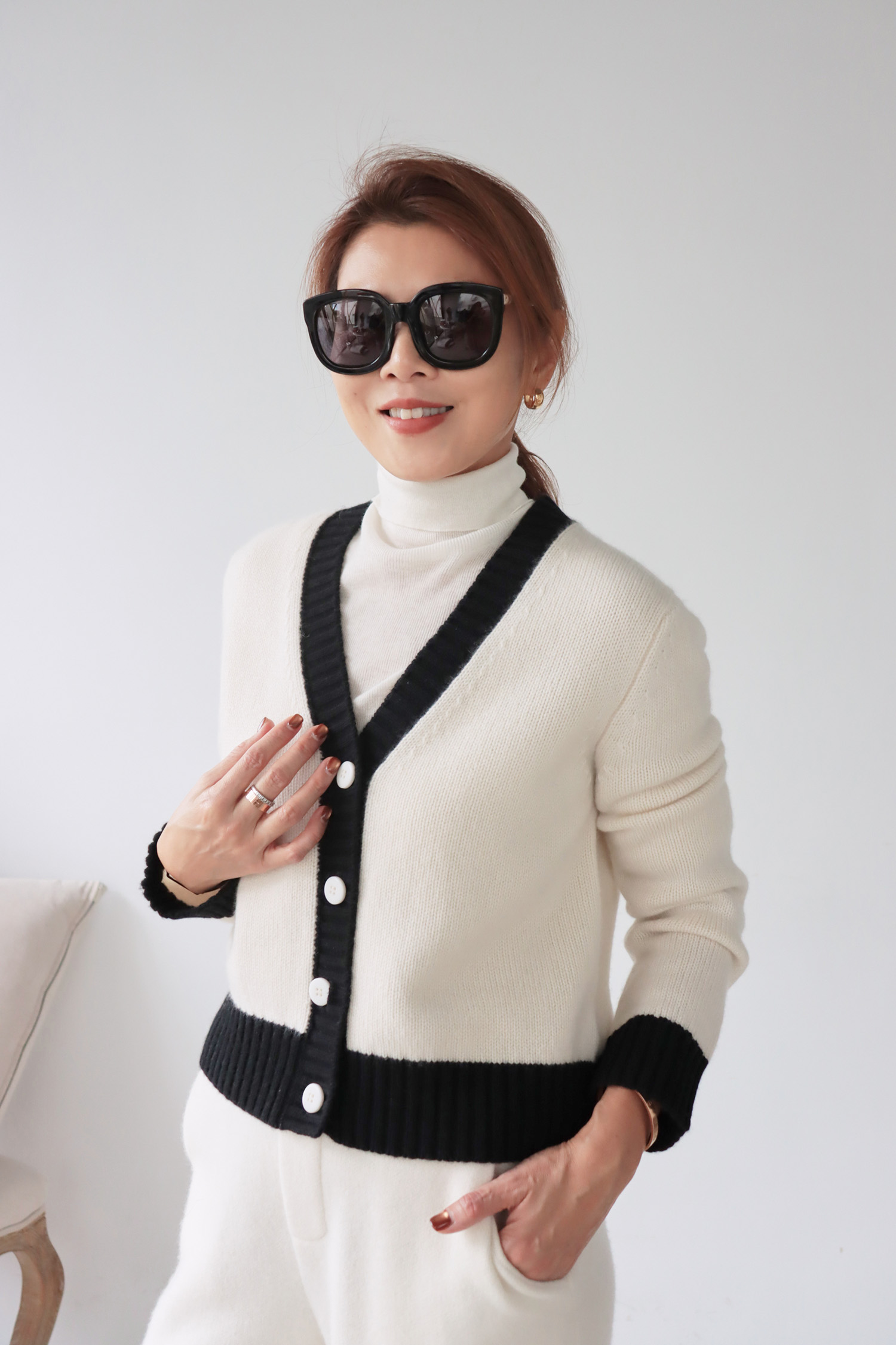 【搶先價】100% Cashmere 黑白撞色V領開襟衫 05010110