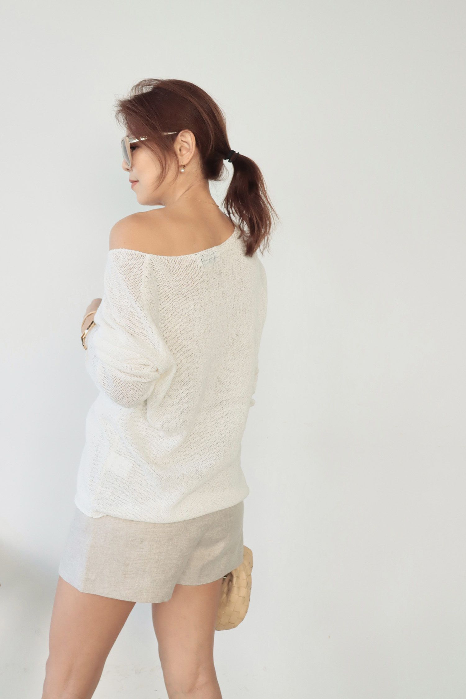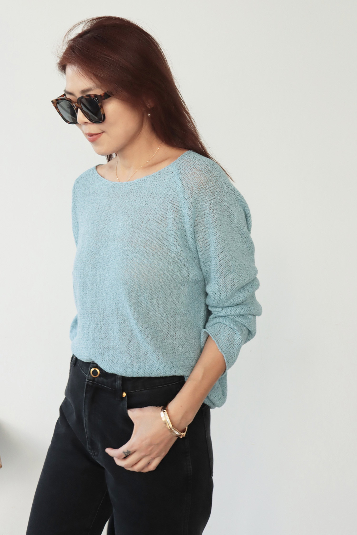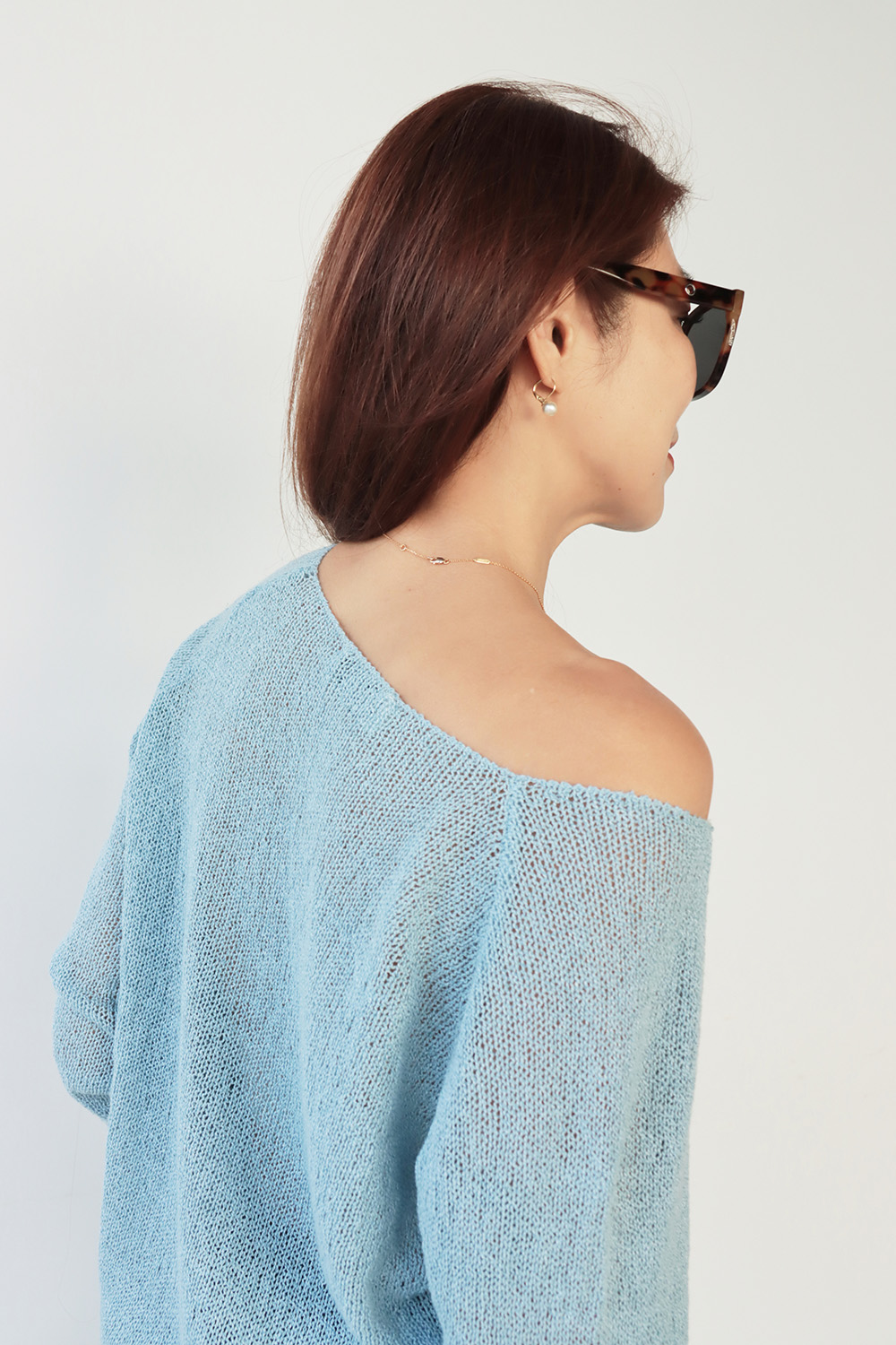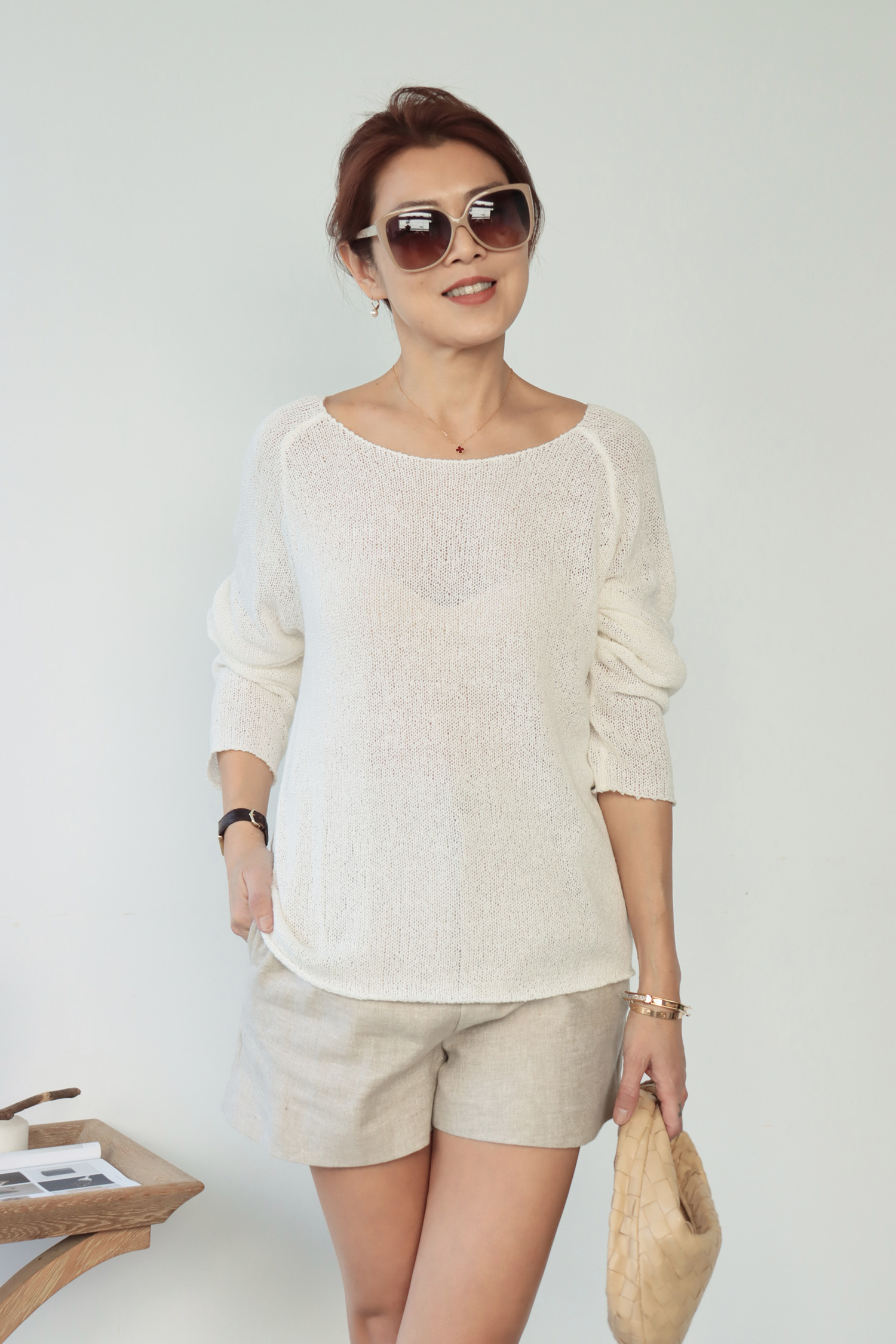 ・輕盈針織面料帶來柔軟透氣的舒適感受,寬鬆版型不貼身提供自在活動空間,同時面料垂墜感佳輕鬆修飾身形曲線,微鏤空細節展現恰到好處的透肌感,增添層次與女人味,讓造型更具視覺焦點;大U領設計既可正肩穿著,營造簡約俐落感,也可斜肩穿搭,展現微微性感與隨性魅力,適合多變的穿搭需求。
