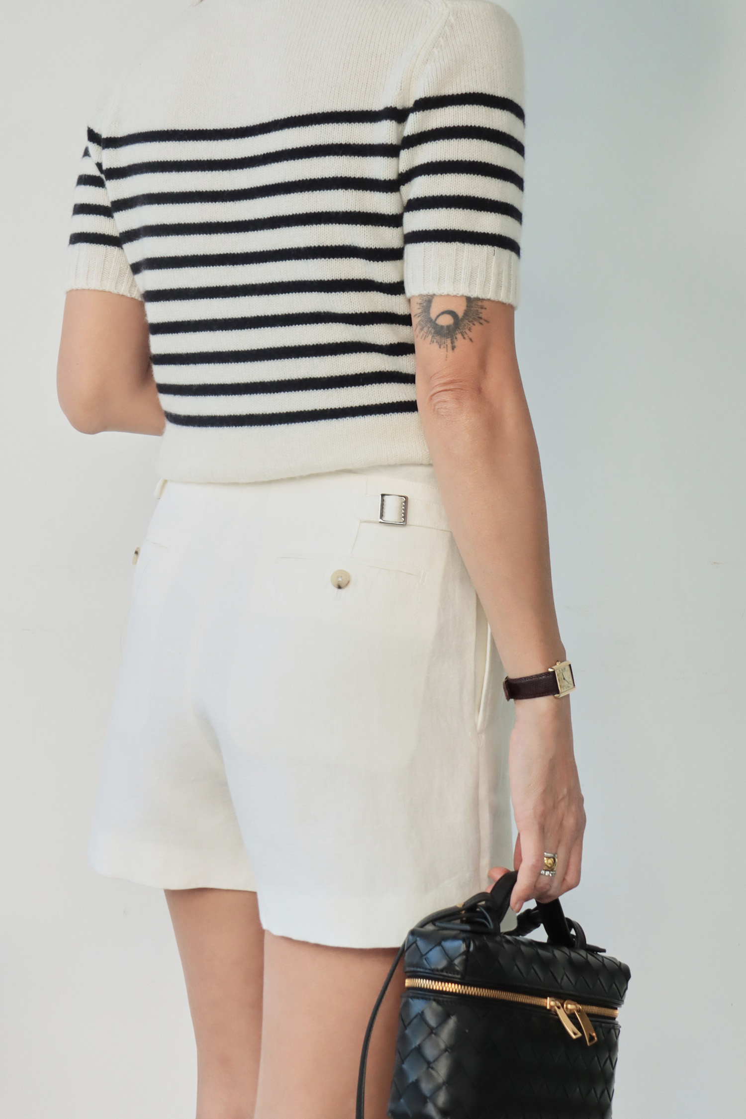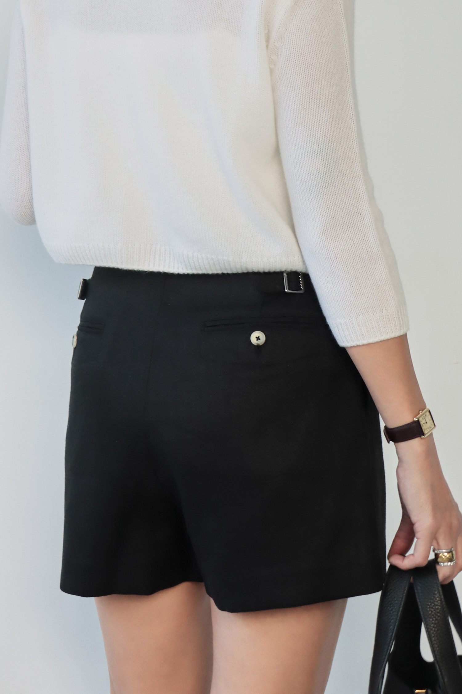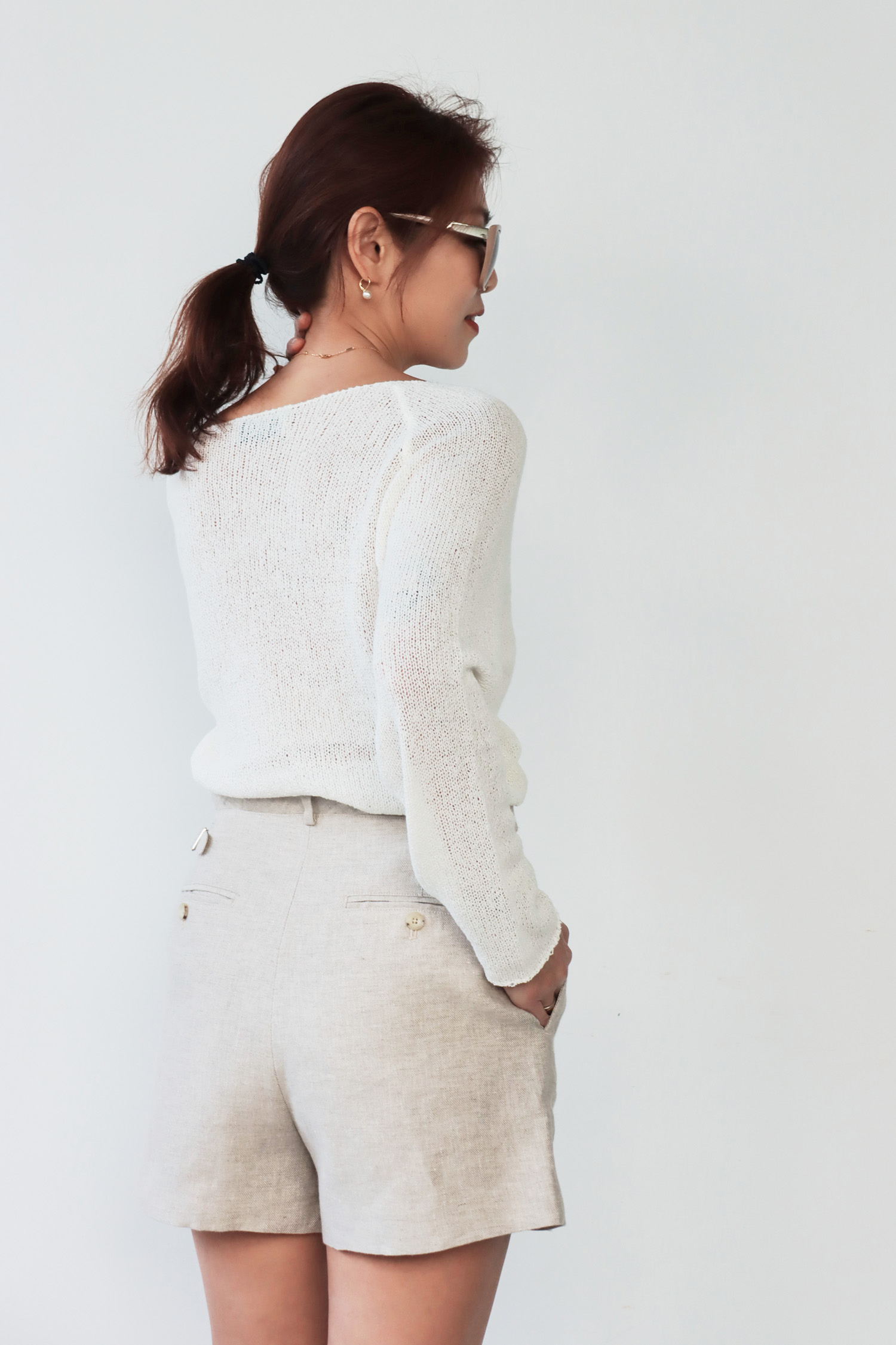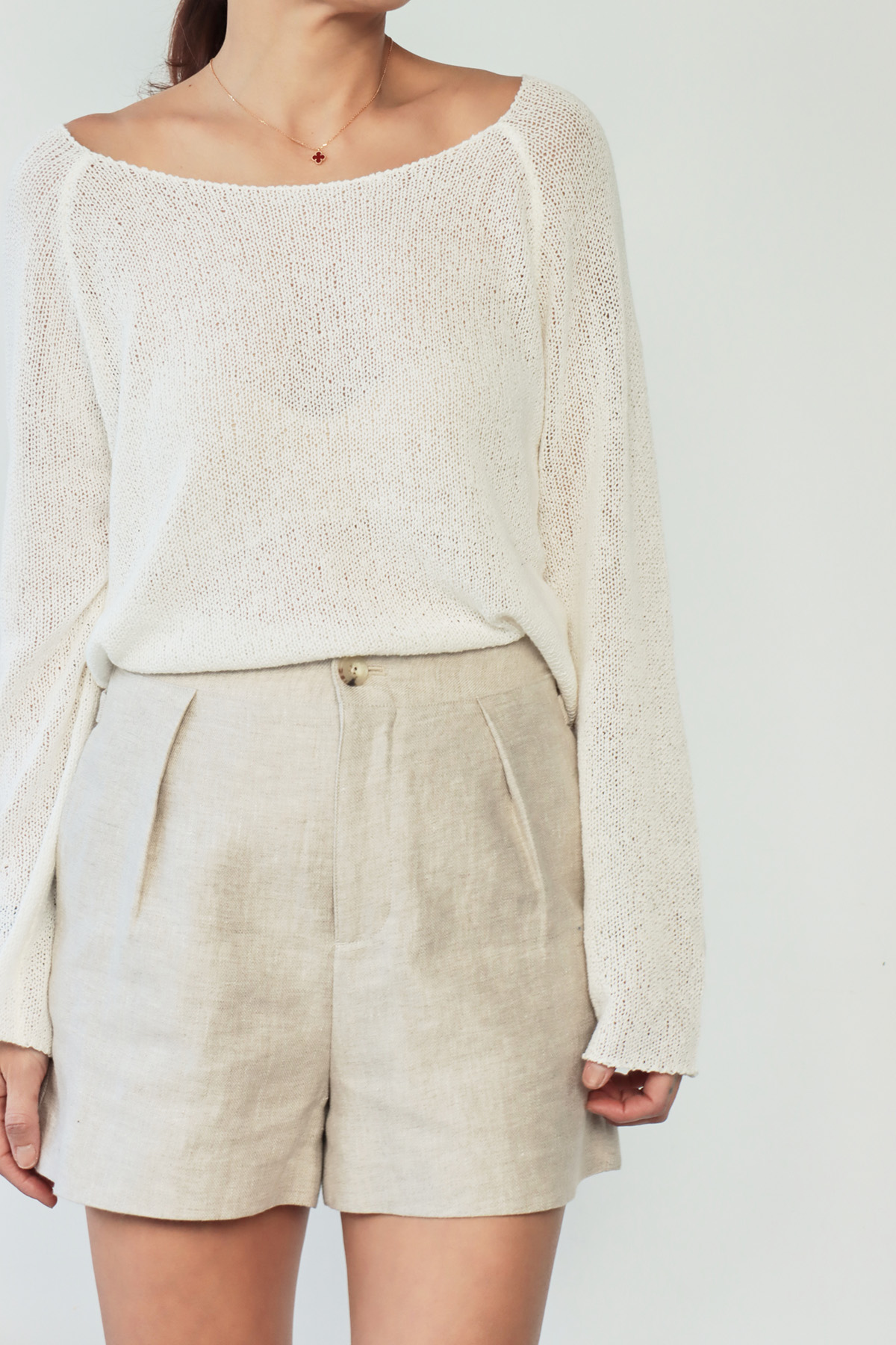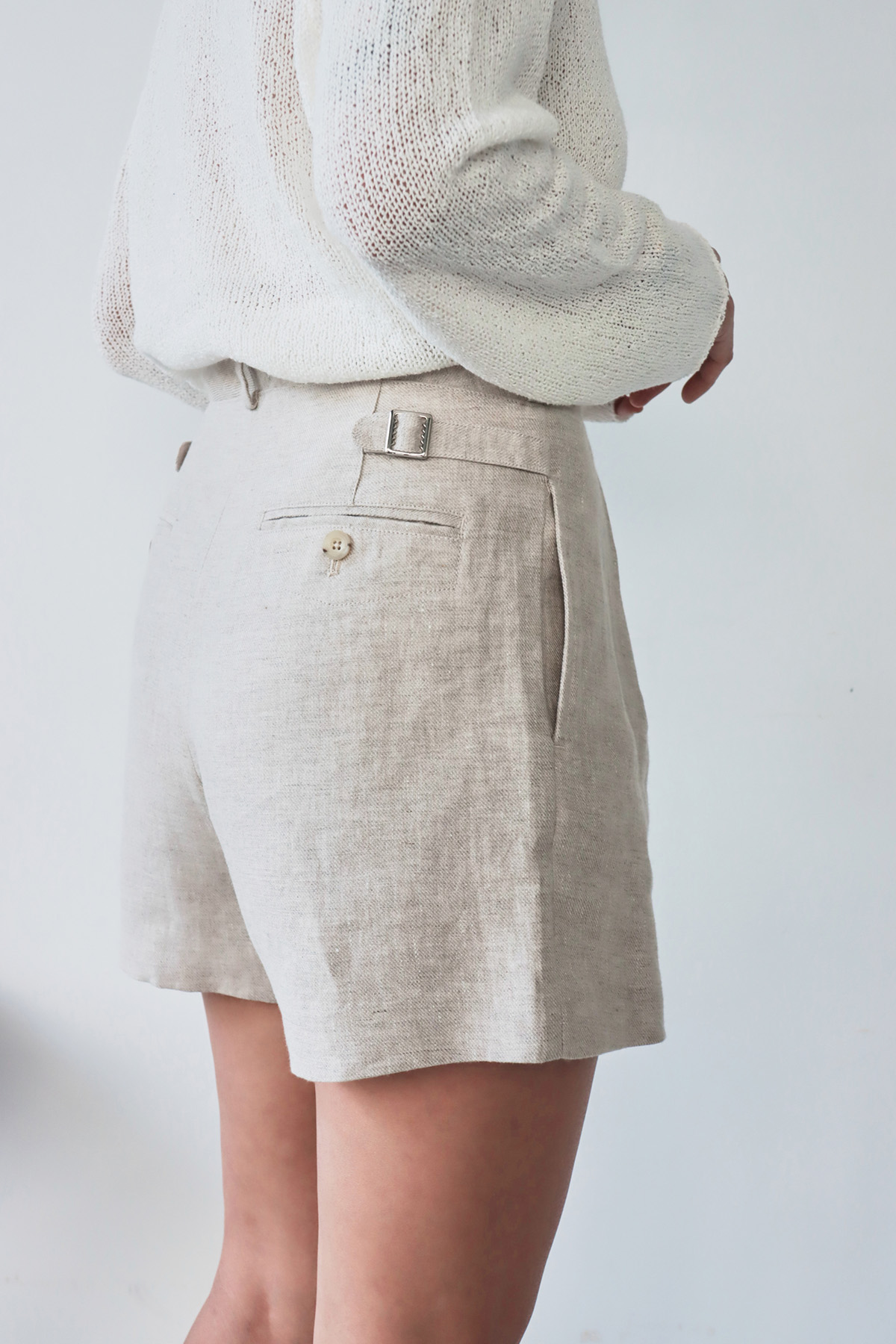 ・採用100%天然亞麻面料,擁有優異的透氣性與輕盈觸感,內裡輕薄不刺癢,帶來舒適涼爽的穿著體驗。高腰設計拉長腿部比例,前打摺細節增添立體感,同時帶來適度寬鬆感,提升行動自由度,背面設計可調節腰帶,讓穿著更貼合身形,兼具細節與實用性,方便根據個人需求調整舒適度。