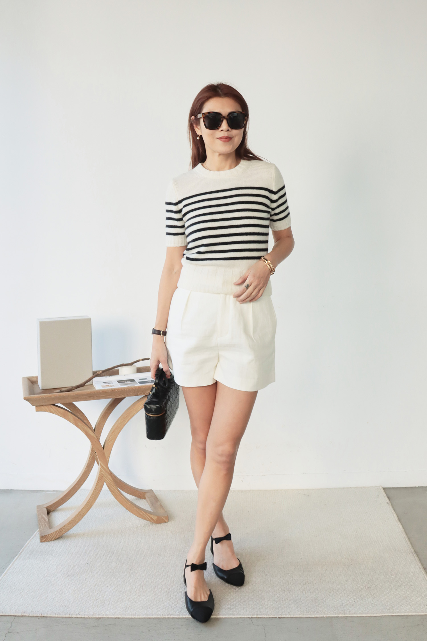 ・上衣-100% Cashmere 拚色條紋短袖毛衣