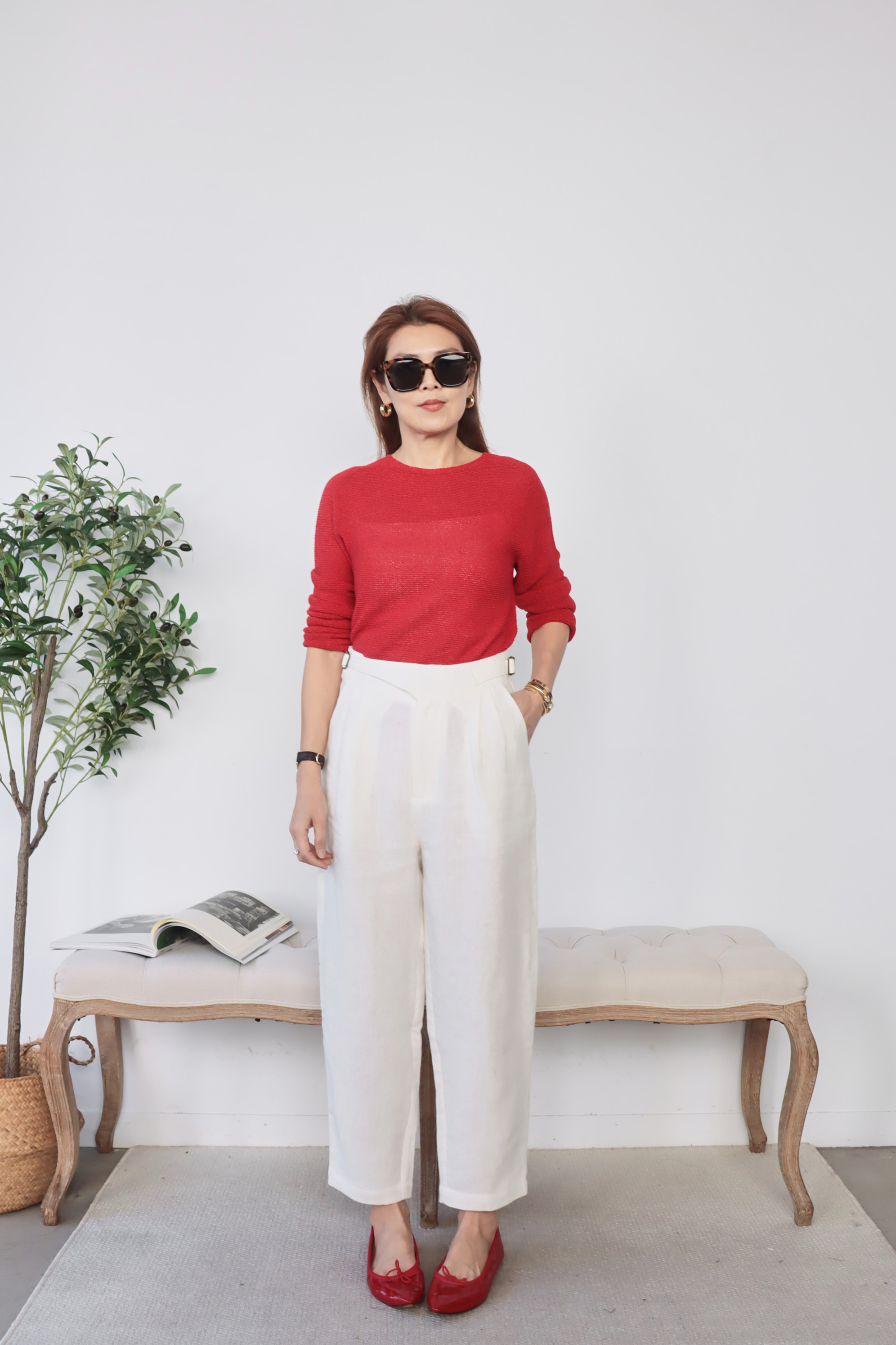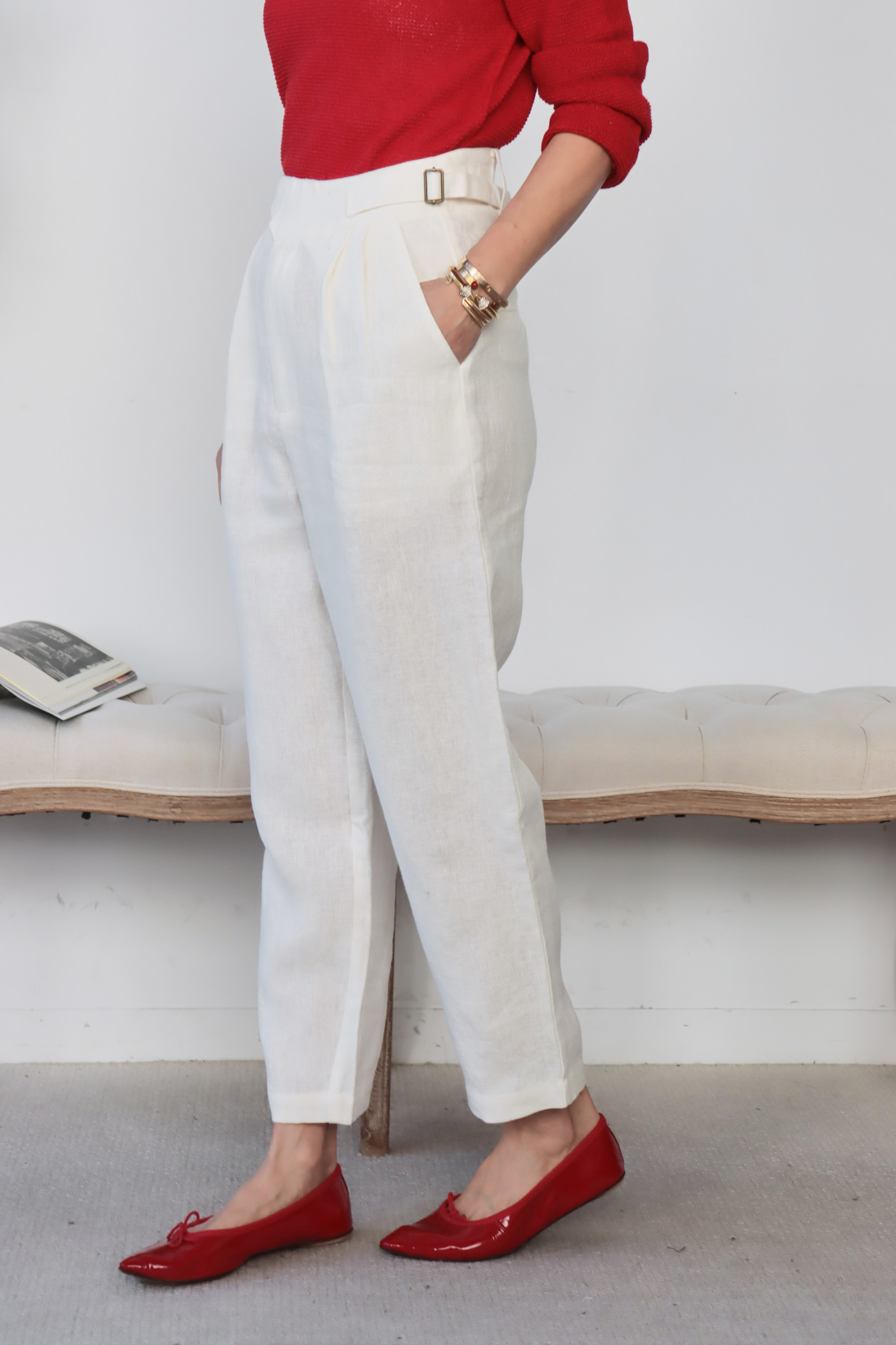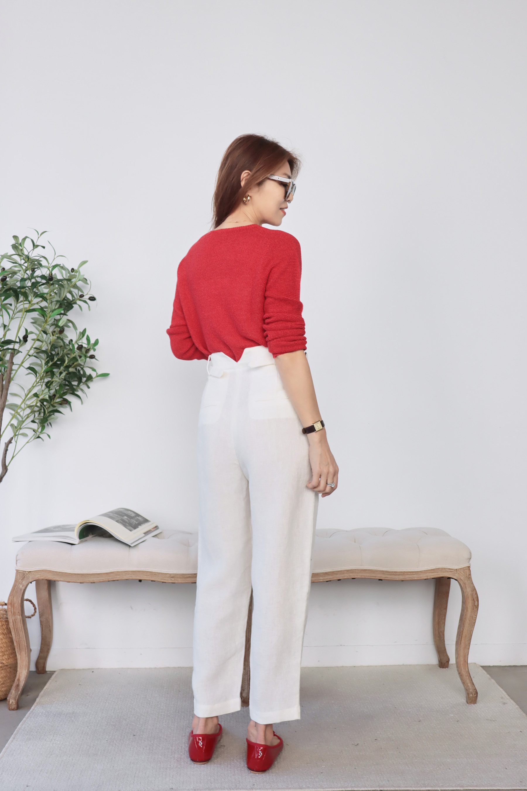 ・100% 亞麻面料結合純棉內裡,兼具亞麻的挺括質感與棉質的柔軟親膚,內裡採用高品質純棉,細緻透氣有效減少摩擦,提升穿著時的舒適感受,適合長時間貼身穿著。前片雙打摺設計,增添立體感與版型結構感,後腰頭採用獨特 V 型缺口細節,提升視覺層次與穿著靈活度,雙側綁帶可自由調節腰圍,輕鬆擁有貼合且舒適的穿著體驗,打造挺拔利落的整體輪廓。