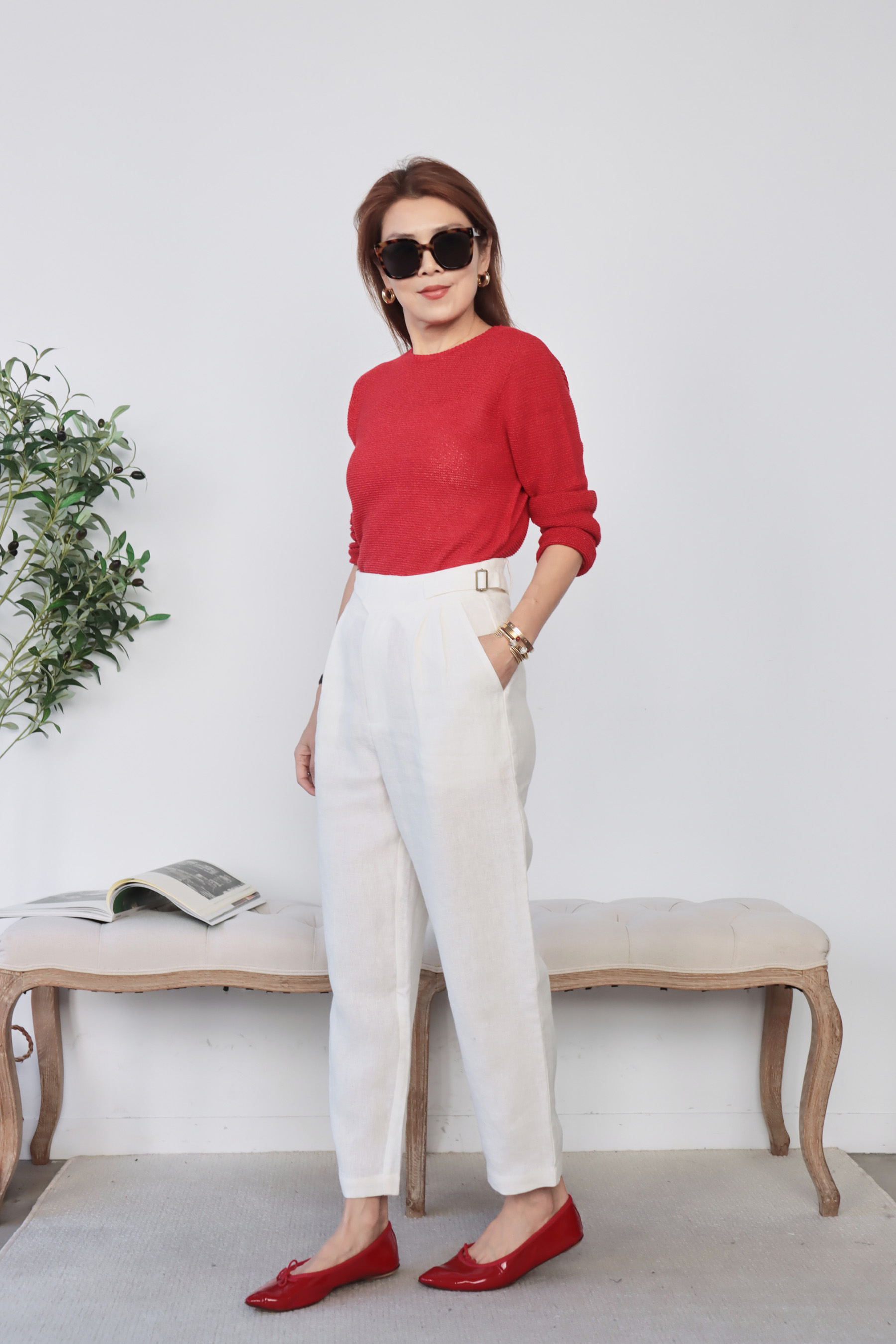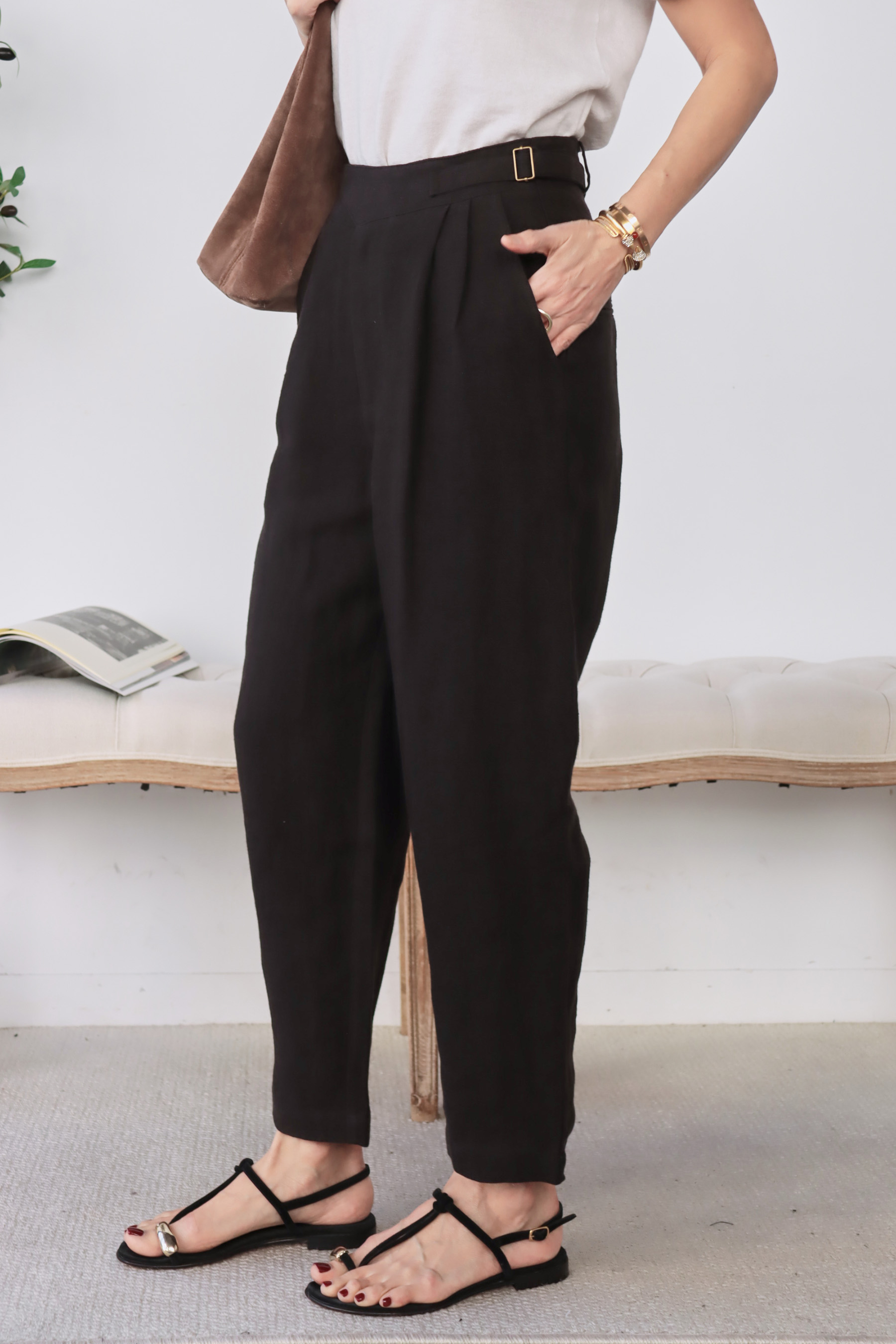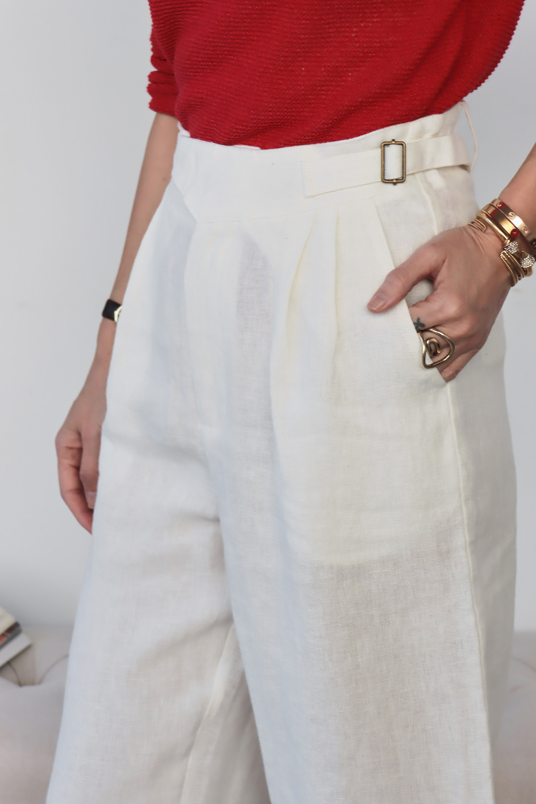 ・100% 亞麻面料結合純棉內裡,兼具亞麻的挺括質感與棉質的柔軟親膚,內裡採用高品質純棉,細緻透氣有效減少摩擦,提升穿著時的舒適感受,適合長時間貼身穿著。前片雙打摺設計,增添立體感與版型結構感,後腰頭採用獨特 V 型缺口細節,提升視覺層次與穿著靈活度,雙側綁帶可自由調節腰圍,輕鬆擁有貼合且舒適的穿著體驗,打造挺拔利落的整體輪廓。