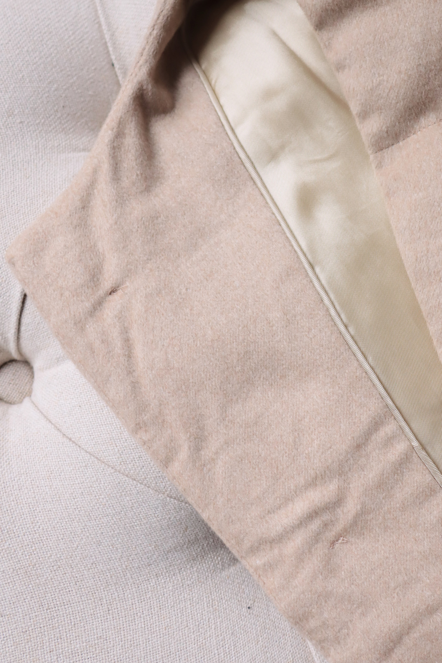 91.8% 綿羊毛 + 8.2% 桑蠶絲 / 內裡: 100% 黏纖 / 膽料: 100% 聚酯纖維 / 填充物: 95% 白鵝絨, Made in China
