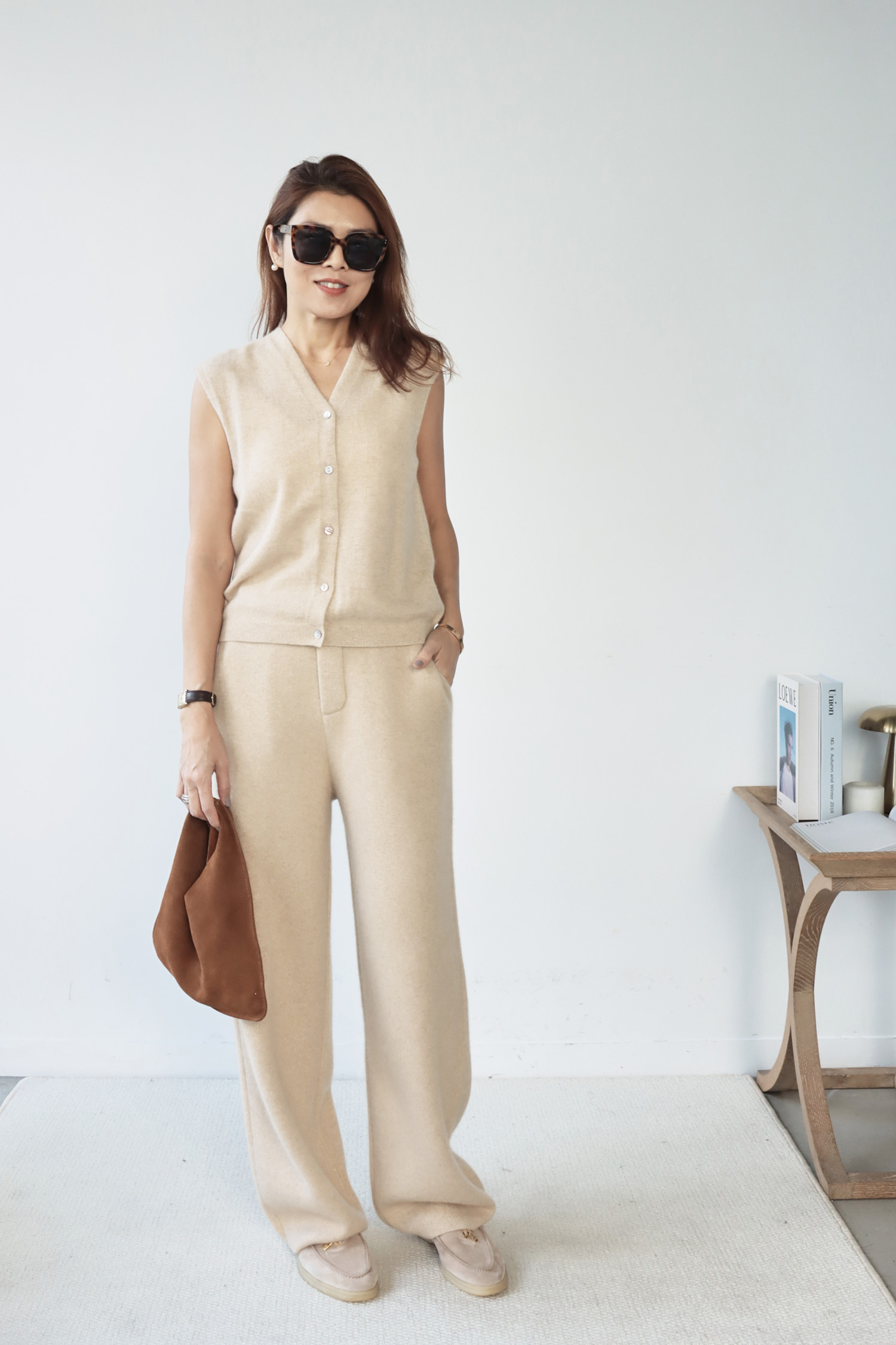 ・下身-100% Cashmere 厚磅羊絨直筒長褲—米