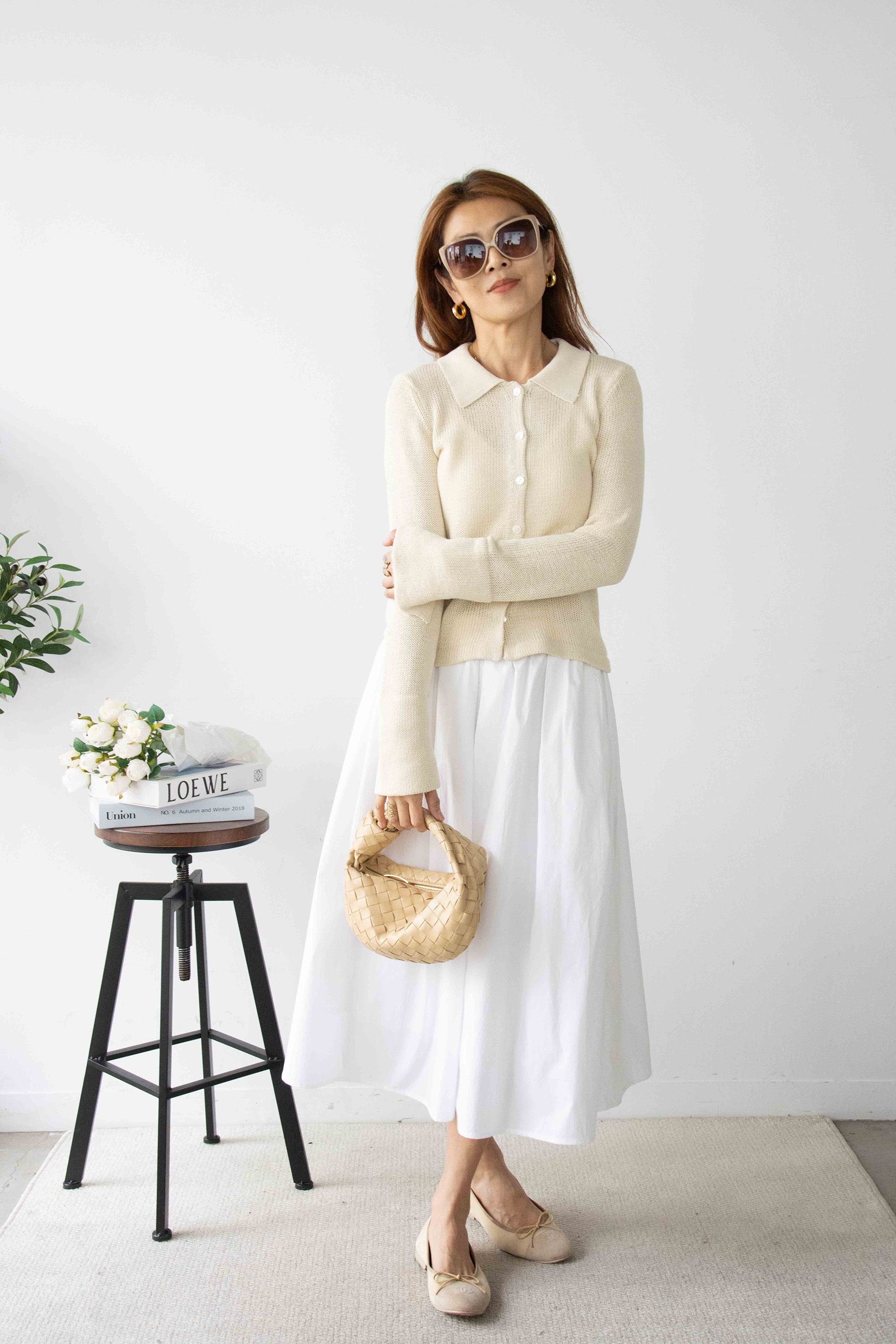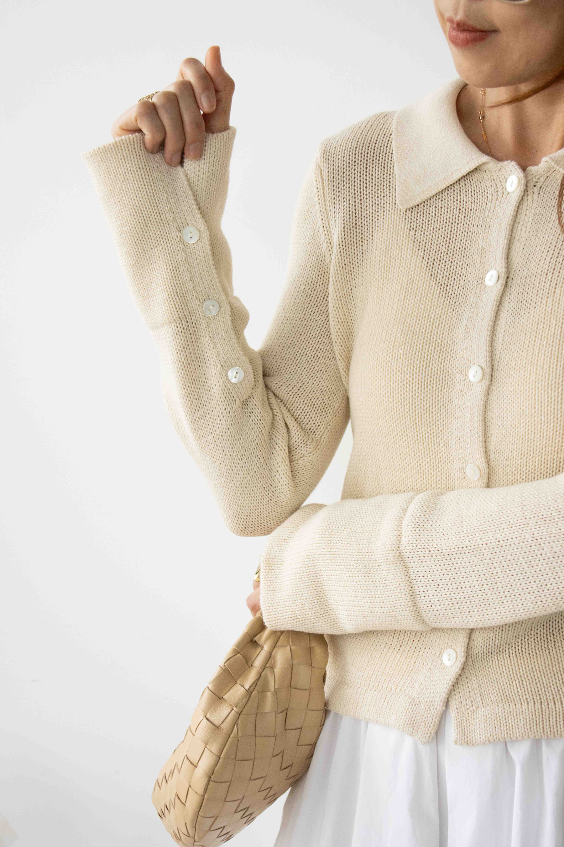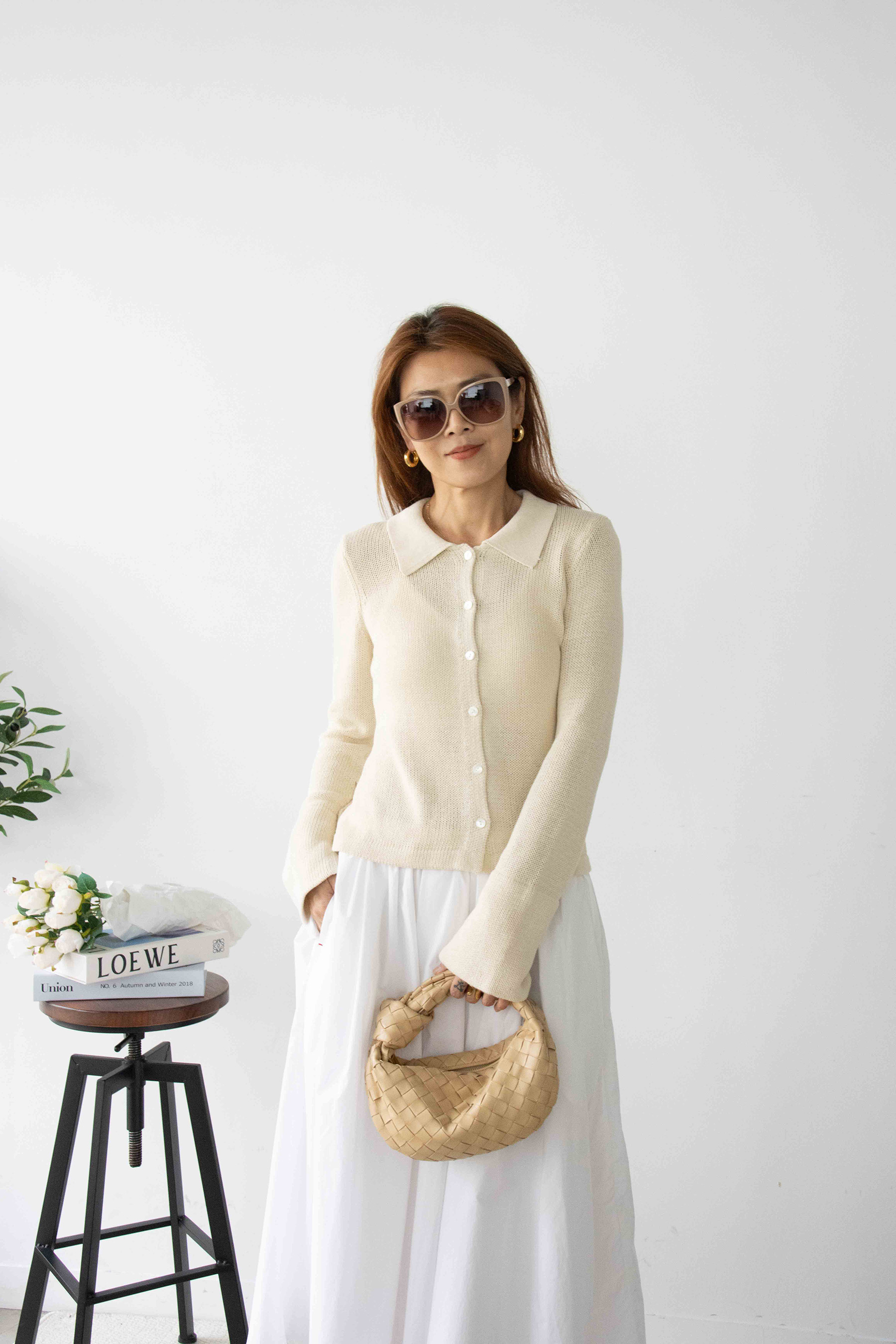 ・以棉感紗線織成,手感柔軟中帶點挺度,不會過於貼身,略帶空氣感的織紋,營造出微微透膚的層次效果。整排開襟設計可自由調整穿搭方式,單穿或作為外搭都合適,袖口採喇叭袖剪裁,並加入排釦細節可依喜好開合變化,提升穿搭靈活度。