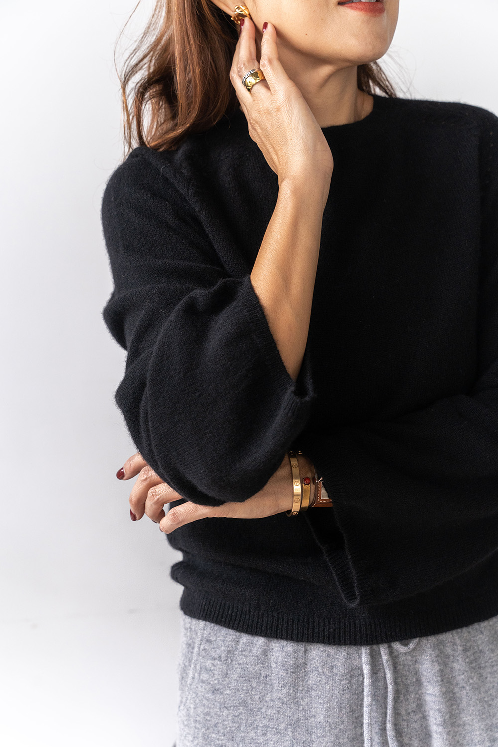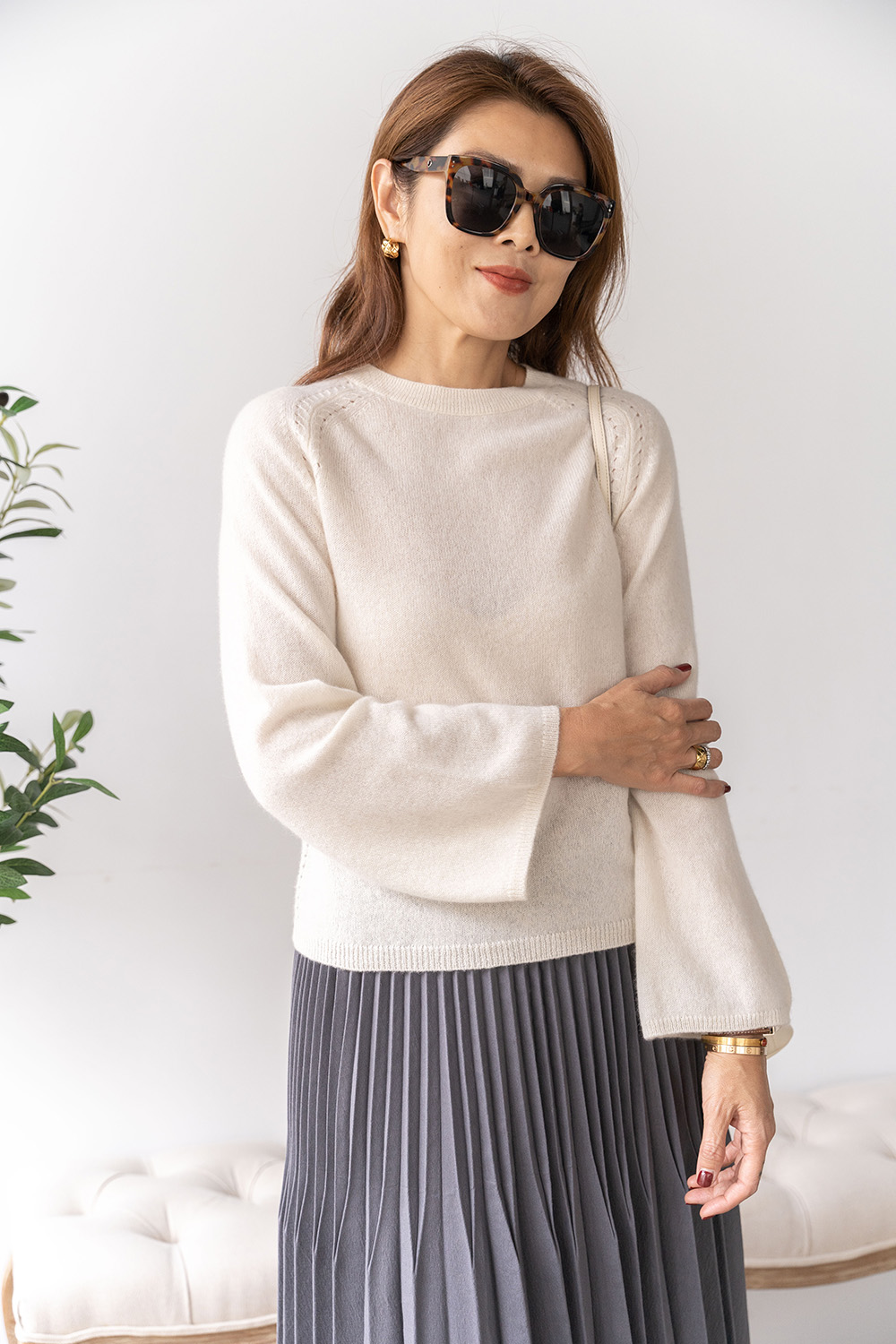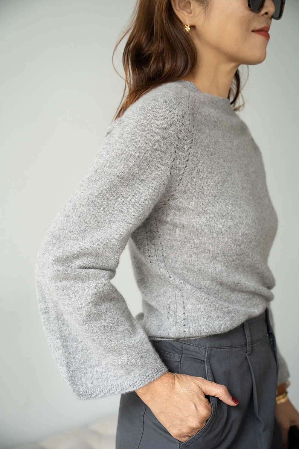 ・拉克蘭袖結合鐘型袖剪裁,貼合肩線同時袖口寬鬆,平衡身形比例