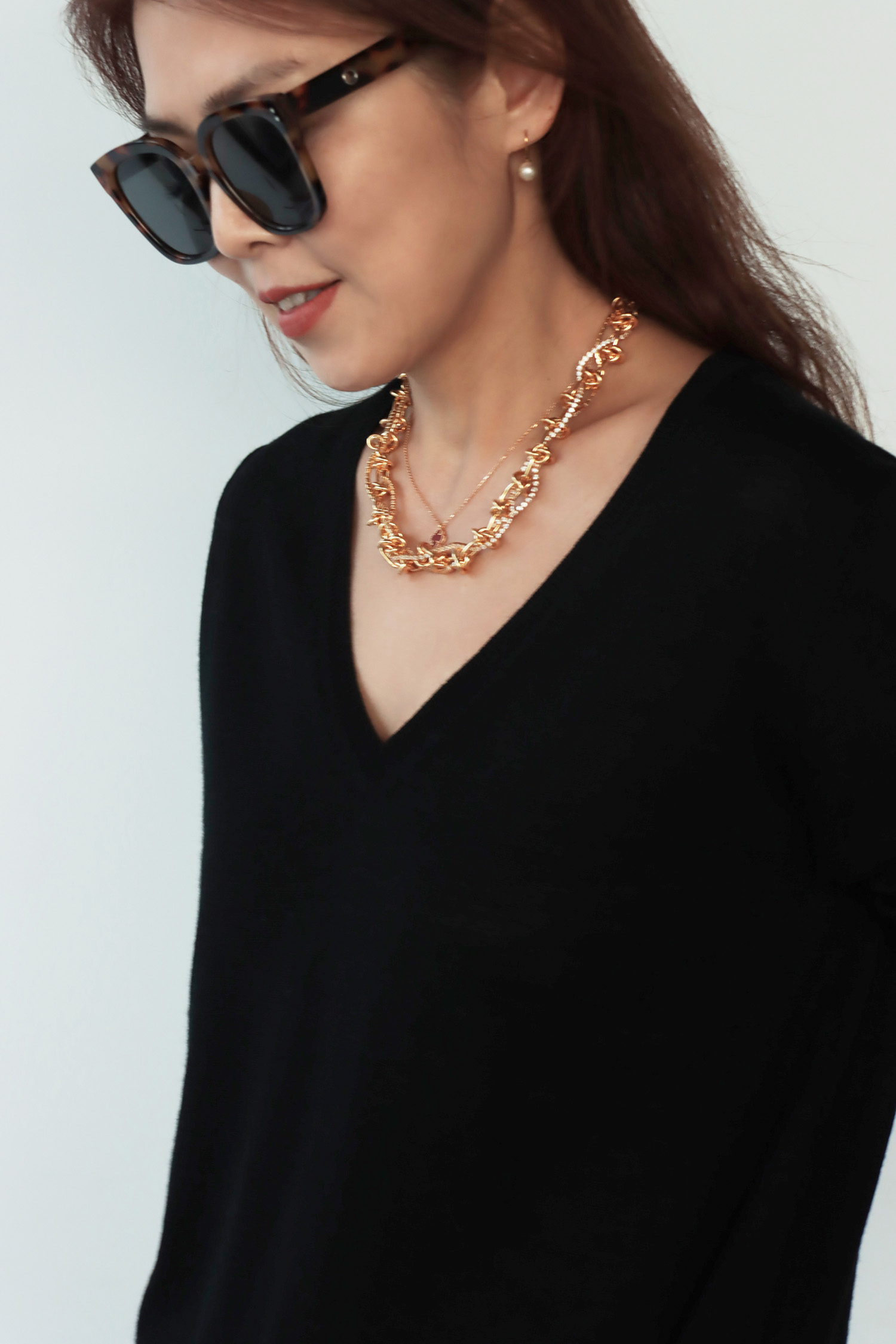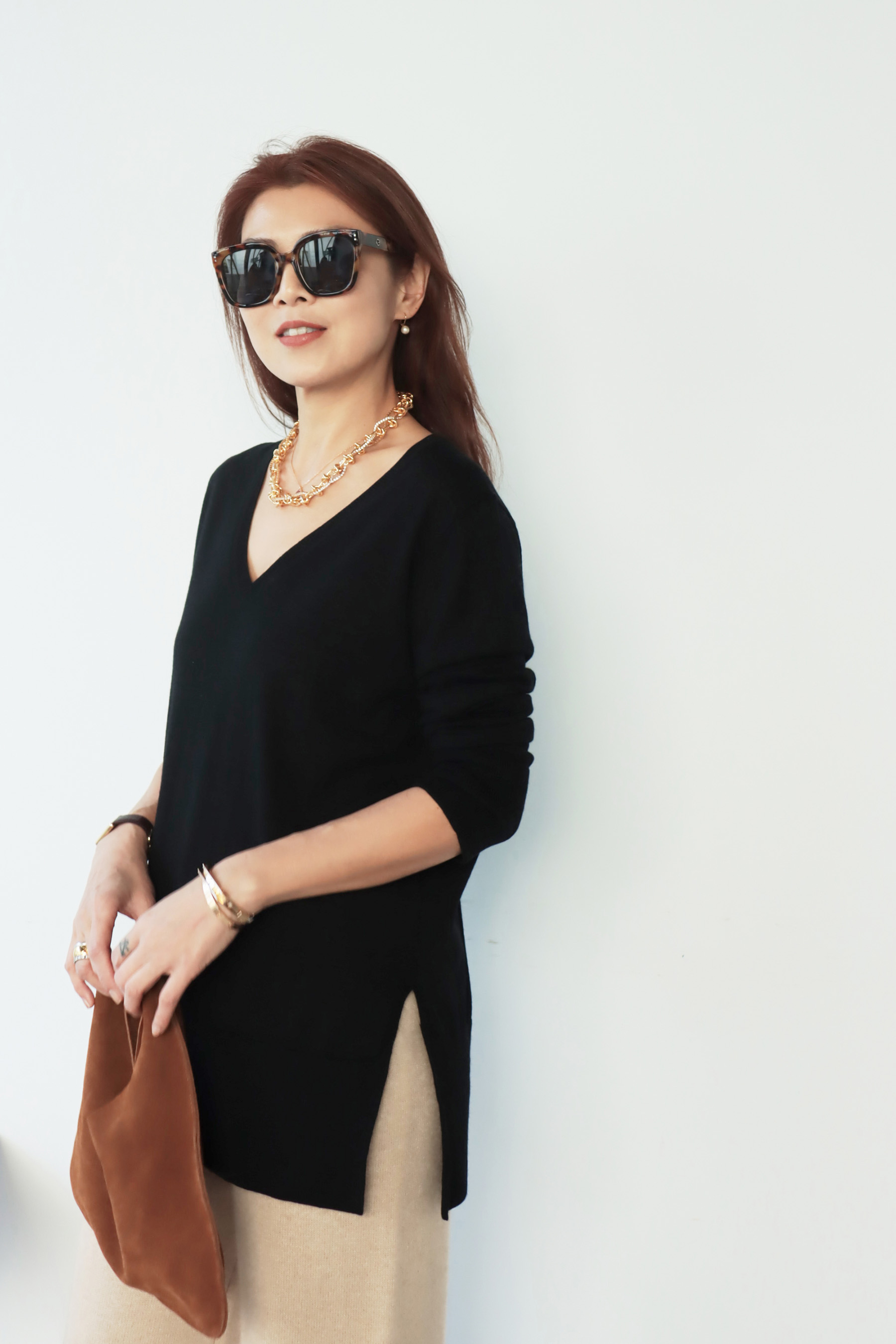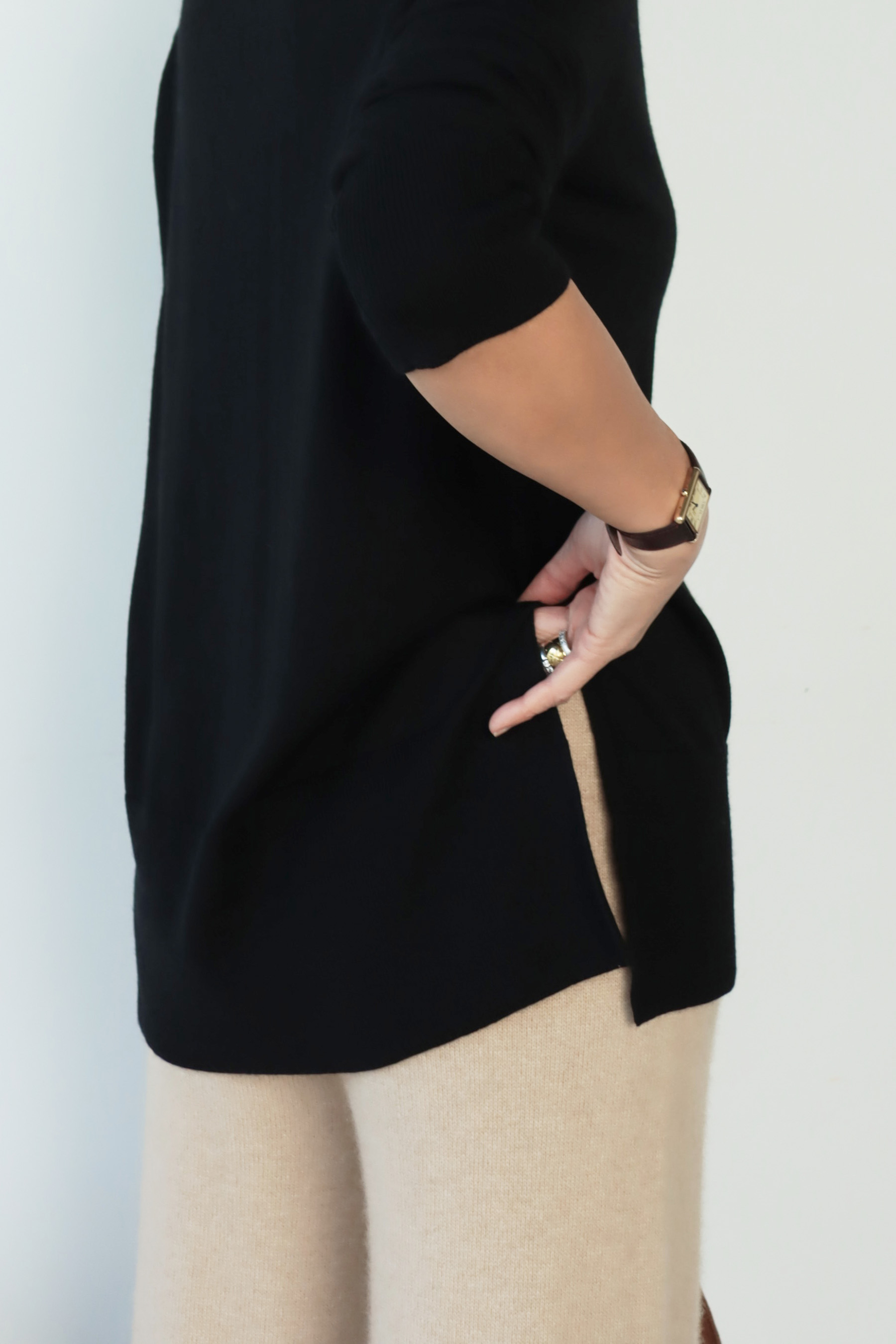 黑色V領寬鬆側開叉長版毛衣 01050052