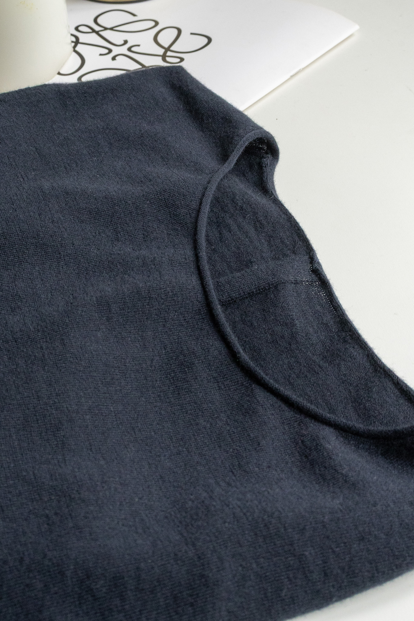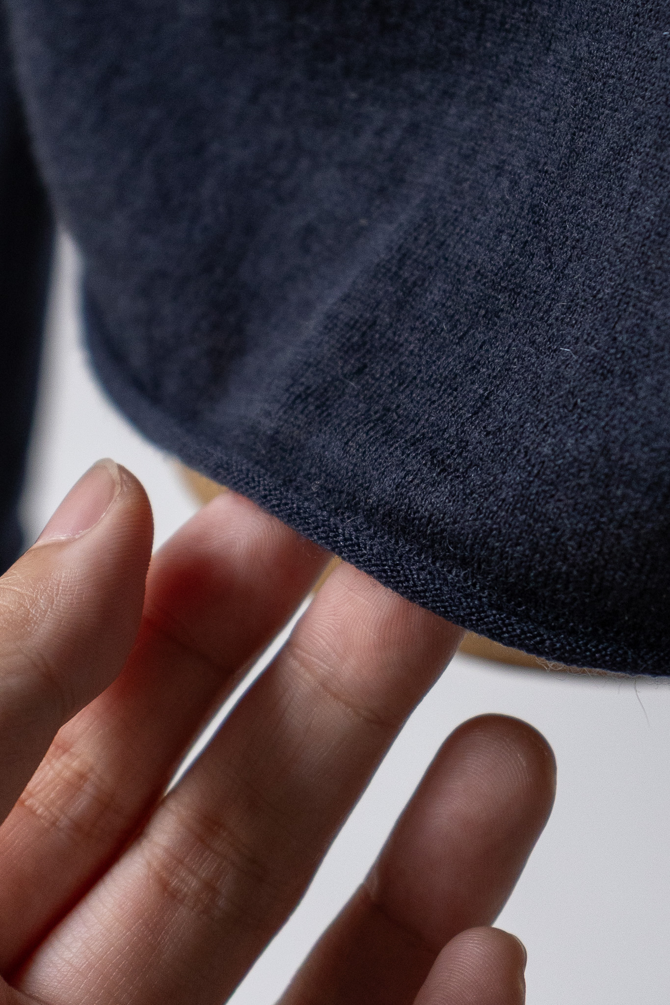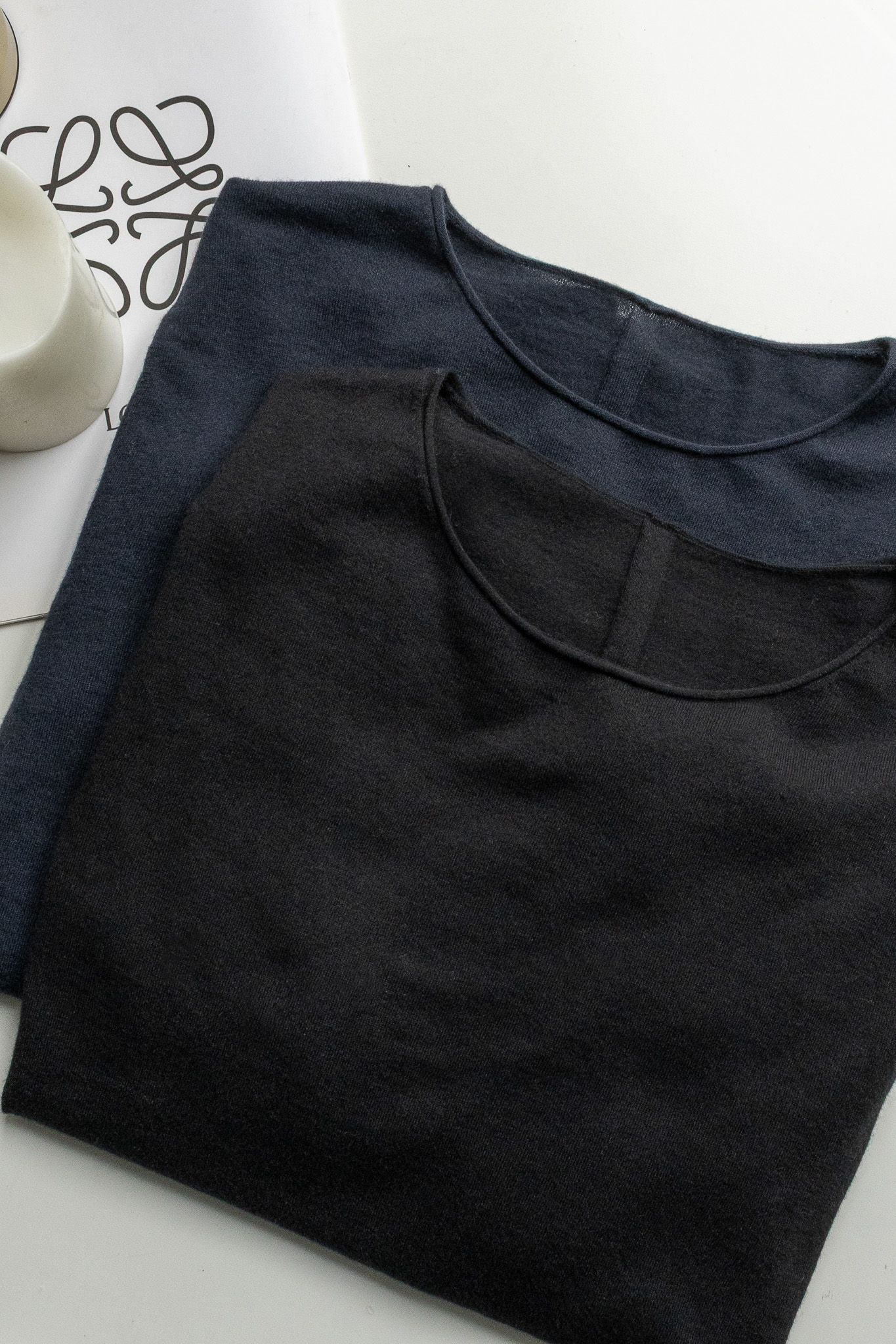 ・羊絨、聚酯纖維和雙蠶絲混合的內搭衣,特點會更加突出。羊絨帶來溫暖和柔軟的觸感,聚酯纖維則增加耐用度和抗皺性,而雙蠶絲則讓面料更加輕盈、光滑且透氣。因此,這種混合材質的內搭衣不僅舒適保暖,還能保持良好的垂感和高雅的光澤,非常適合在不同場合穿著,