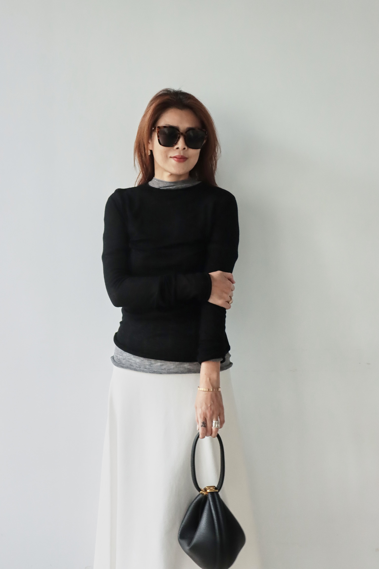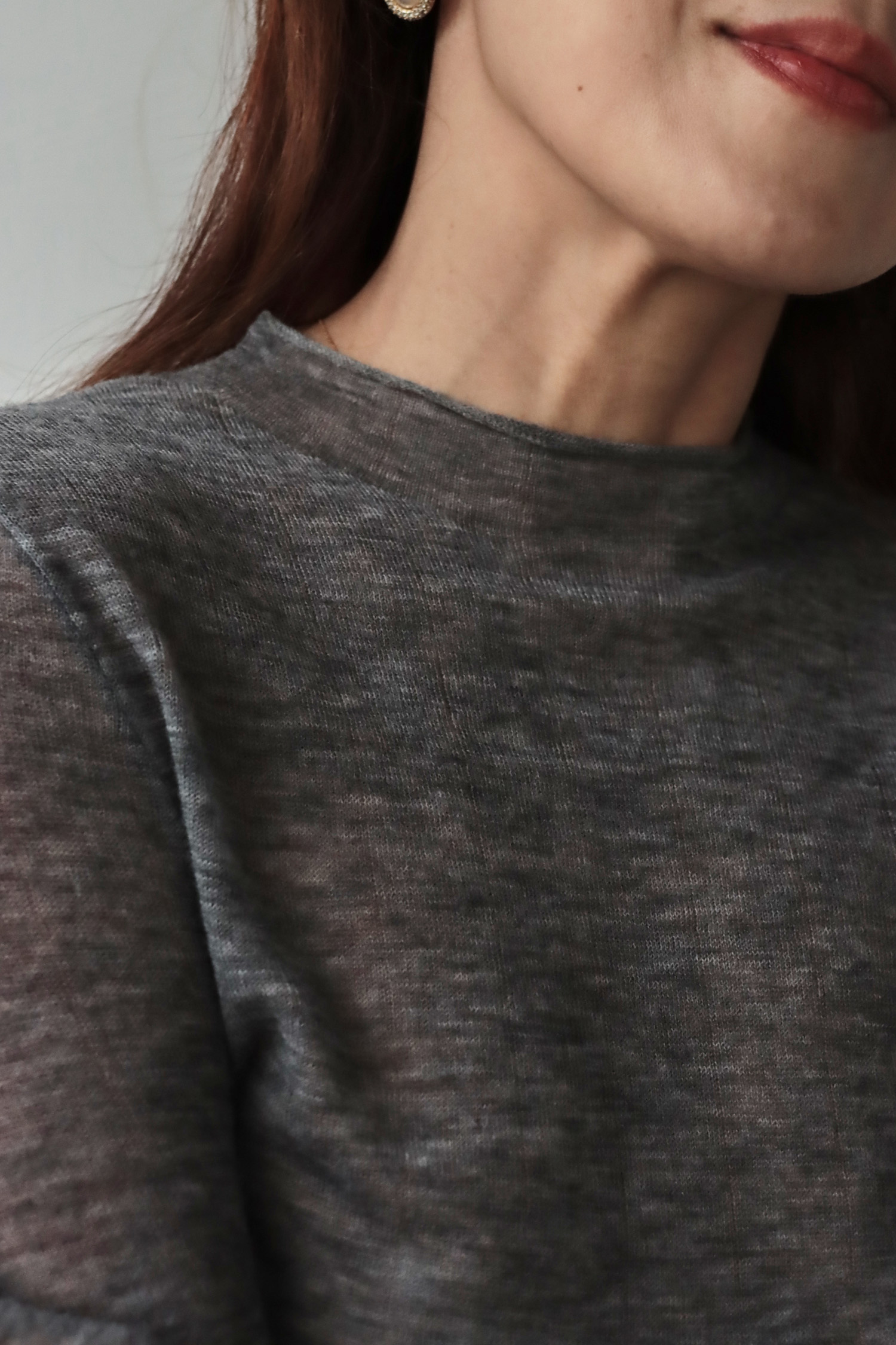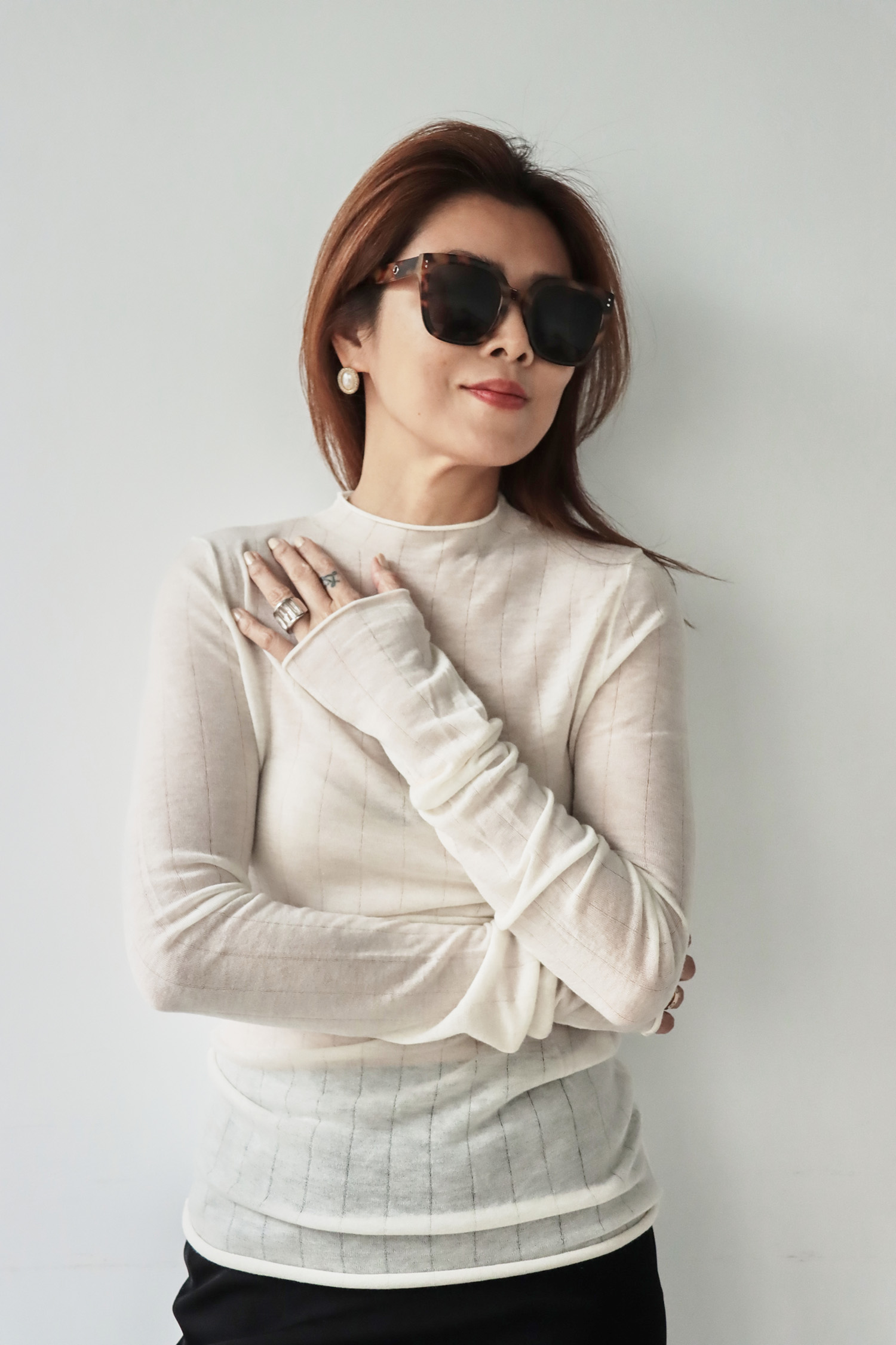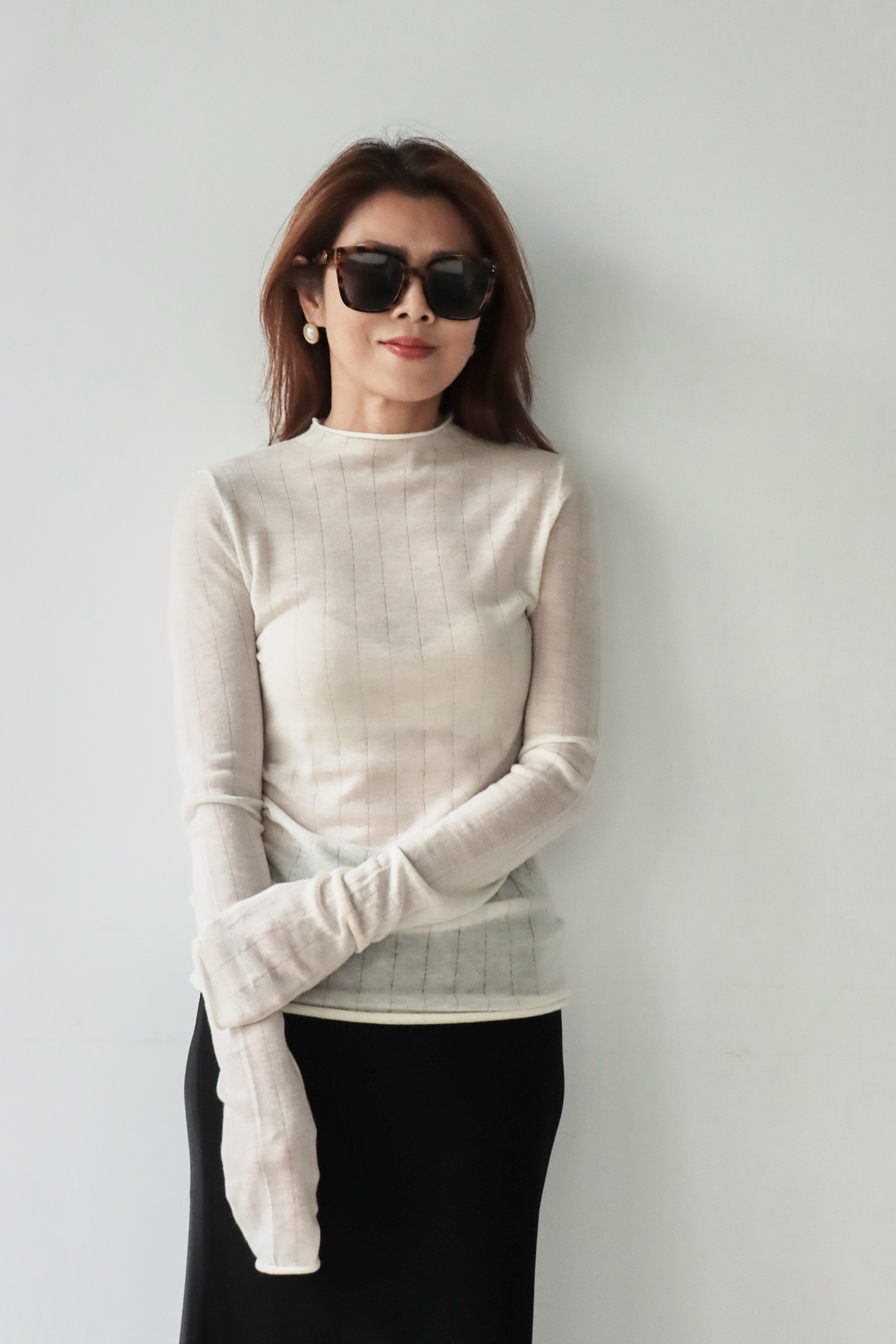 ・選用100%羊毛紗線,透過細緻薄織工藝呈現輕盈清透的質地,觸感柔軟親膚,整體輕薄不厚重,適合作為多層次穿搭的基礎單品。面料表層融入簍空壓紋細節,低調形成立體紋理,使清透布面更具層次變化;小高圓領設計,在保留包覆度的同時拉長頸部線條,展現內斂而俐落的輪廓;袖長加長並以捲邊收尾,自然堆疊出隨興線條,增添柔和而細緻的造型感,讓打底穿搭不無聊。