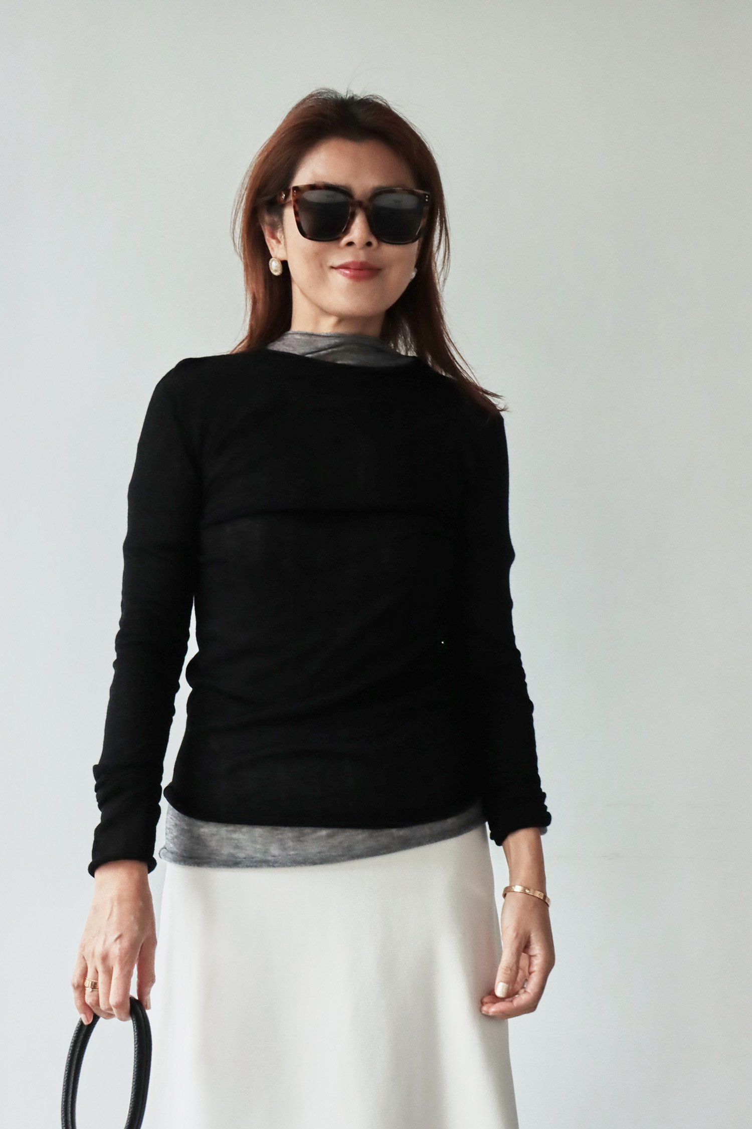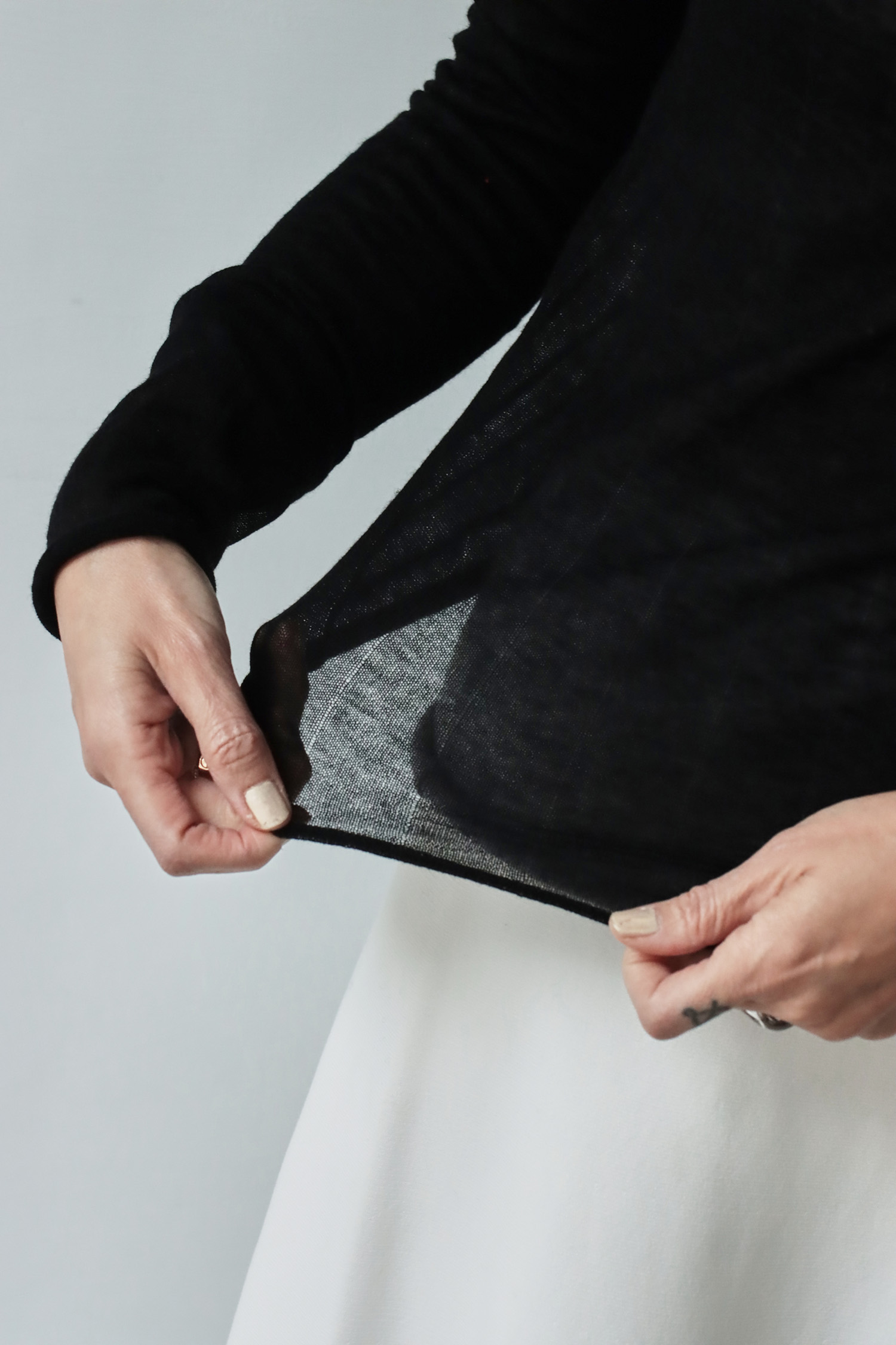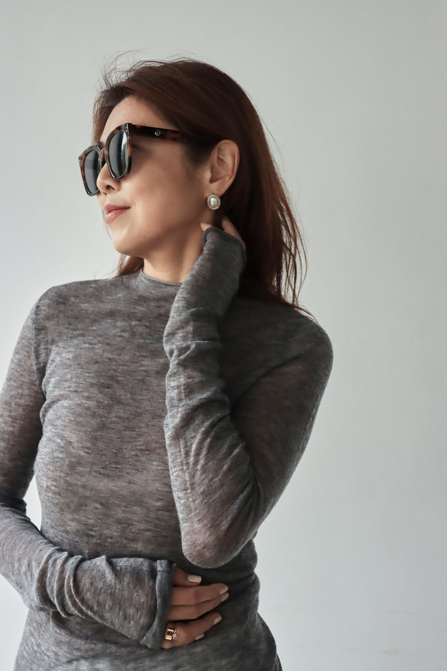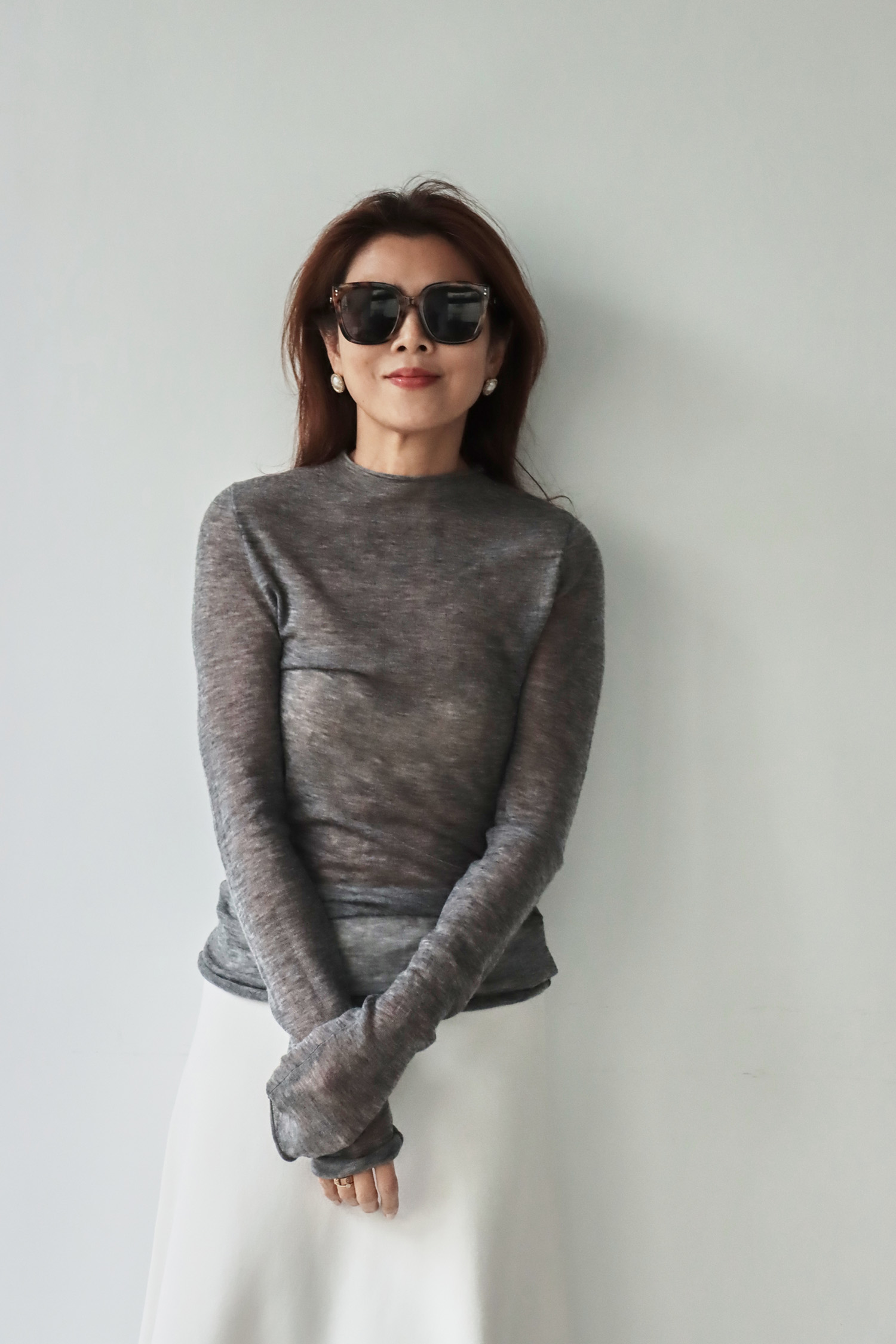・選用100%羊毛紗線,透過細緻薄織工藝呈現輕盈清透的質地,觸感柔軟親膚,整體輕薄不厚重,適合作為多層次穿搭的基礎單品。面料表層融入簍空壓紋細節,低調形成立體紋理,使清透布面更具層次變化;小高圓領設計,在保留包覆度的同時拉長頸部線條,展現內斂而俐落的輪廓;袖長加長並以捲邊收尾,自然堆疊出隨興線條,增添柔和而細緻的造型感,讓打底穿搭不無聊。