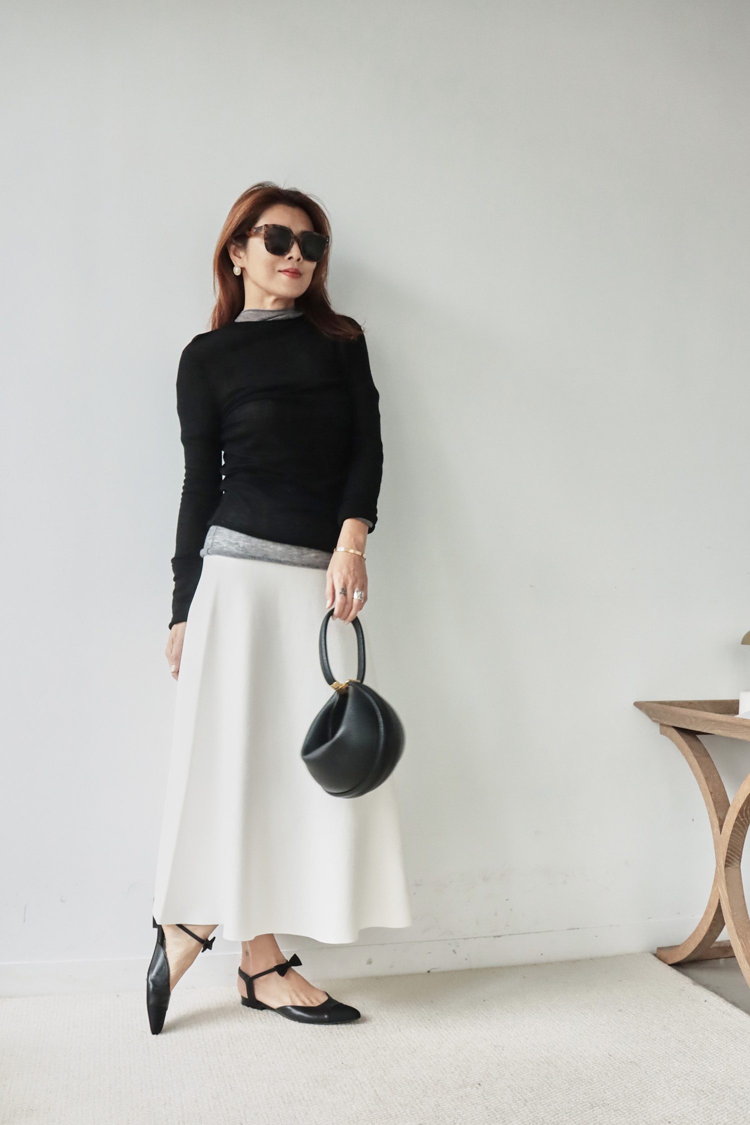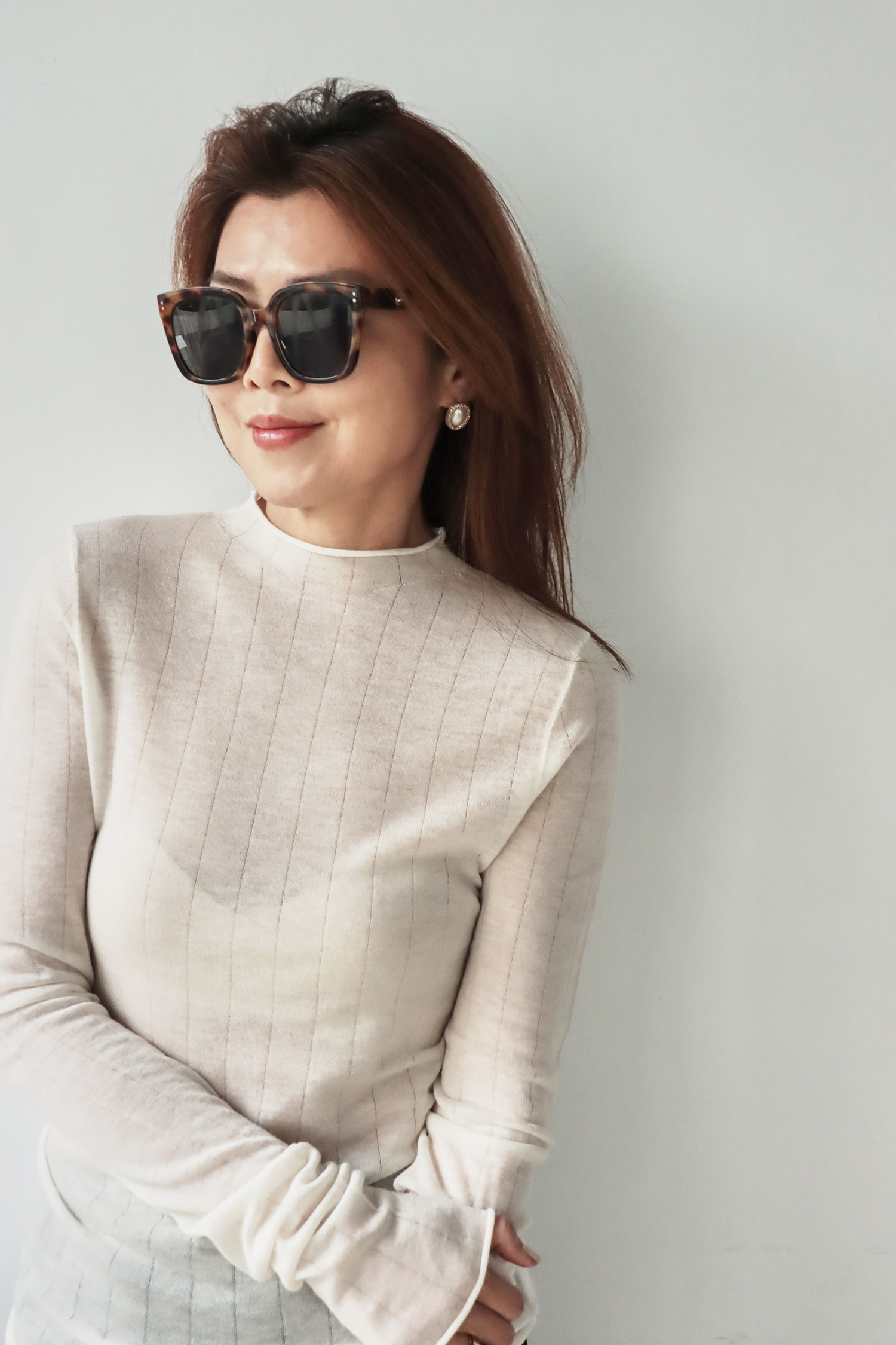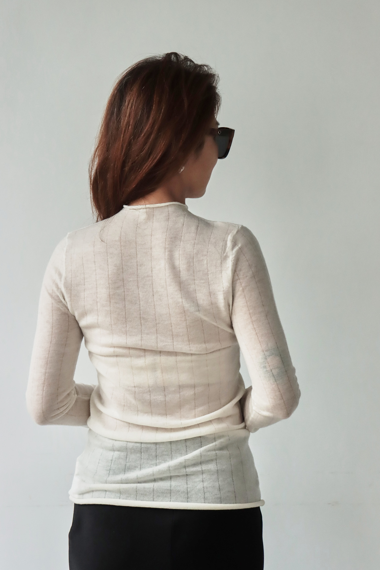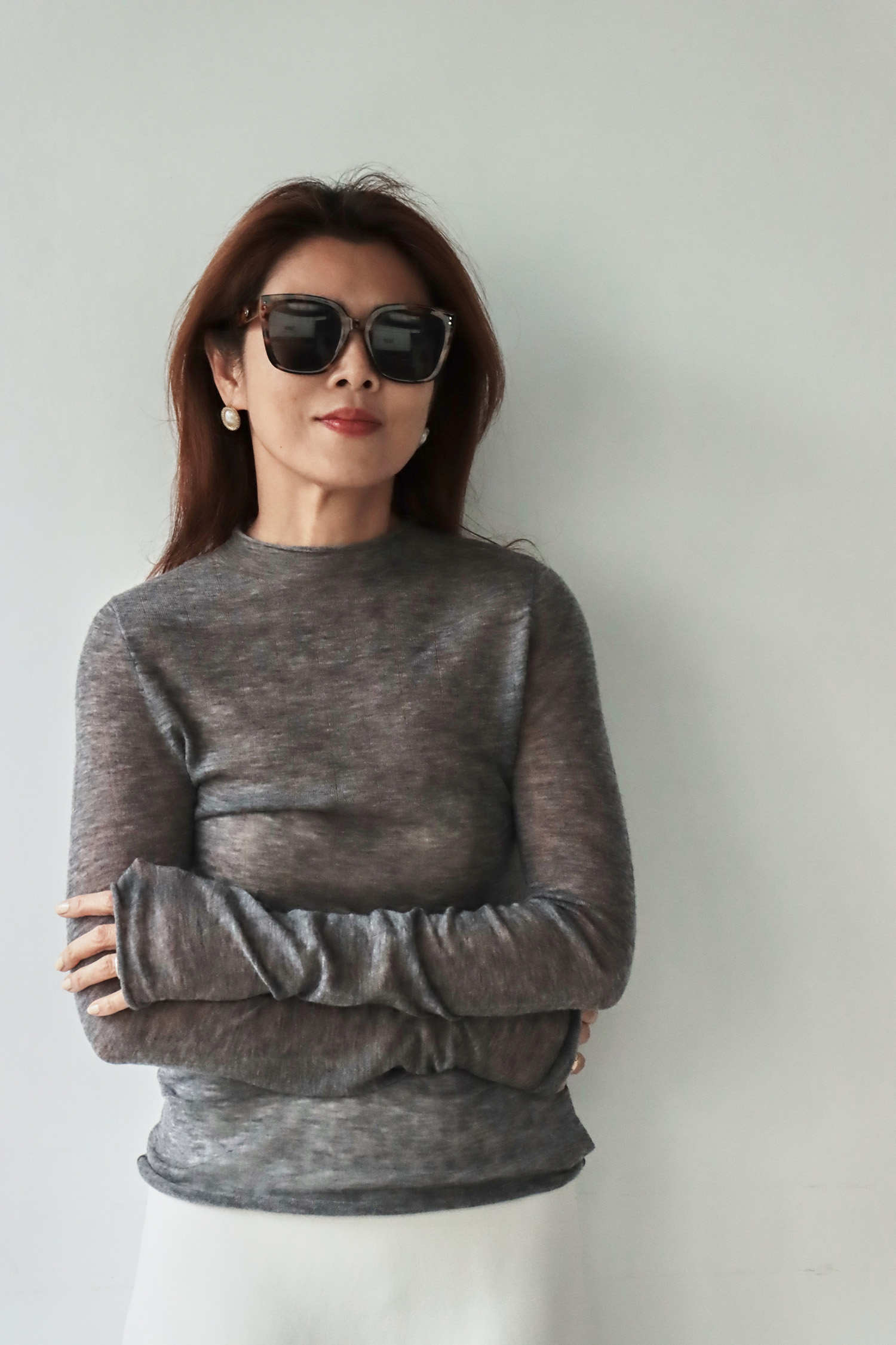 ・選用100%羊毛紗線,透過細緻薄織工藝呈現輕盈清透的質地,觸感柔軟親膚,整體輕薄不厚重,適合作為多層次穿搭的基礎單品。面料表層融入簍空壓紋細節,低調形成立體紋理,使清透布面更具層次變化;小高圓領設計,在保留包覆度的同時拉長頸部線條,展現內斂而俐落的輪廓;袖長加長並以捲邊收尾,自然堆疊出隨興線條,增添柔和而細緻的造型感,讓打底穿搭不無聊。