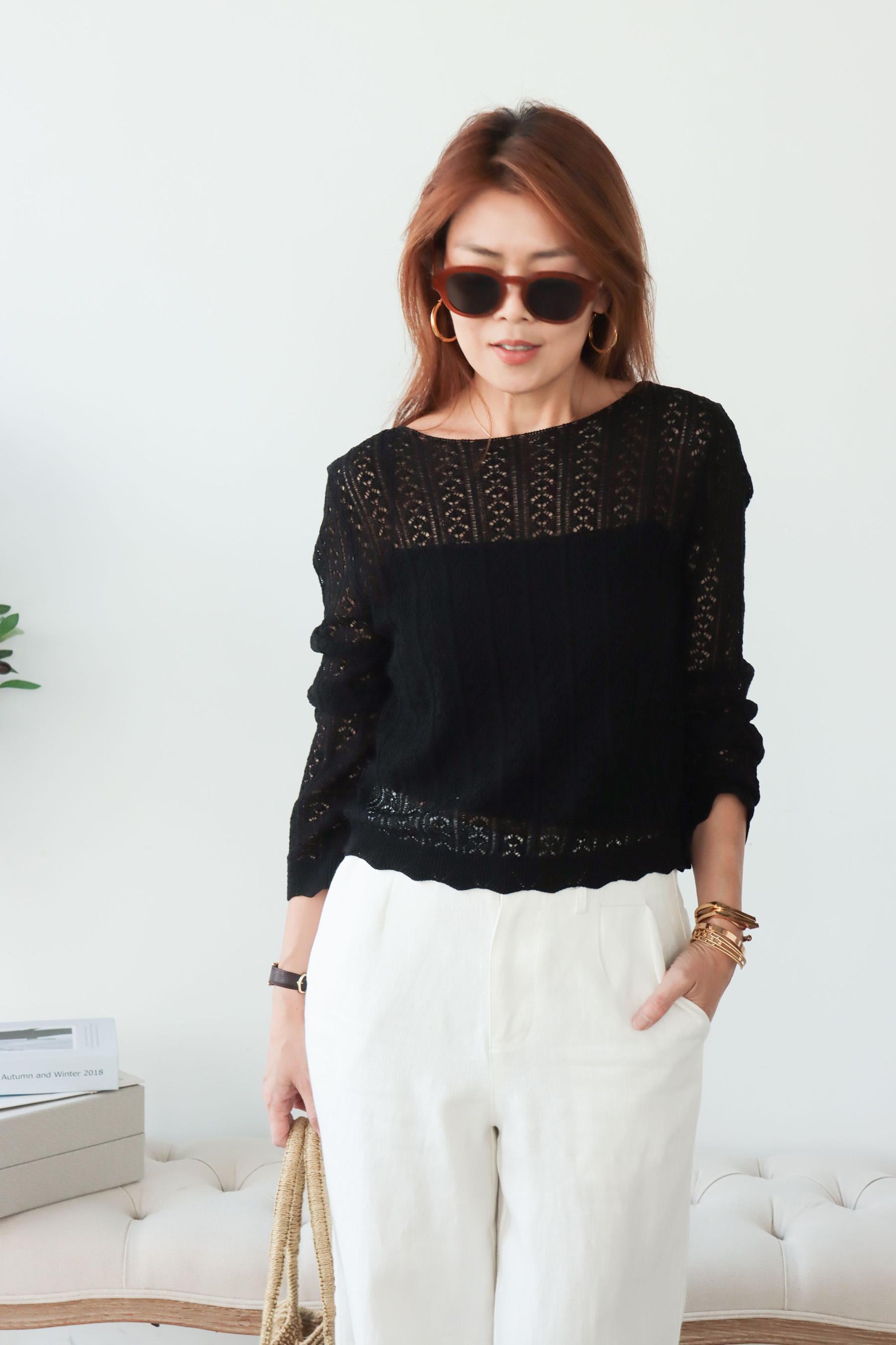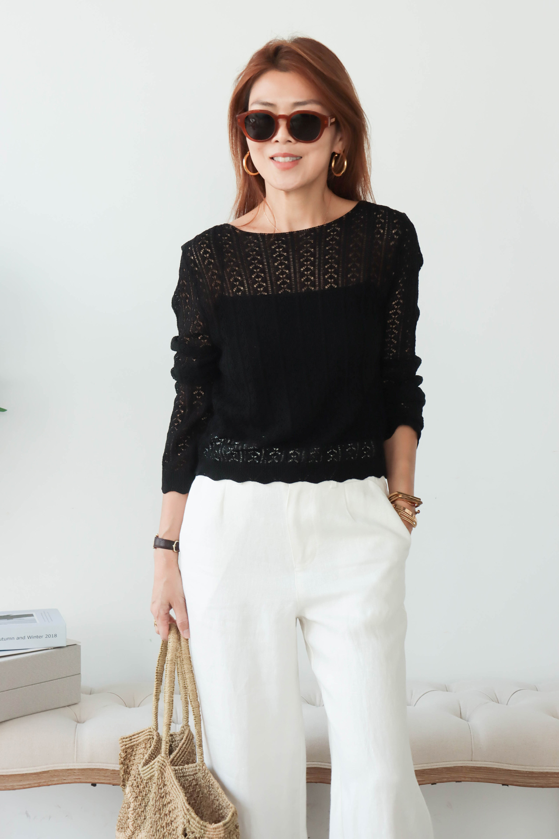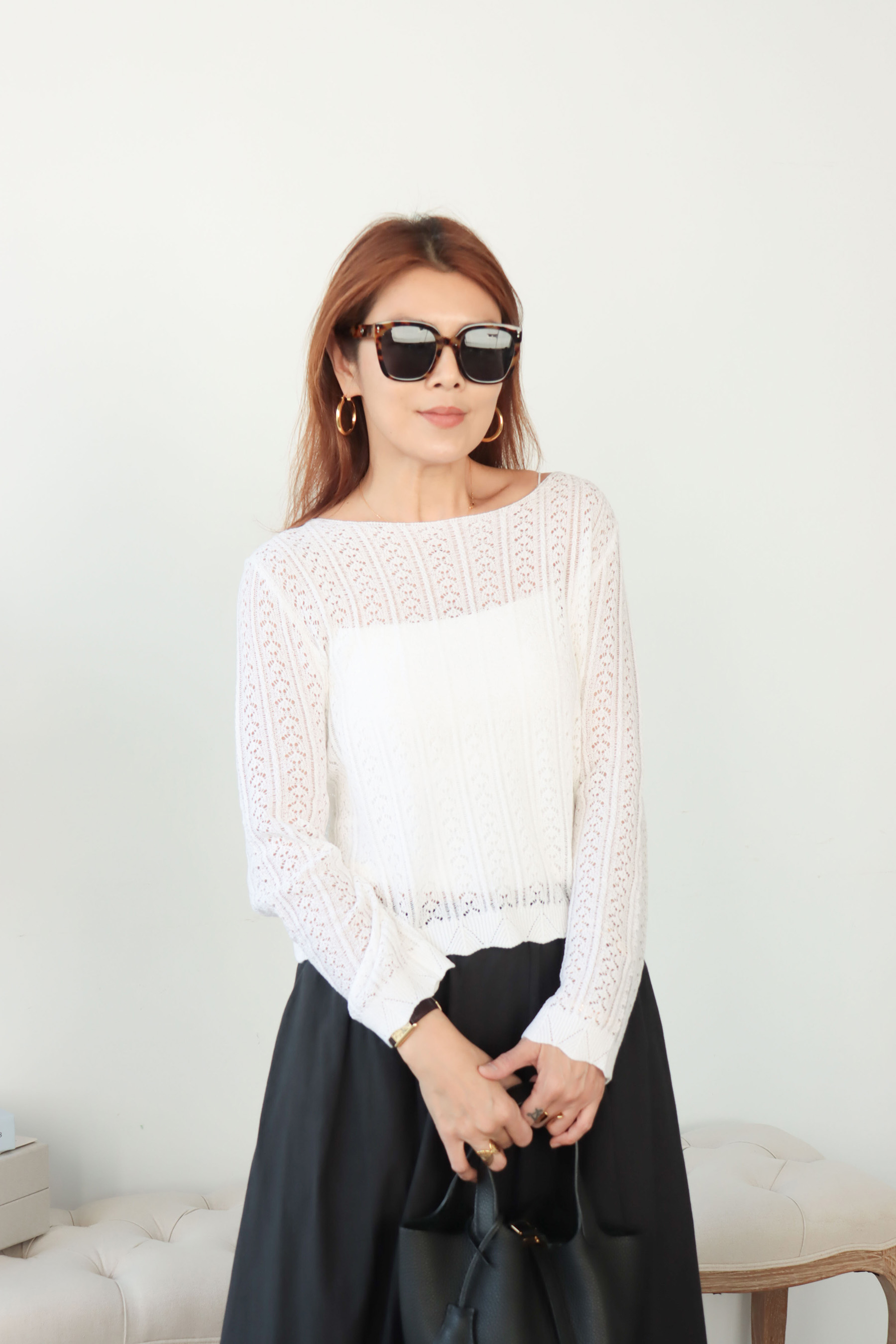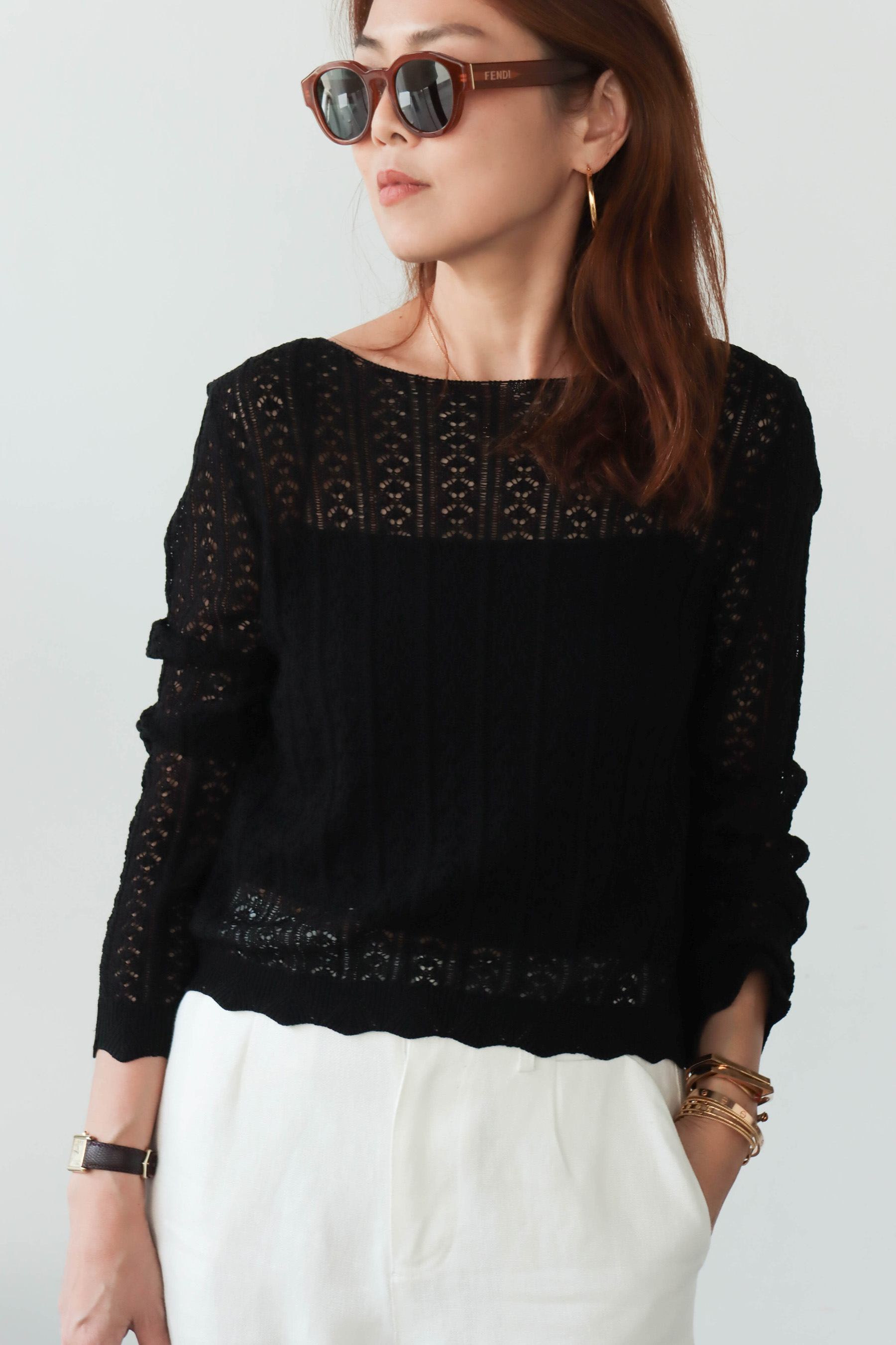 ・面料揉合柔滑與微挺特性,觸感親膚細膩,帶有自然的乾爽與透氣感,穿著時輕盈不悶,並隱約保有立體支撐度,使整體輪廓更顯精緻。船領設計優雅展露鎖骨線條,搭配細緻蕾絲鏤空,營造若隱若現的透膚美感,下擺與袖口以波浪狀收邊增添柔和律動,呈現輕盈且富有層次的質感,讓整體在甜美與氣質之間取得恰到好處的平衡。