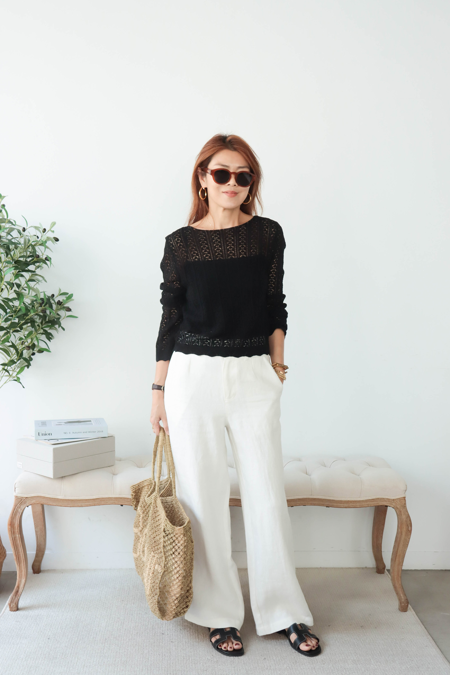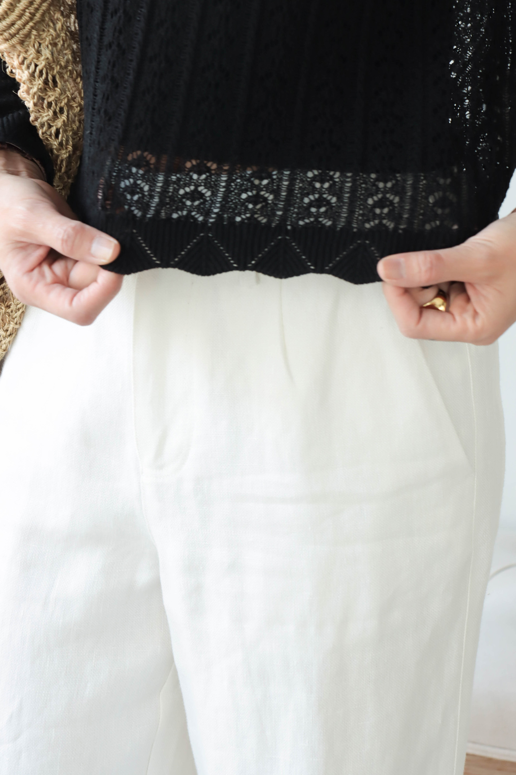 ・下身-亞麻弧形口袋直筒小寬褲—米白