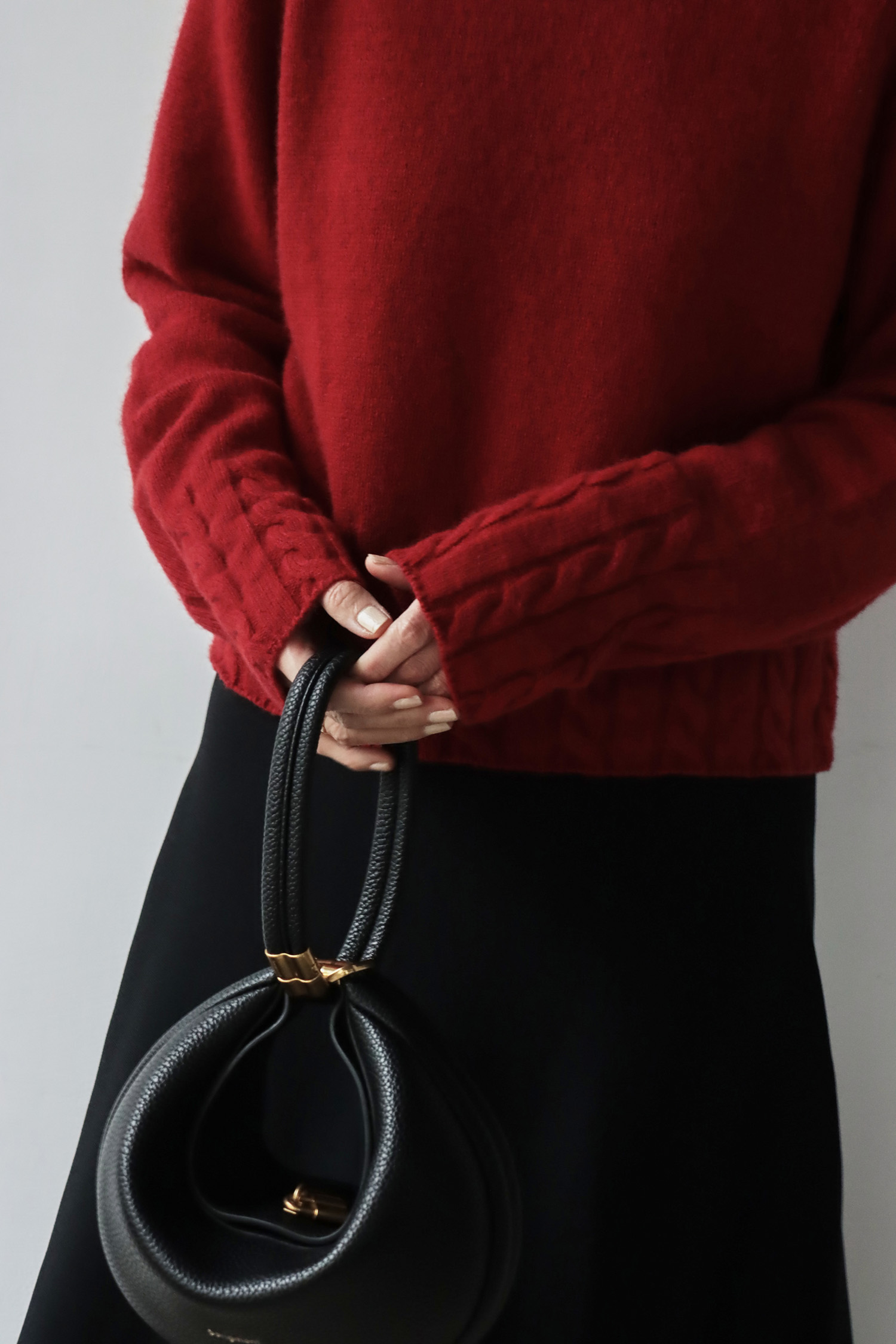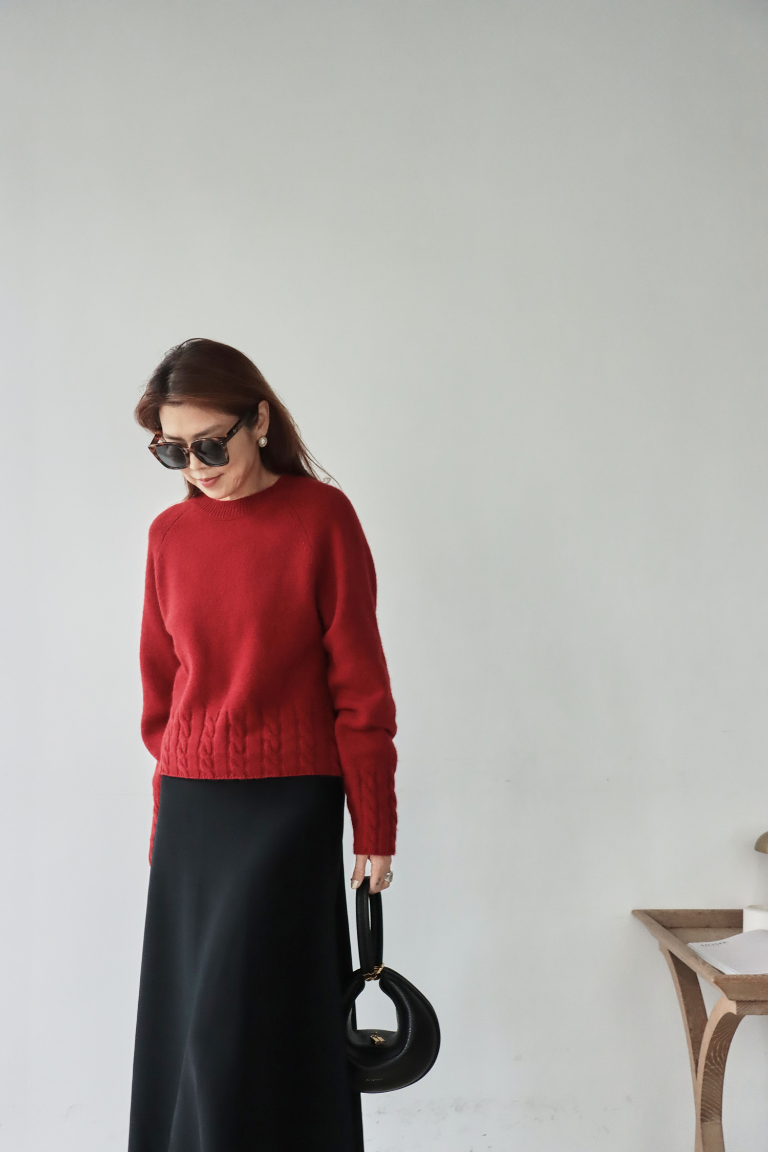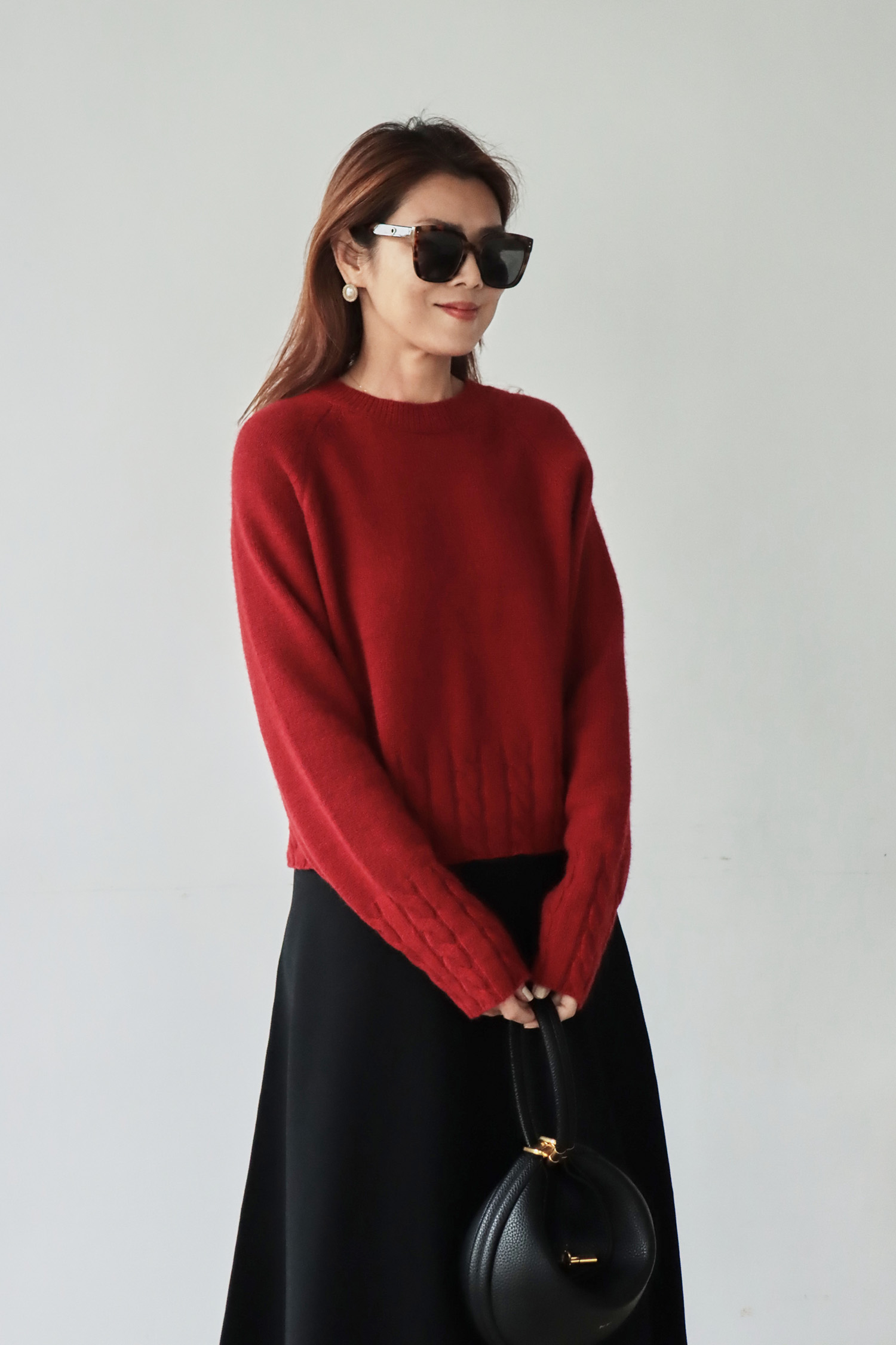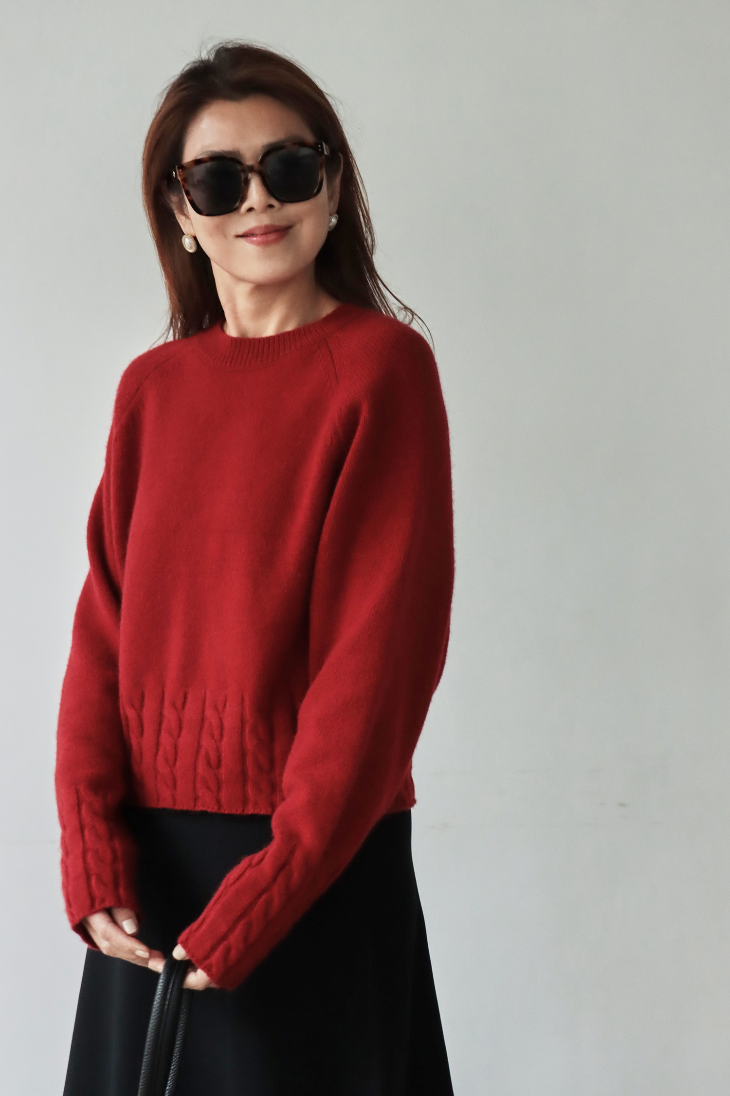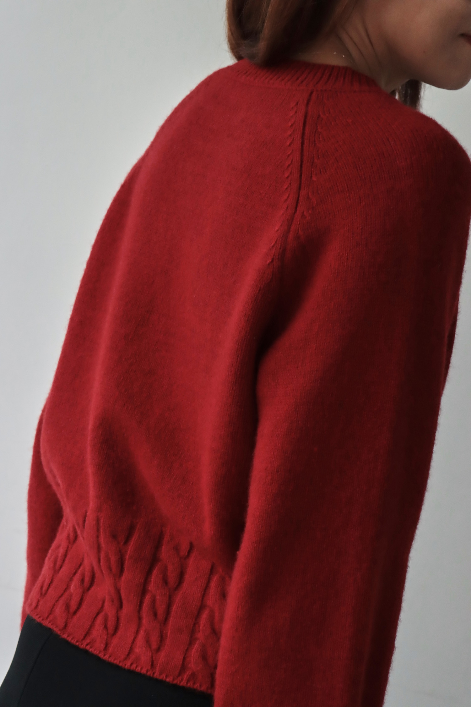 ・選用高含量羊毛結合少量羊絨的混紡紗線,兼具良好的保暖度與吸濕性,觸感細膩柔軟,親膚舒適不刺癢,面料中加入棉綸,提升耐磨度與穩定性,讓整體更加耐穿、好照顧。短版鬆身廓型巧妙拉長身形比例,不顯臃腫,穿著時俐落有型,結合拉克蘭袖使肩線自然順著手臂垂落,營造鬆軟且流暢的垂墜感;下擺與袖口以立體麻花織紋點綴,為簡約輪廓增添層次與豐富手感,輕鬆展現溫柔又具質感的風格。