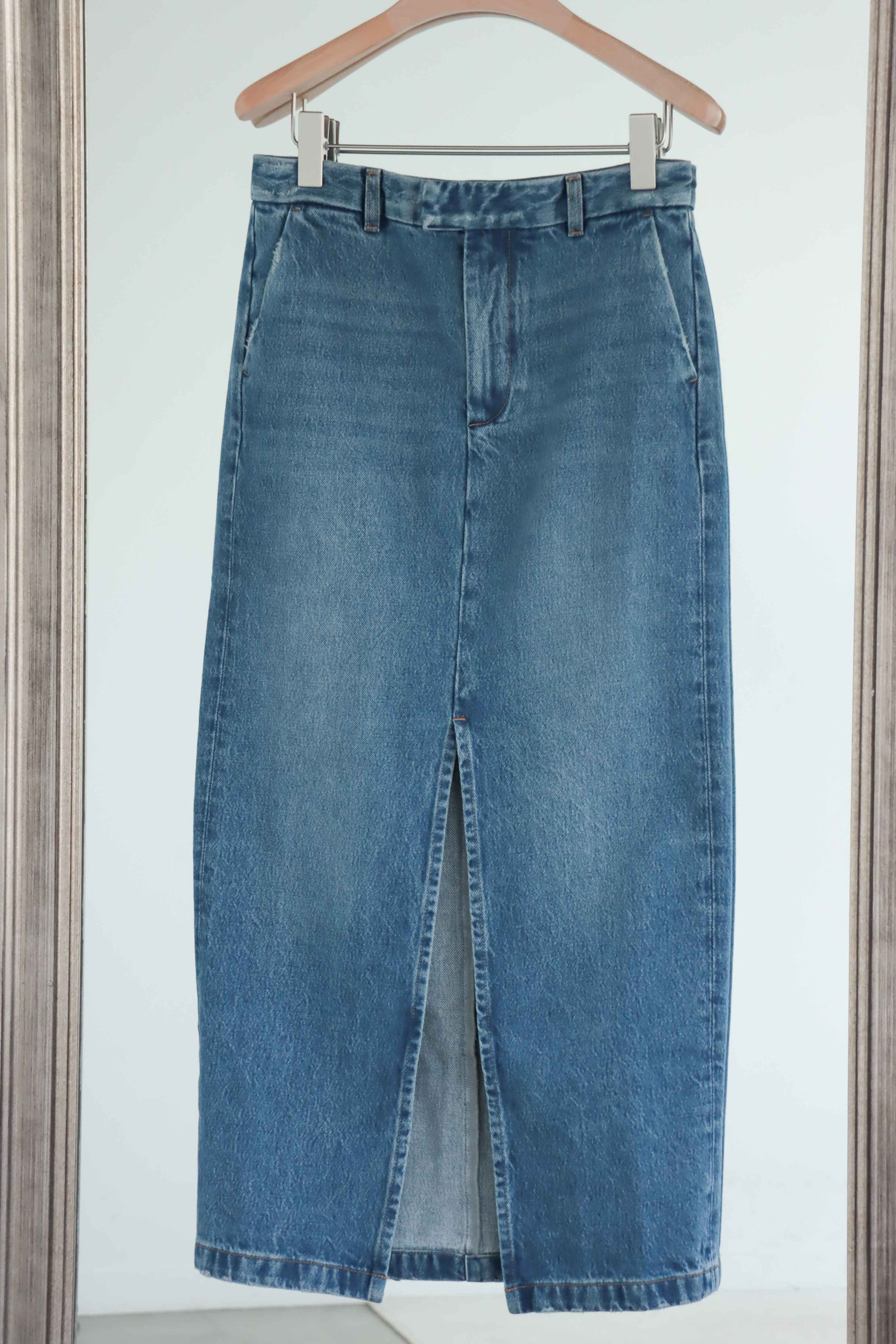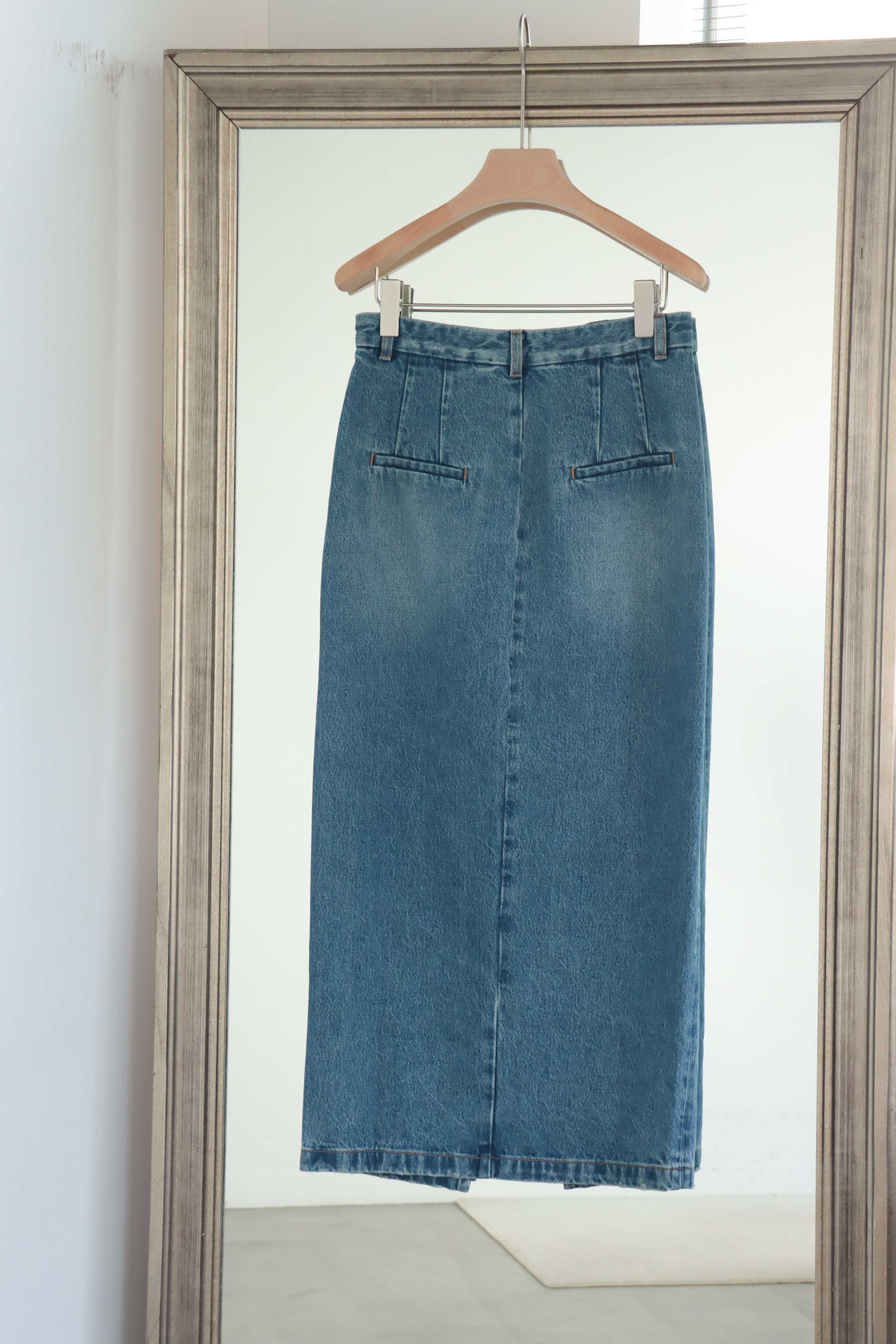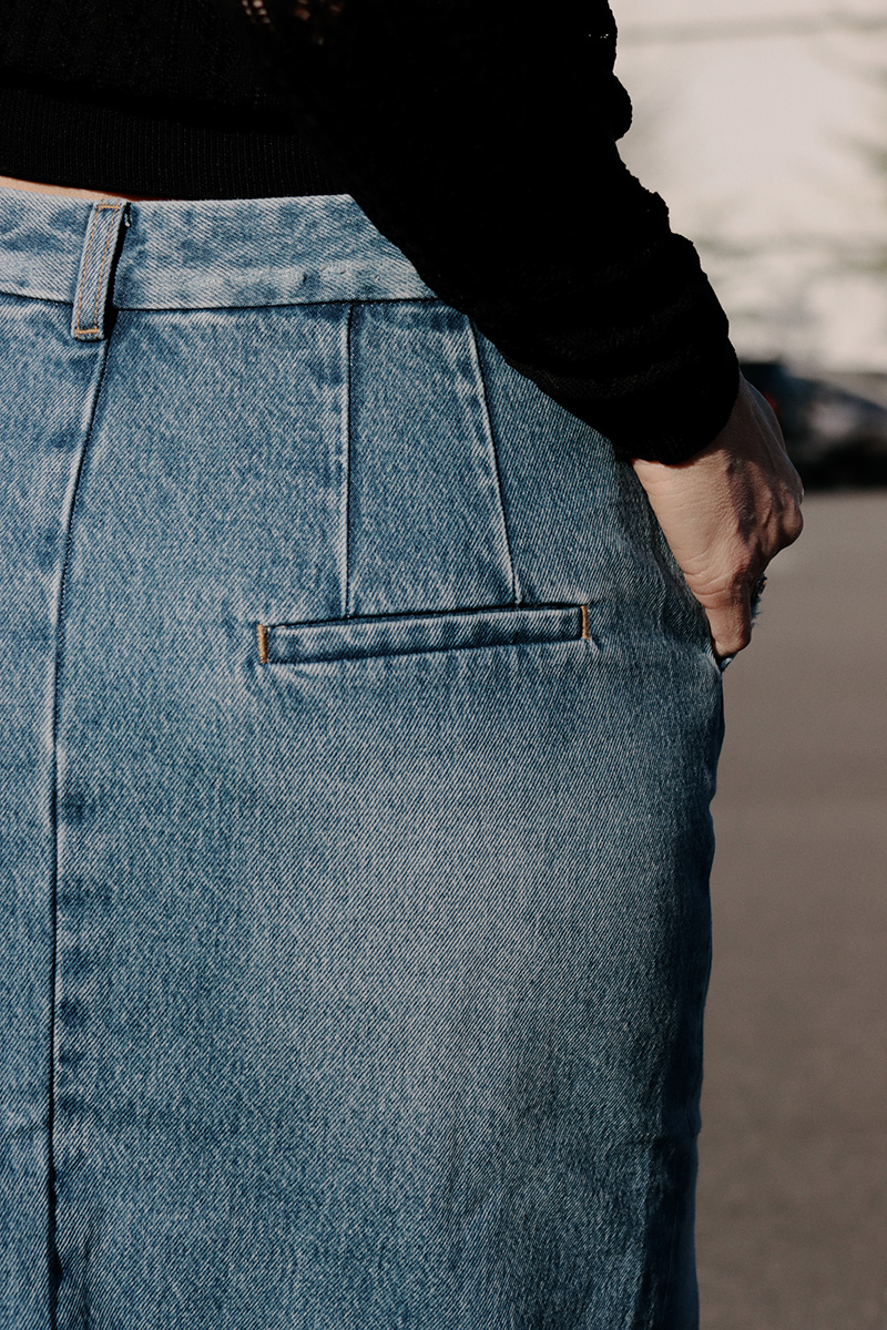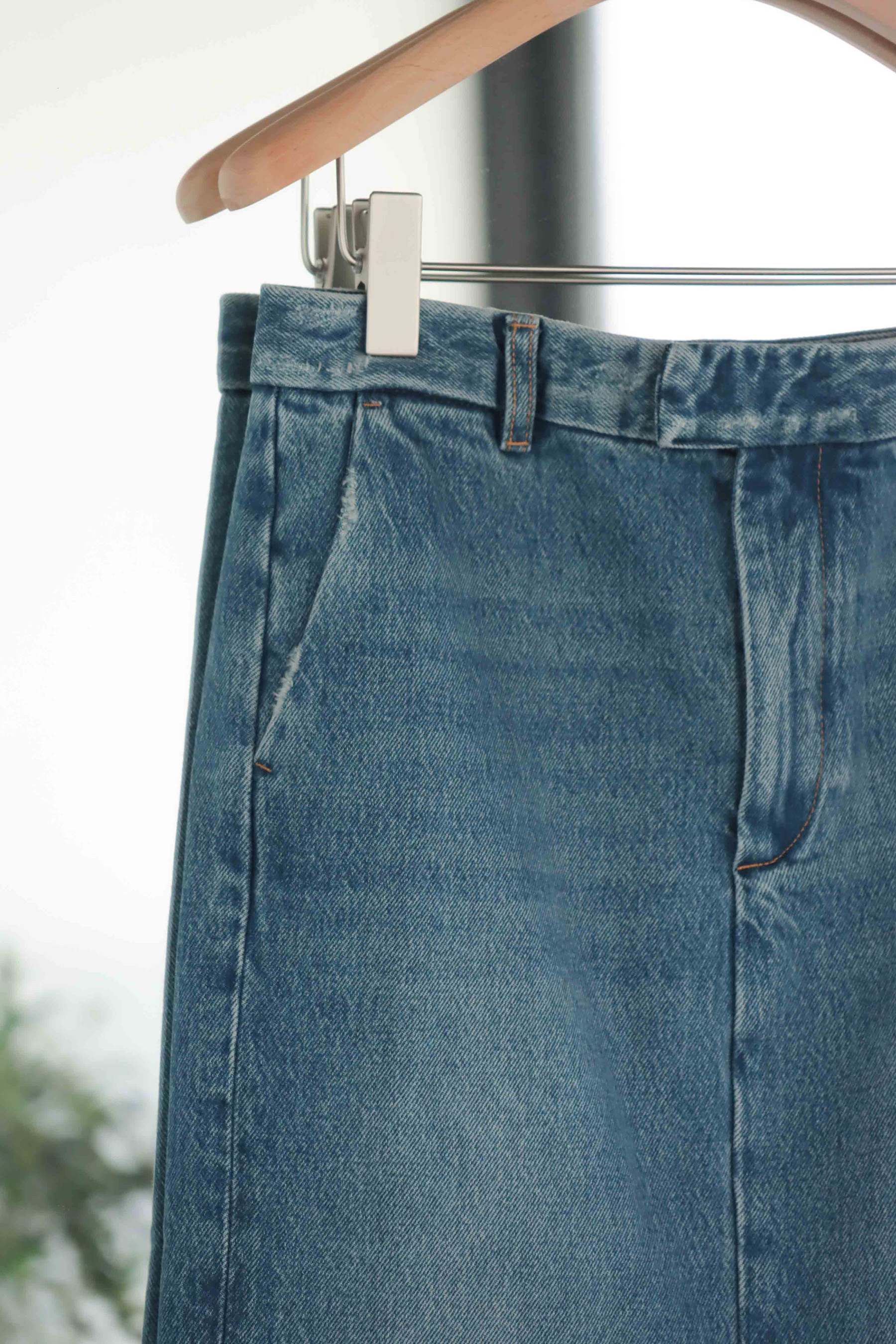・使用100% 純棉單寧面料製作,布料兼具自然挺度與柔軟度,穿著舒適且耐穿。直筒裙型搭配前開岔設計,修飾腿部線條同時提升行走時的活動度,腰頭加入刷破細節,為經典丹寧增添隨性感,隱藏釦設計讓外觀更加簡潔俐落;後臀唇袋上方以雙縫線剪裁加強立體輪廓,帶來自然提臀視覺效果,身形比例更顯修長。