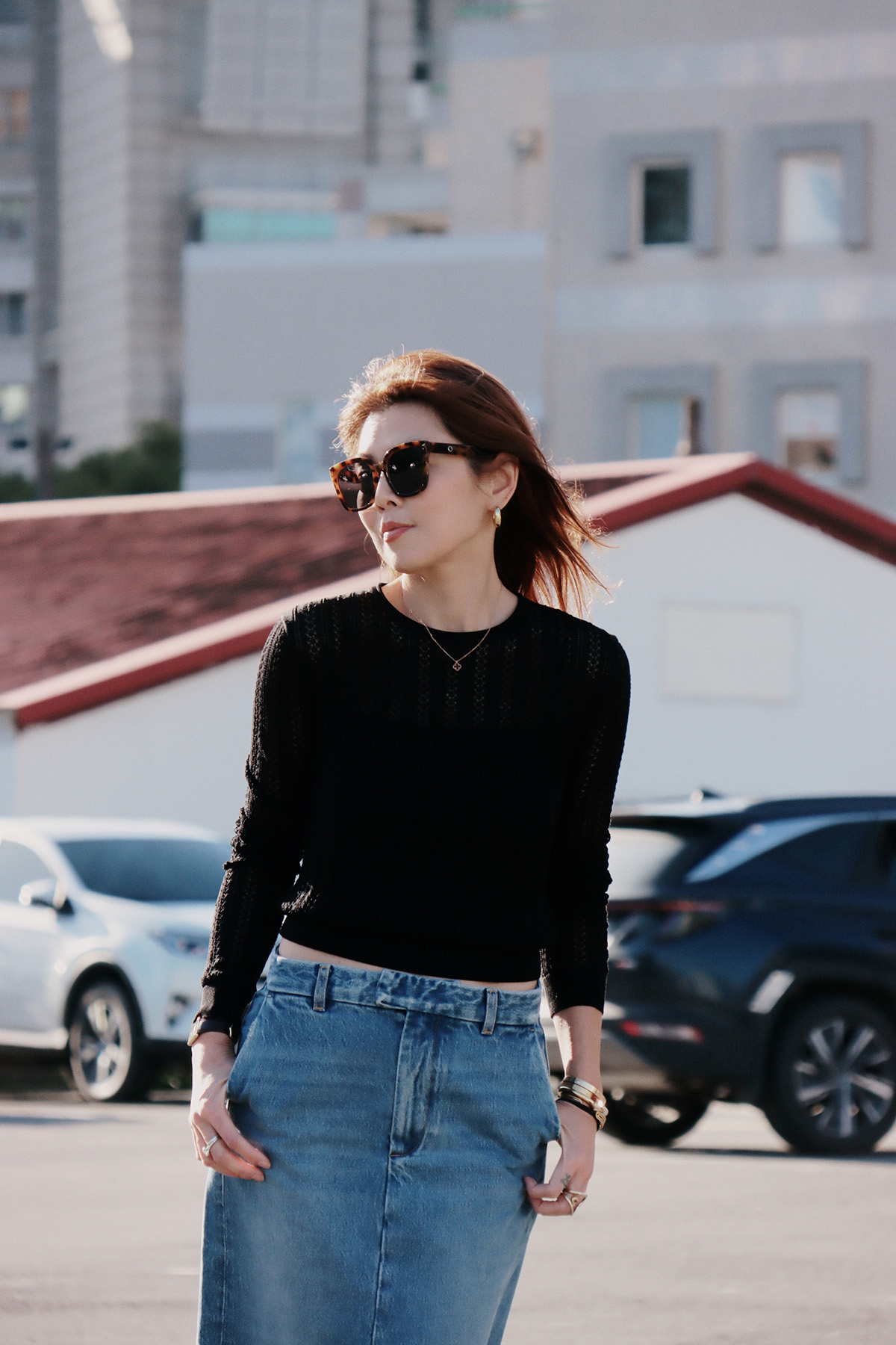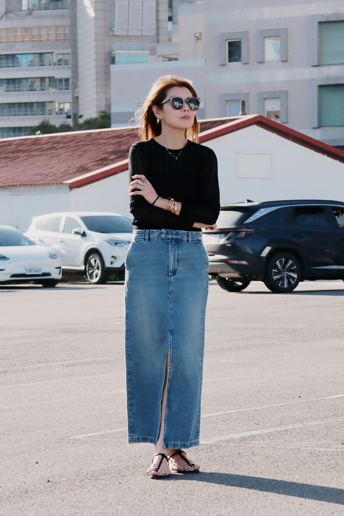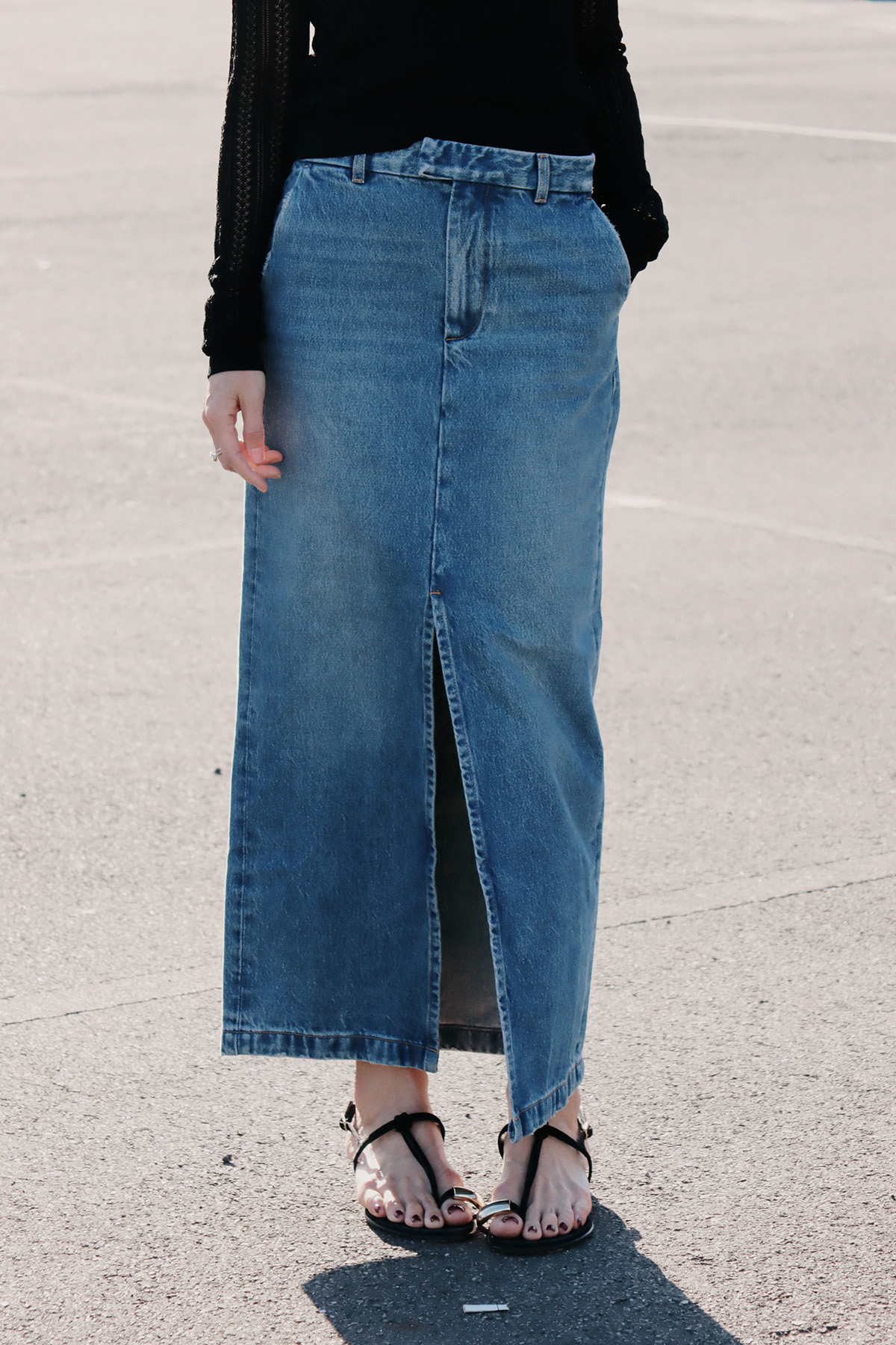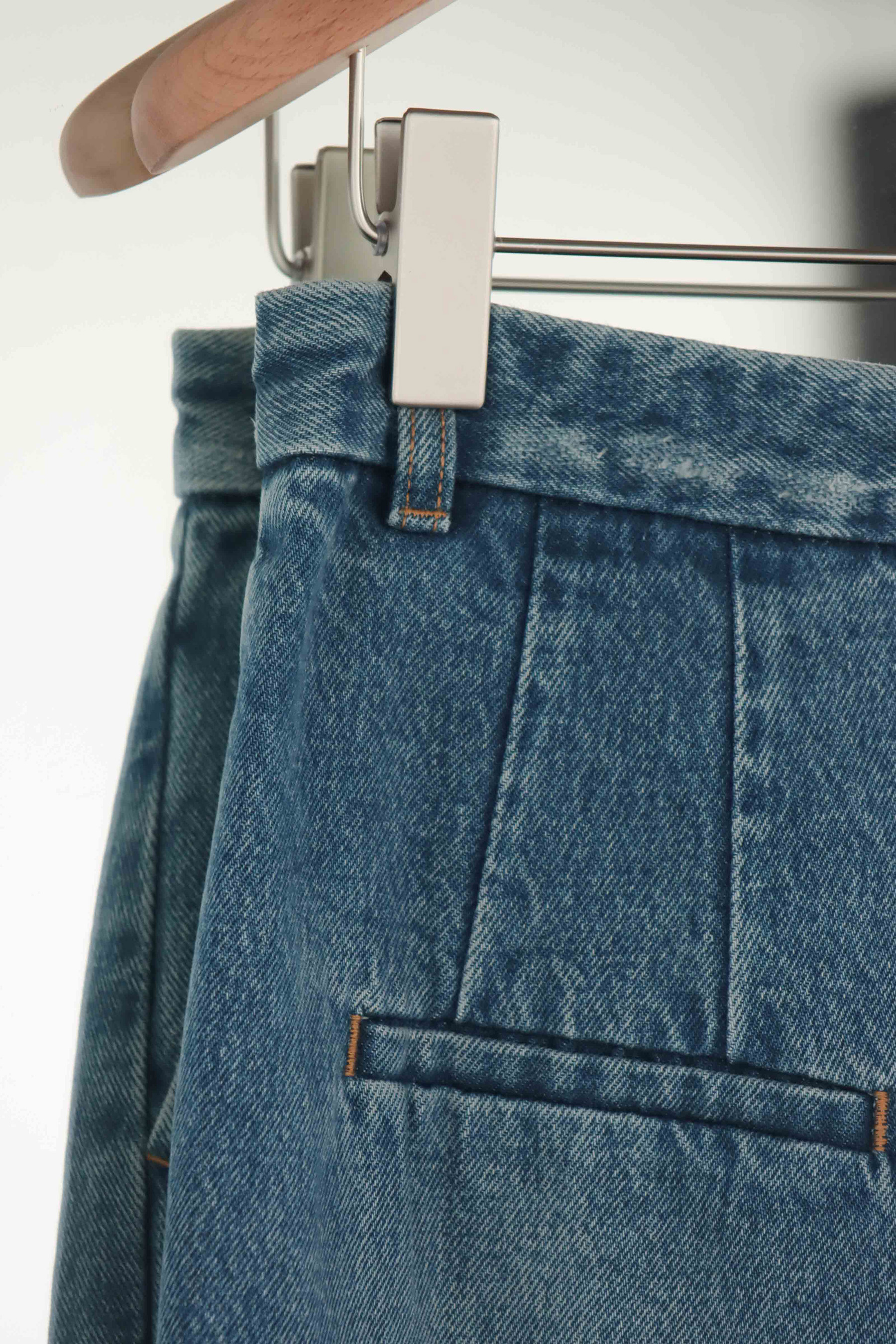 ・使用100% 純棉單寧面料製作,布料兼具自然挺度與柔軟度,穿著舒適且耐穿。直筒裙型搭配前開岔設計,修飾腿部線條同時提升行走時的活動度,腰頭加入刷破細節,為經典丹寧增添隨性感,隱藏釦設計讓外觀更加簡潔俐落;後臀唇袋上方以雙縫線剪裁加強立體輪廓,帶來自然提臀視覺效果,身形比例更顯修長。