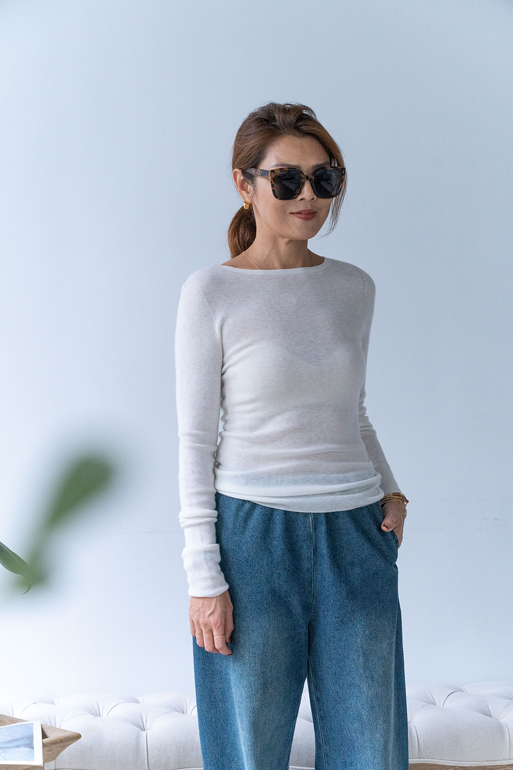 ・羊絨、聚酯纖維和雙蠶絲混合的內搭衣,特點會更加突出。羊絨帶來溫暖和柔軟的觸感,聚酯纖維則增加耐用度和抗皺性,而雙蠶絲則讓面料更加輕盈、光滑且透氣。因此,這種混合材質的內搭衣不僅舒適保暖,還能保持良好的垂感和高雅的光澤,非常適合在不同場合穿著,