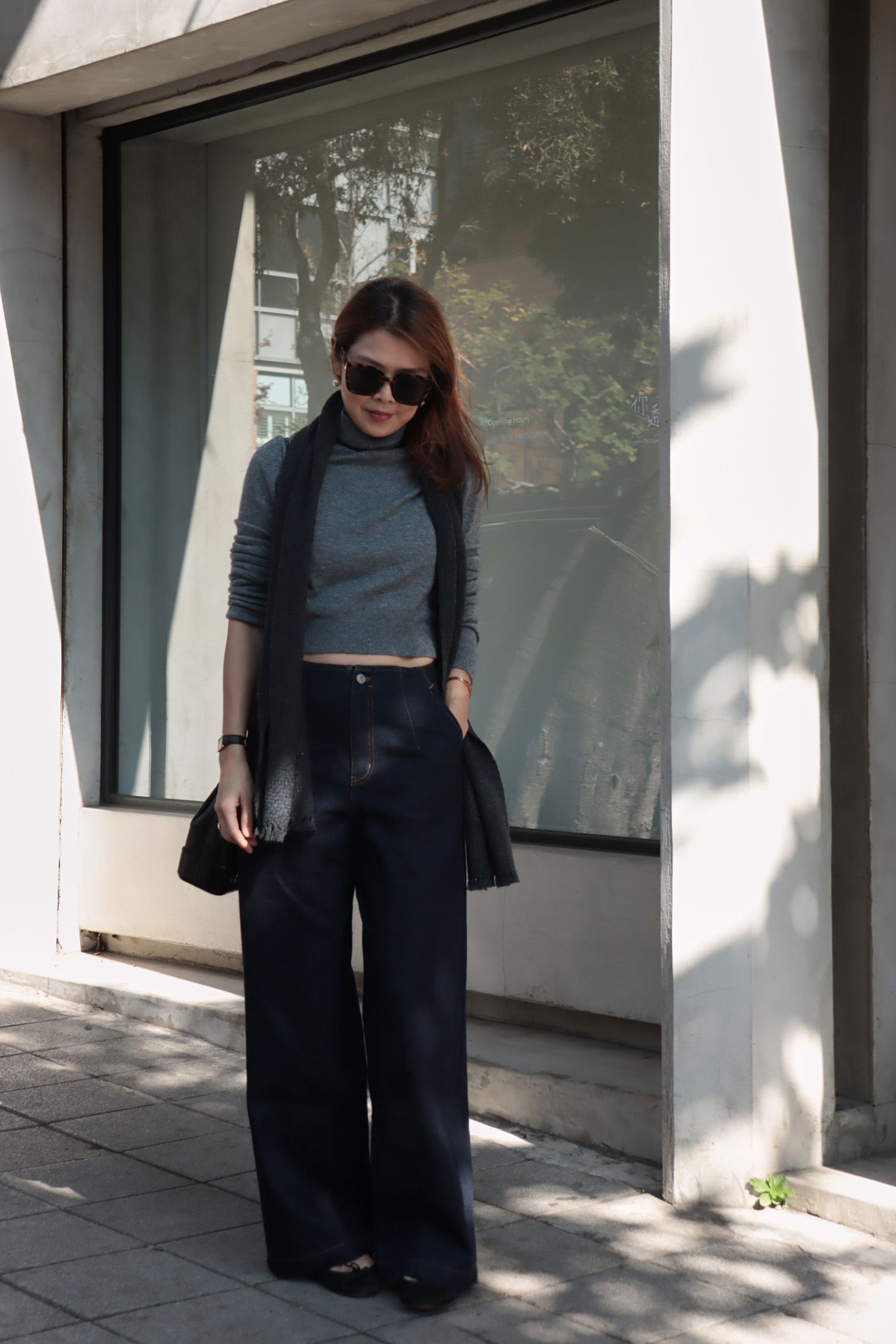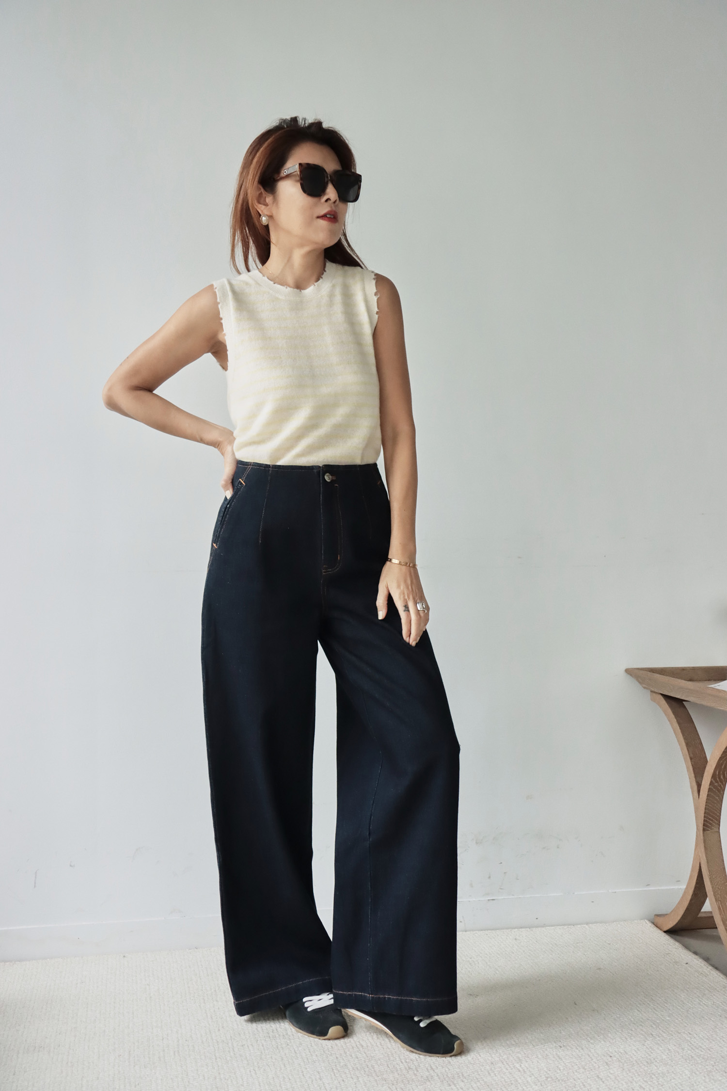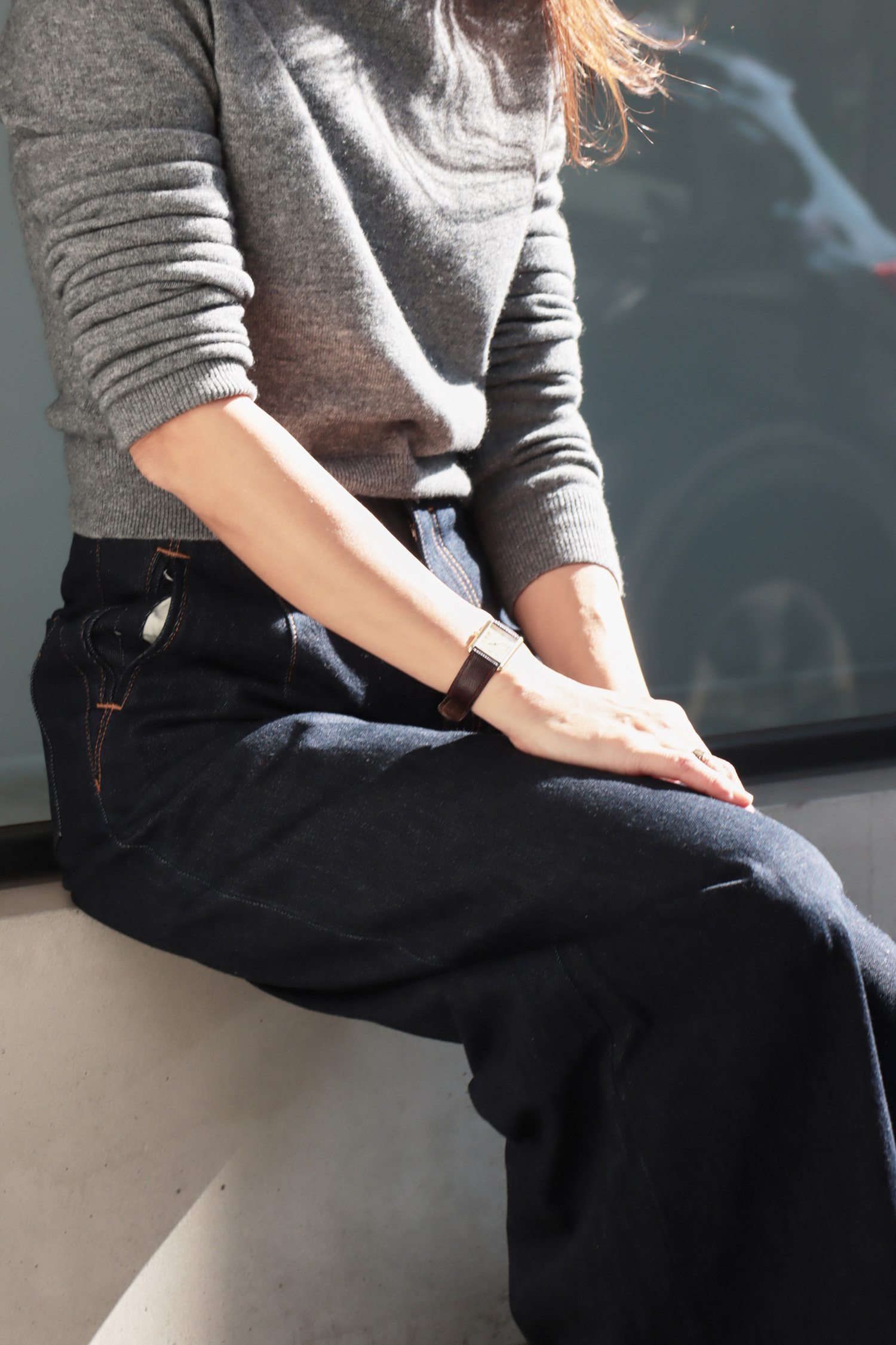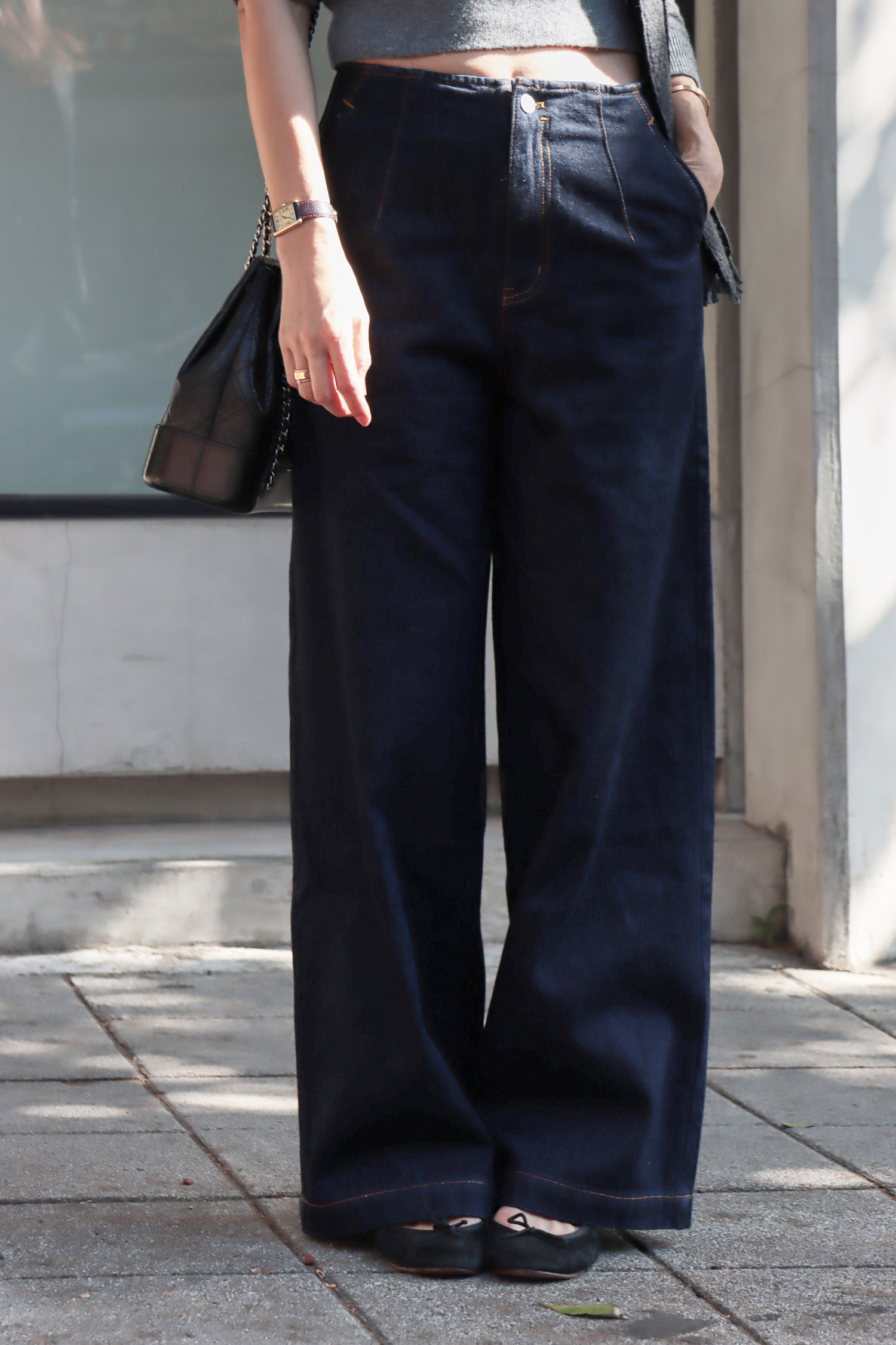 ・深藍牛仔布搭配撞色縫線細節,低調中展現設計感;無腰頭設計讓腰部線條更乾淨俐落,穿著時自然貼合不顯累贅;側邊斜切口袋結合車線前移,巧妙收窄外側線條,修飾臀腿比例,後側配置大尺寸貼袋,增添實用性與小臀視覺效果。整體版型挺而不硬,寬褲剪裁拉長腿部線條,以俐落結構打造現代感輪廓。