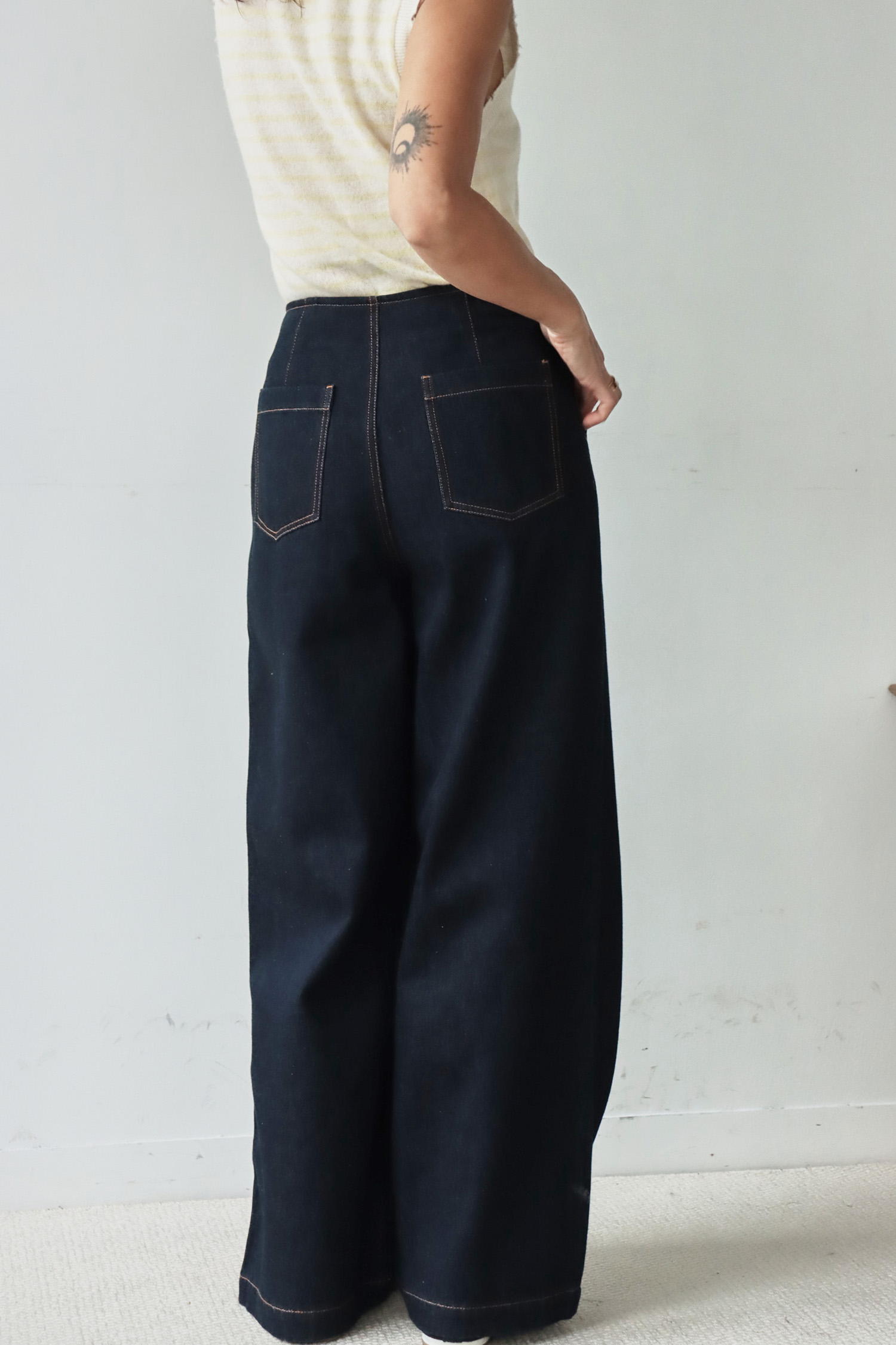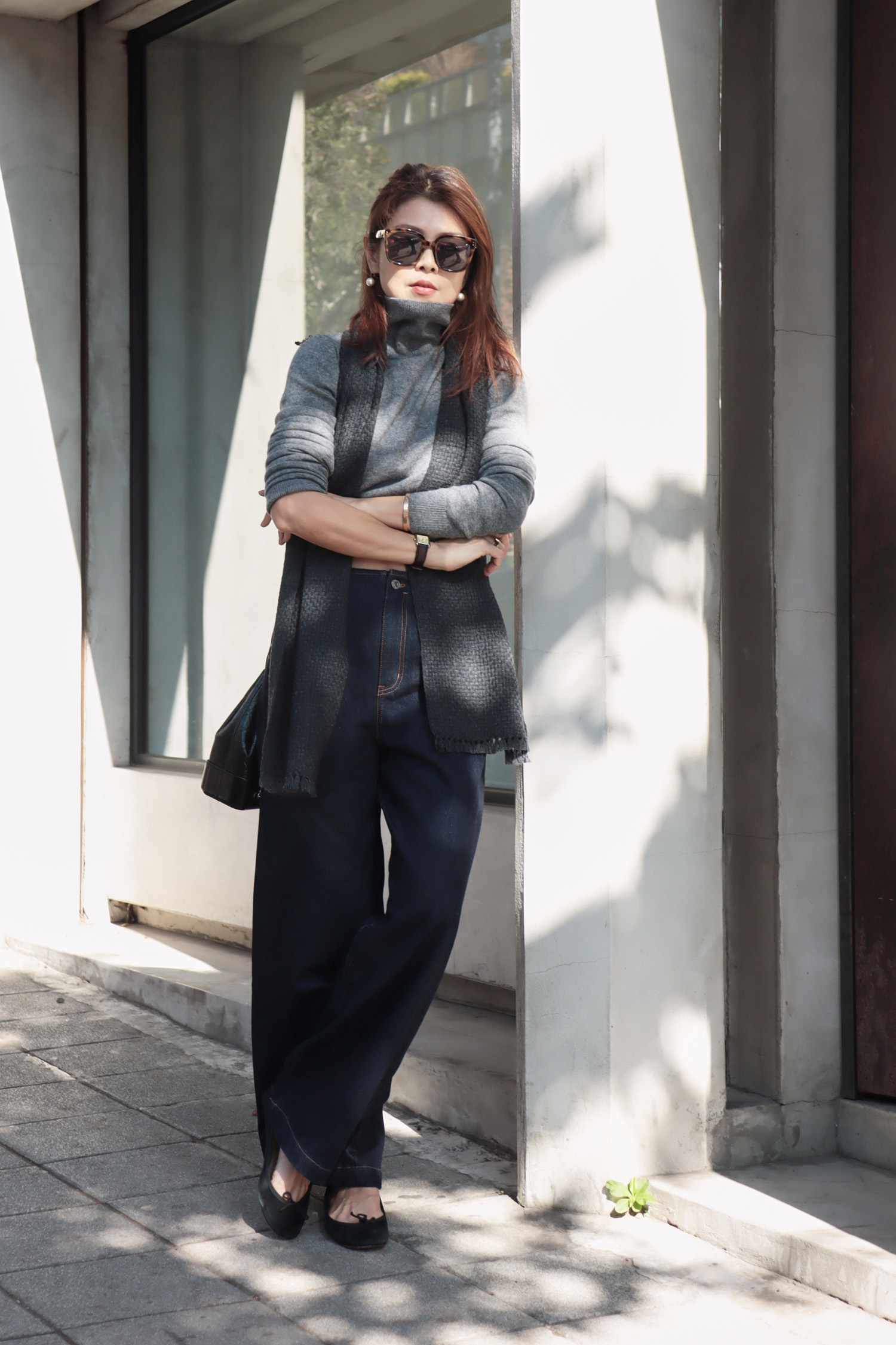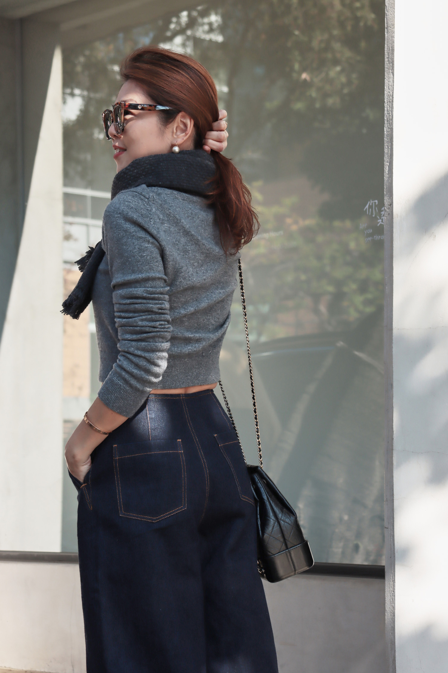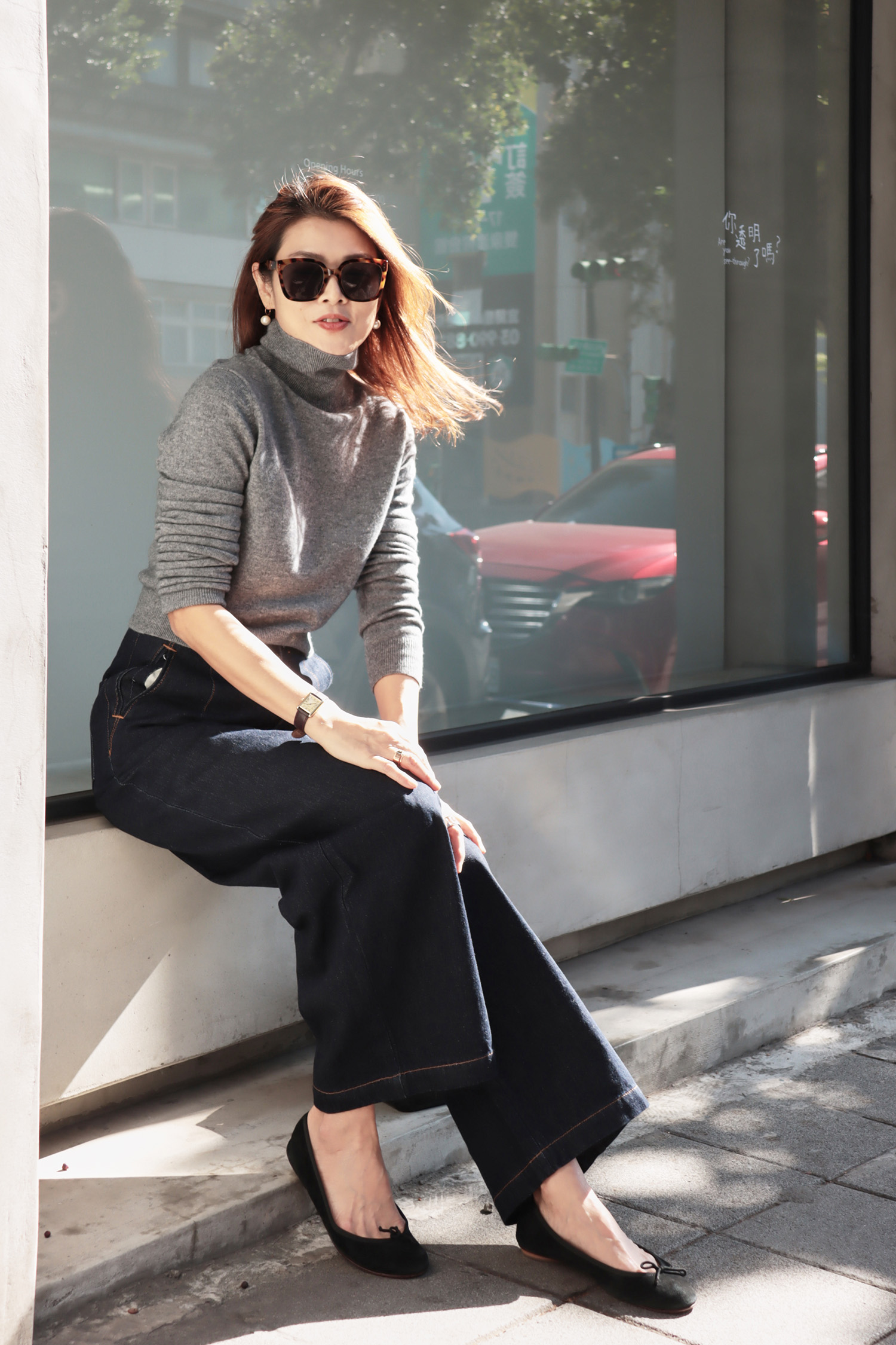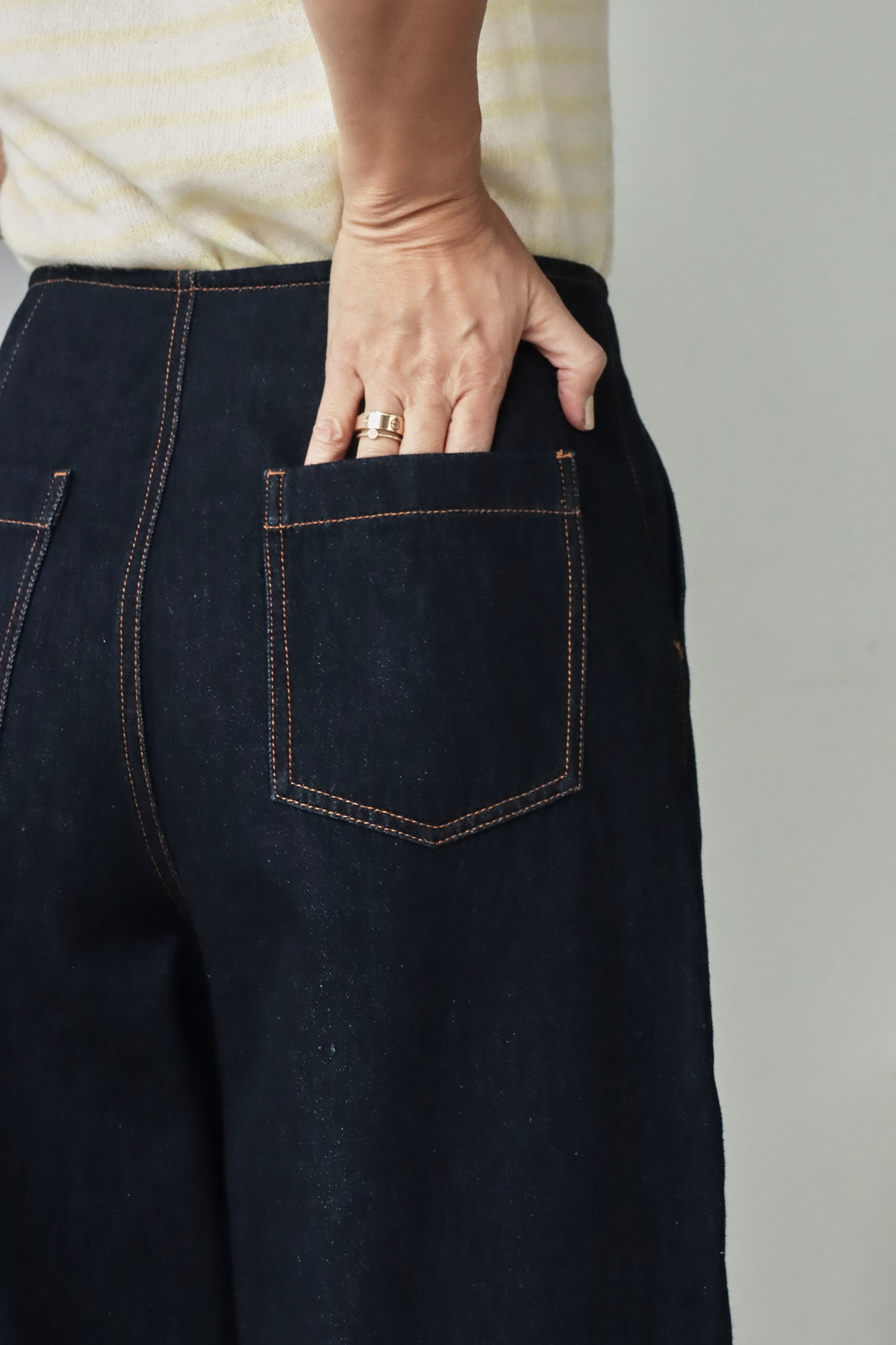 ・深藍牛仔布搭配撞色縫線細節,低調中展現設計感;無腰頭設計讓腰部線條更乾淨俐落,穿著時自然貼合不顯累贅;側邊斜切口袋結合車線前移,巧妙收窄外側線條,修飾臀腿比例,後側配置大尺寸貼袋,增添實用性與小臀視覺效果。整體版型挺而不硬,寬褲剪裁拉長腿部線條,以俐落結構打造現代感輪廓。