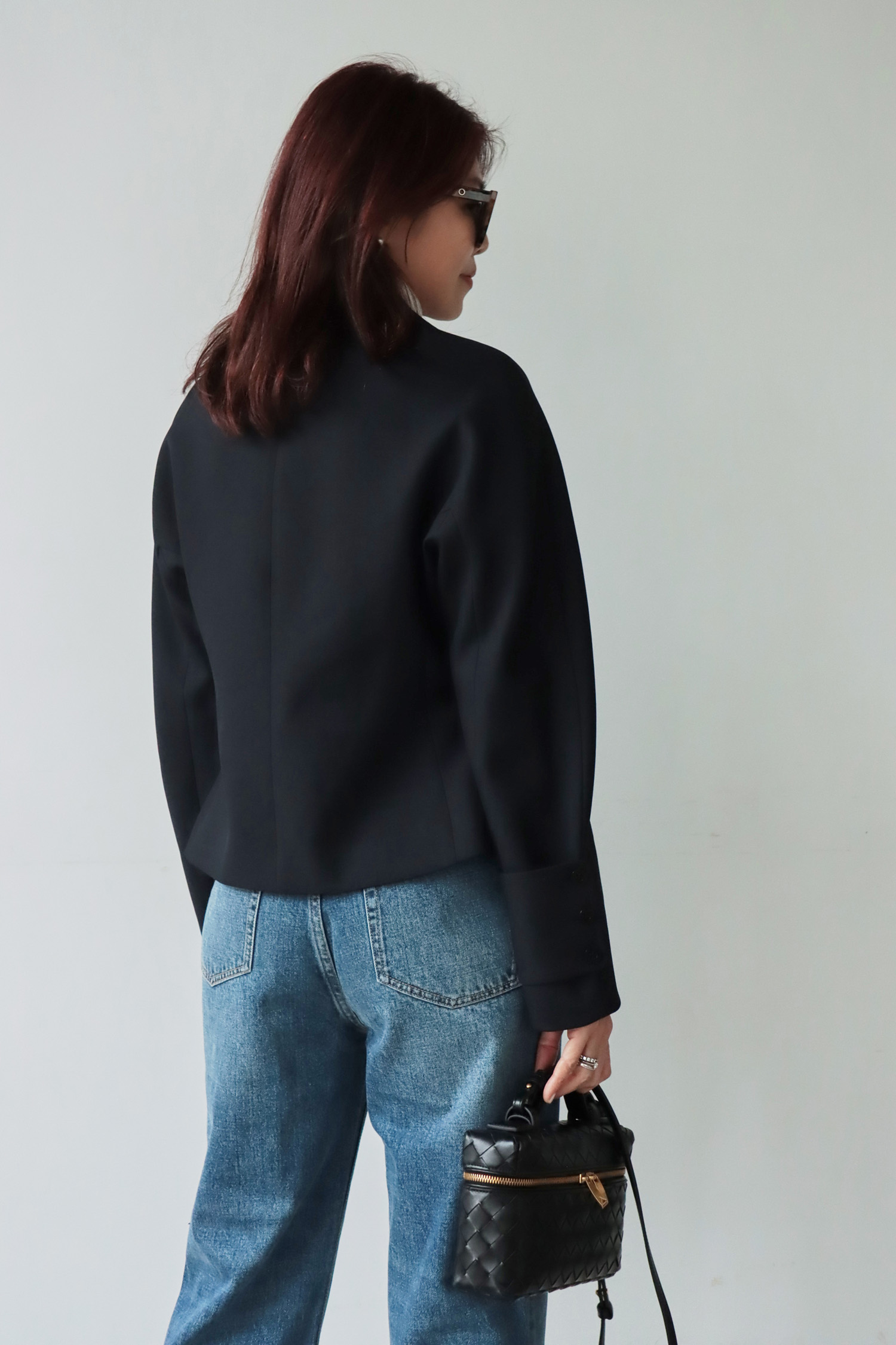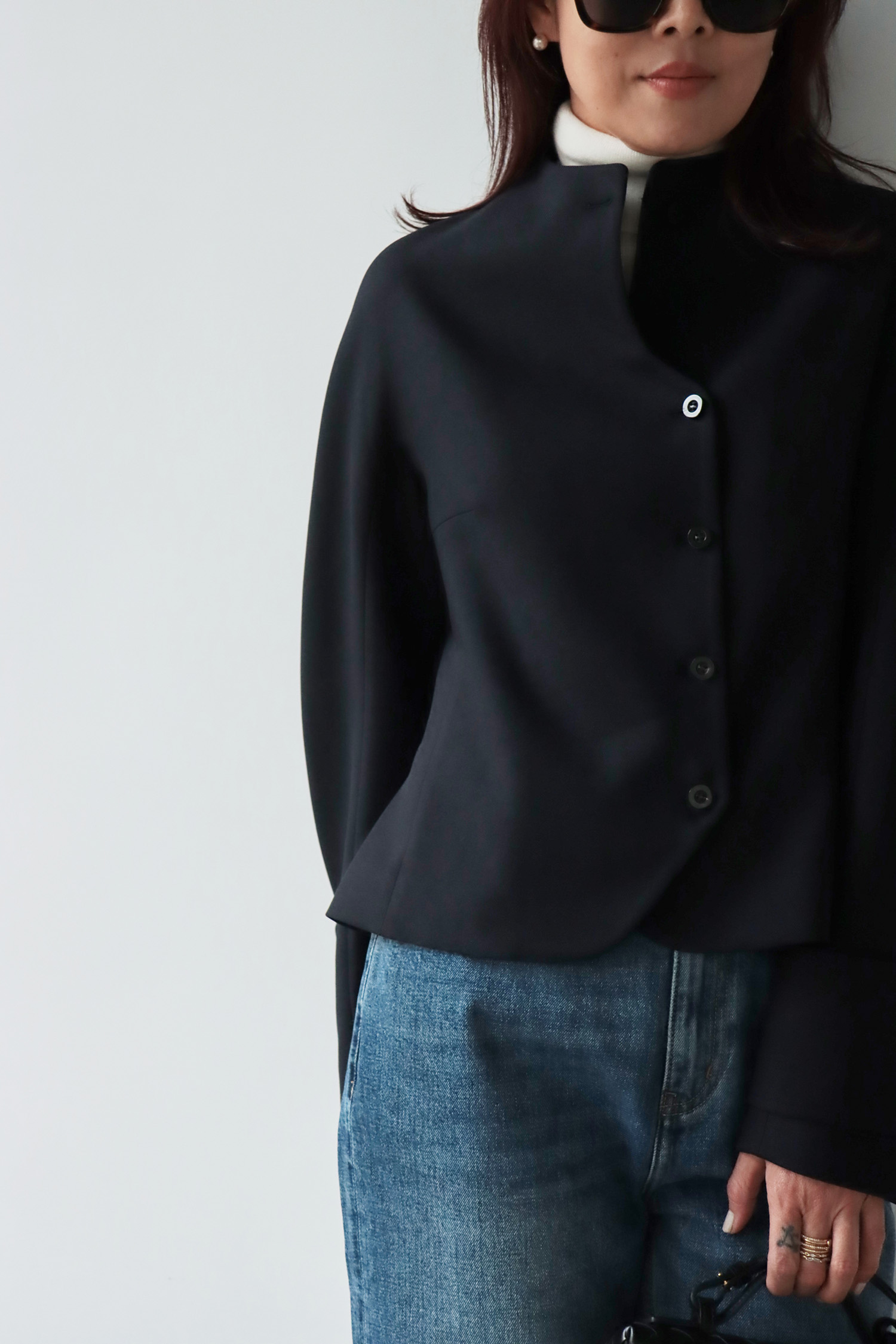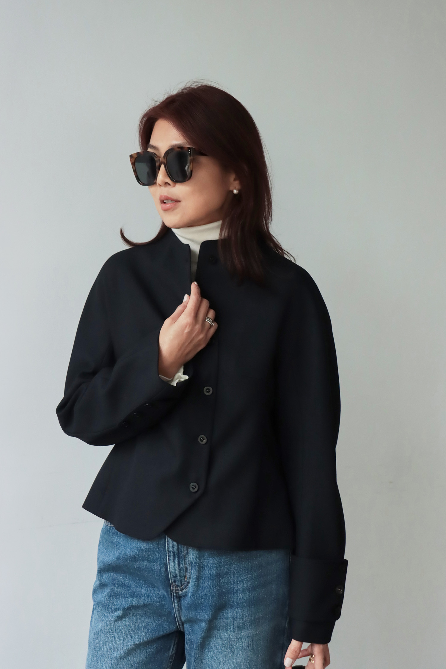 ・布料細緻且具結構挺度,能穩定支撐版型,使外套在穿著時保持俐落輪廓,內裡輕薄柔滑,穿著時更加舒適、不易產生悶熱感。圓領設計弱化傳統西裝外套的銳利感,讓肩頸線條更柔和洗鍊;透過順身線條自然修飾上半身比例,下擺以圓弧裁切收尾,減少生硬直線帶來的正式感,搭配簡潔釦子配置,在視覺上維持俐落焦點,同時增添層次細節,使外套在正式與休閒之間取得恰到好處的平衡,單穿或層次搭配皆能展現設計感。