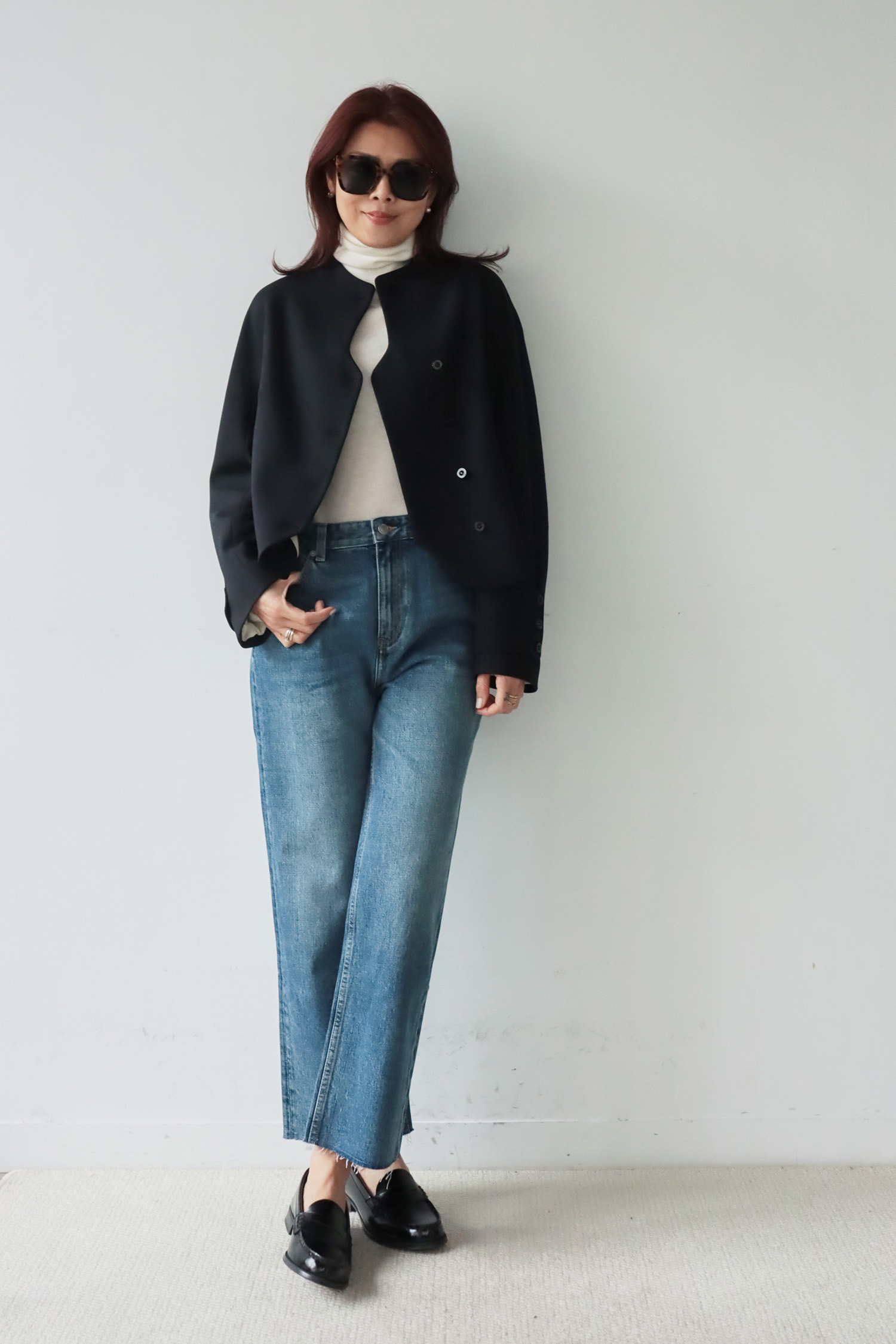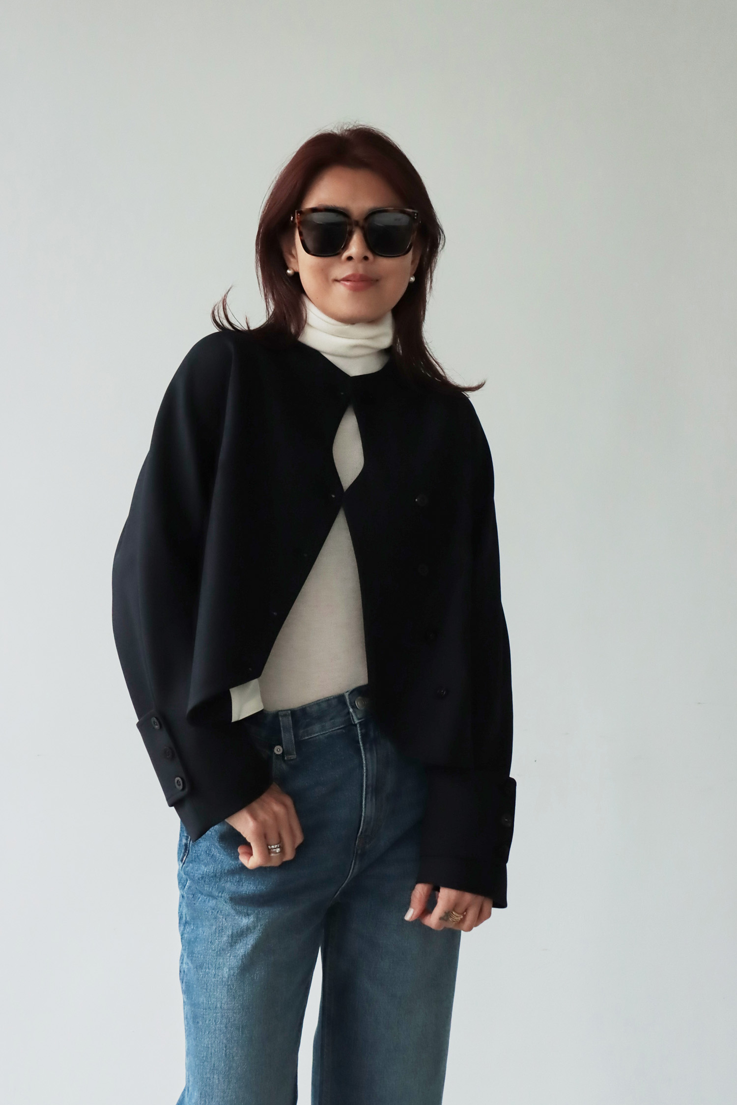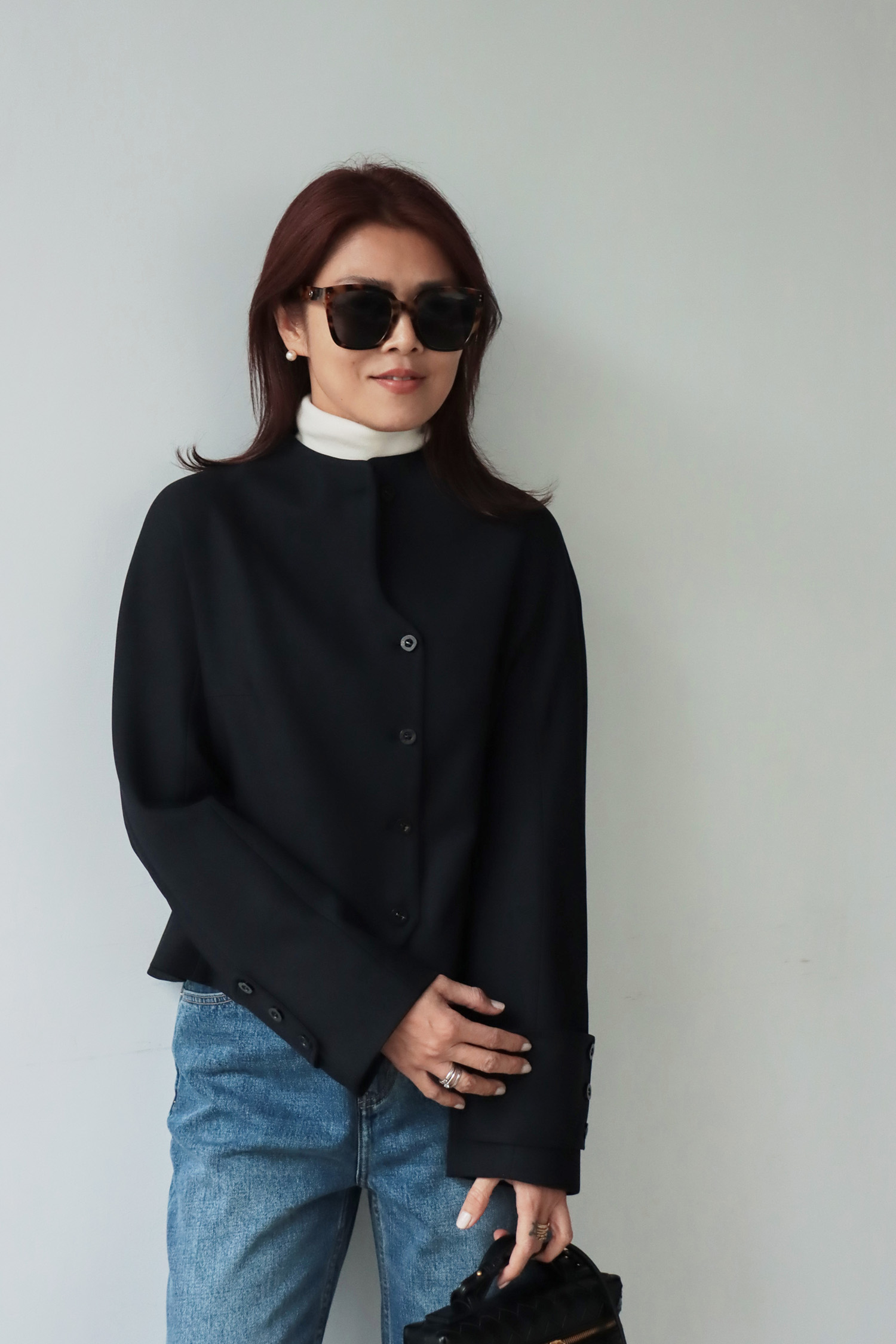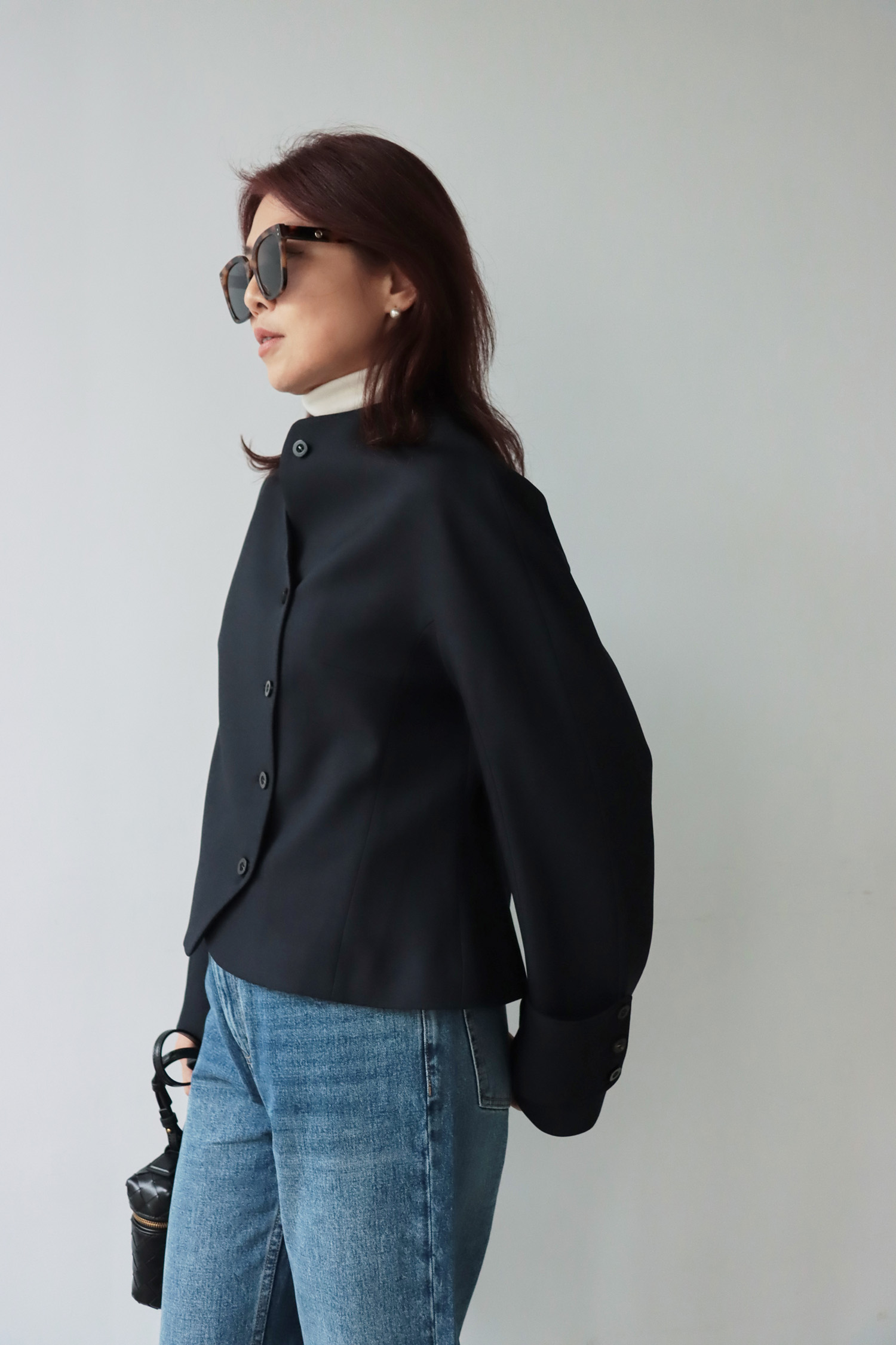 ・布料細緻且具結構挺度,能穩定支撐版型,使外套在穿著時保持俐落輪廓,內裡輕薄柔滑,穿著時更加舒適、不易產生悶熱感。圓領設計弱化傳統西裝外套的銳利感,讓肩頸線條更柔和洗鍊;透過順身線條自然修飾上半身比例,下擺以圓弧裁切收尾,減少生硬直線帶來的正式感,搭配簡潔釦子配置,在視覺上維持俐落焦點,同時增添層次細節,使外套在正式與休閒之間取得恰到好處的平衡,單穿或層次搭配皆能展現設計感。