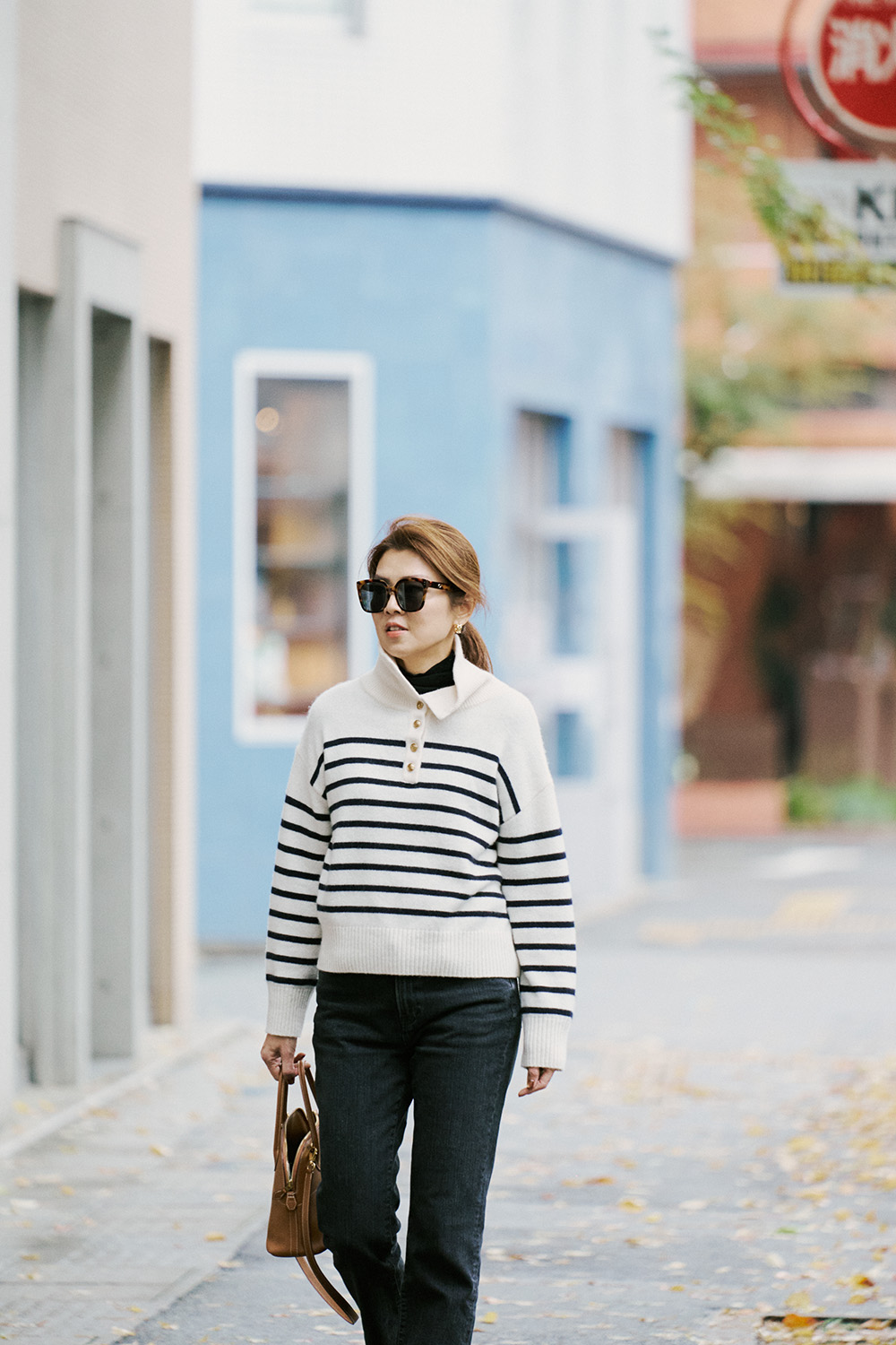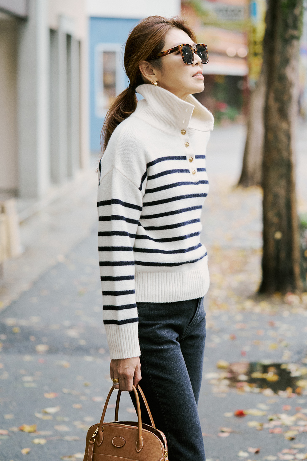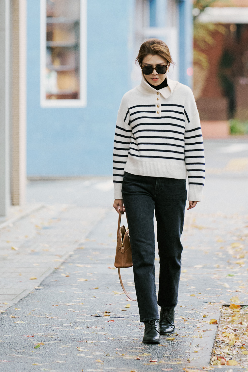 ・橫條紋避開肩膀處,避免肩部被加寬,修飾身形比例
