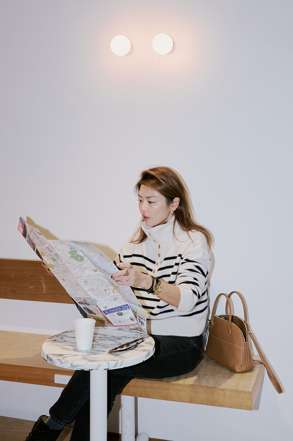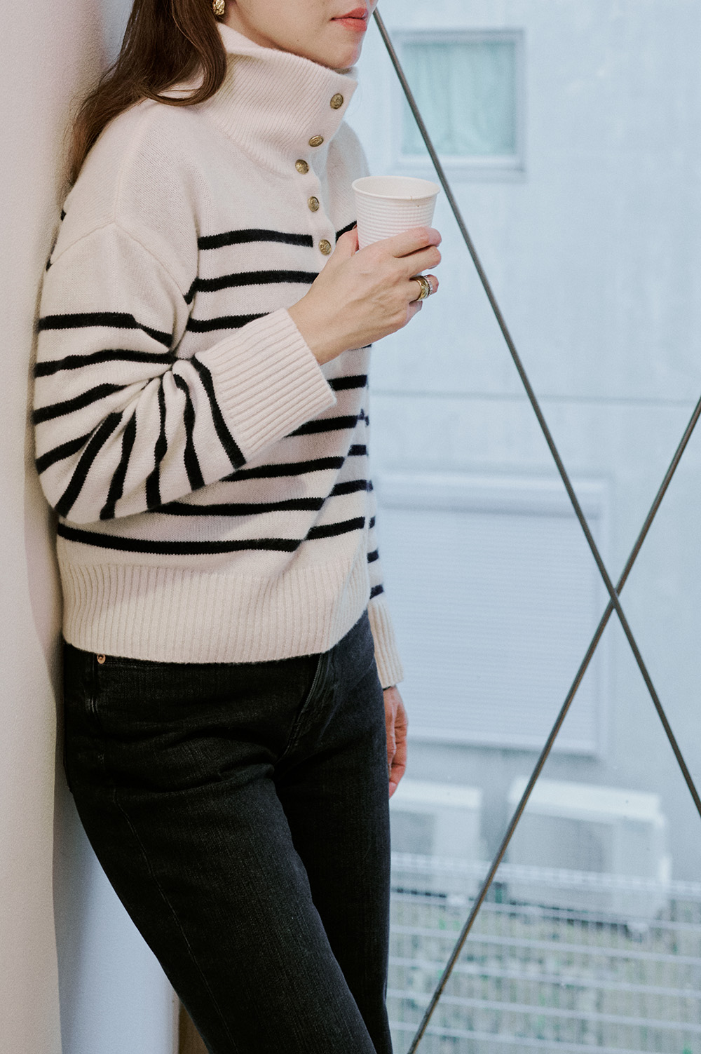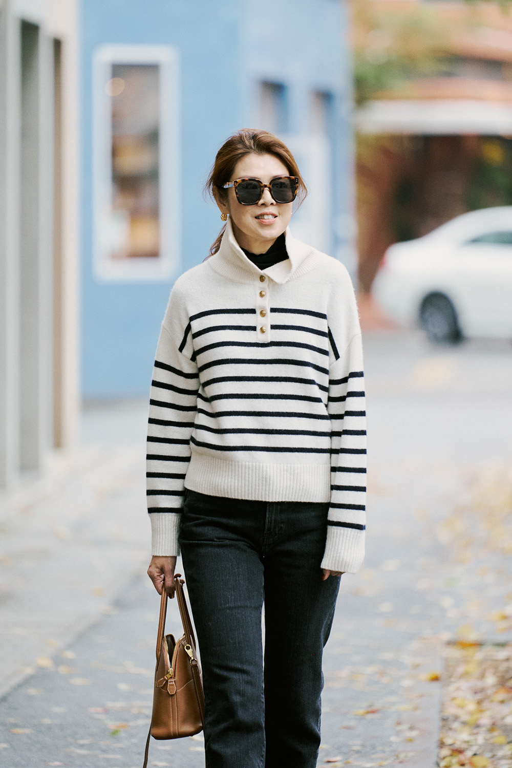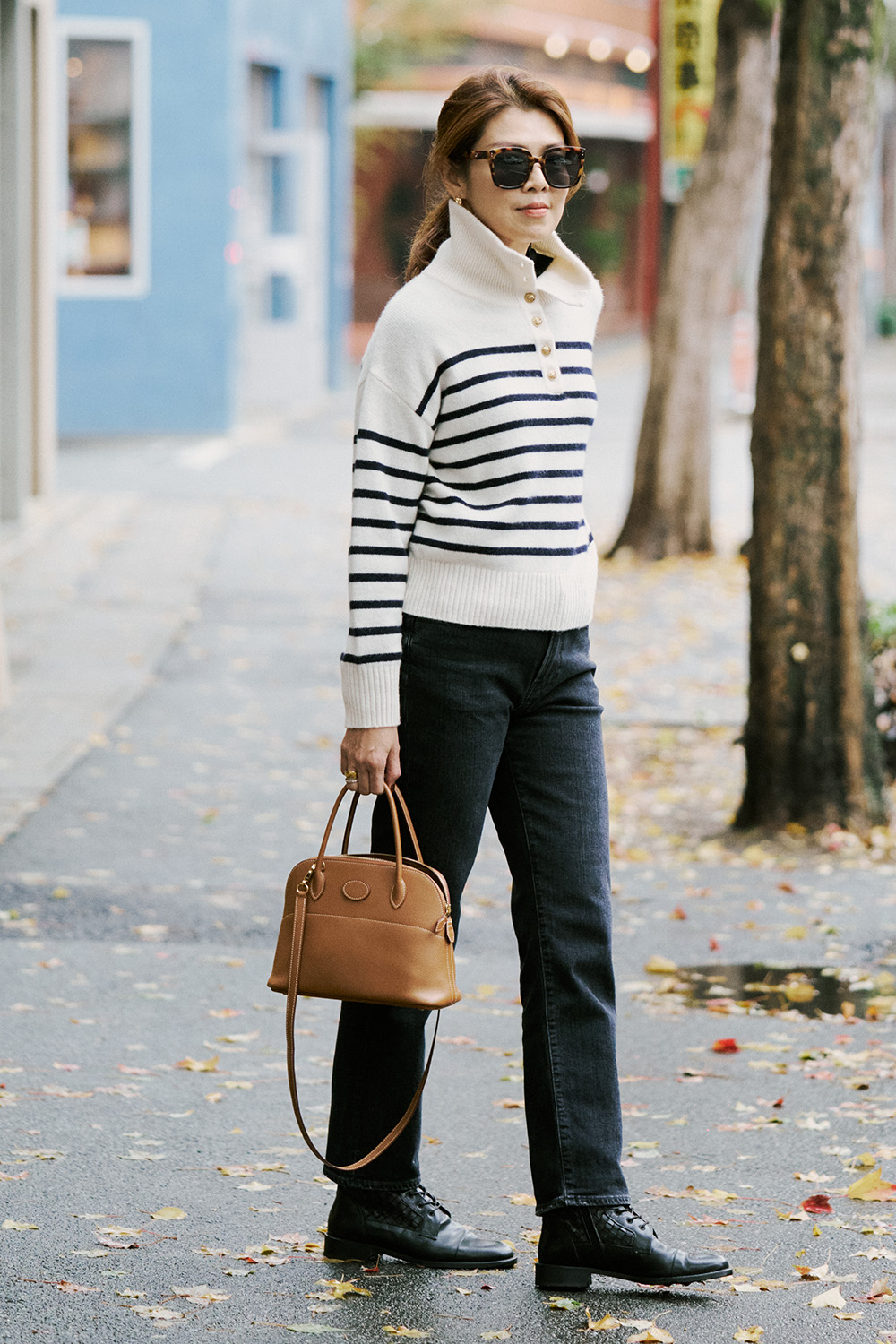 ・橫條紋避開肩膀處,避免肩部被加寬,修飾身形比例