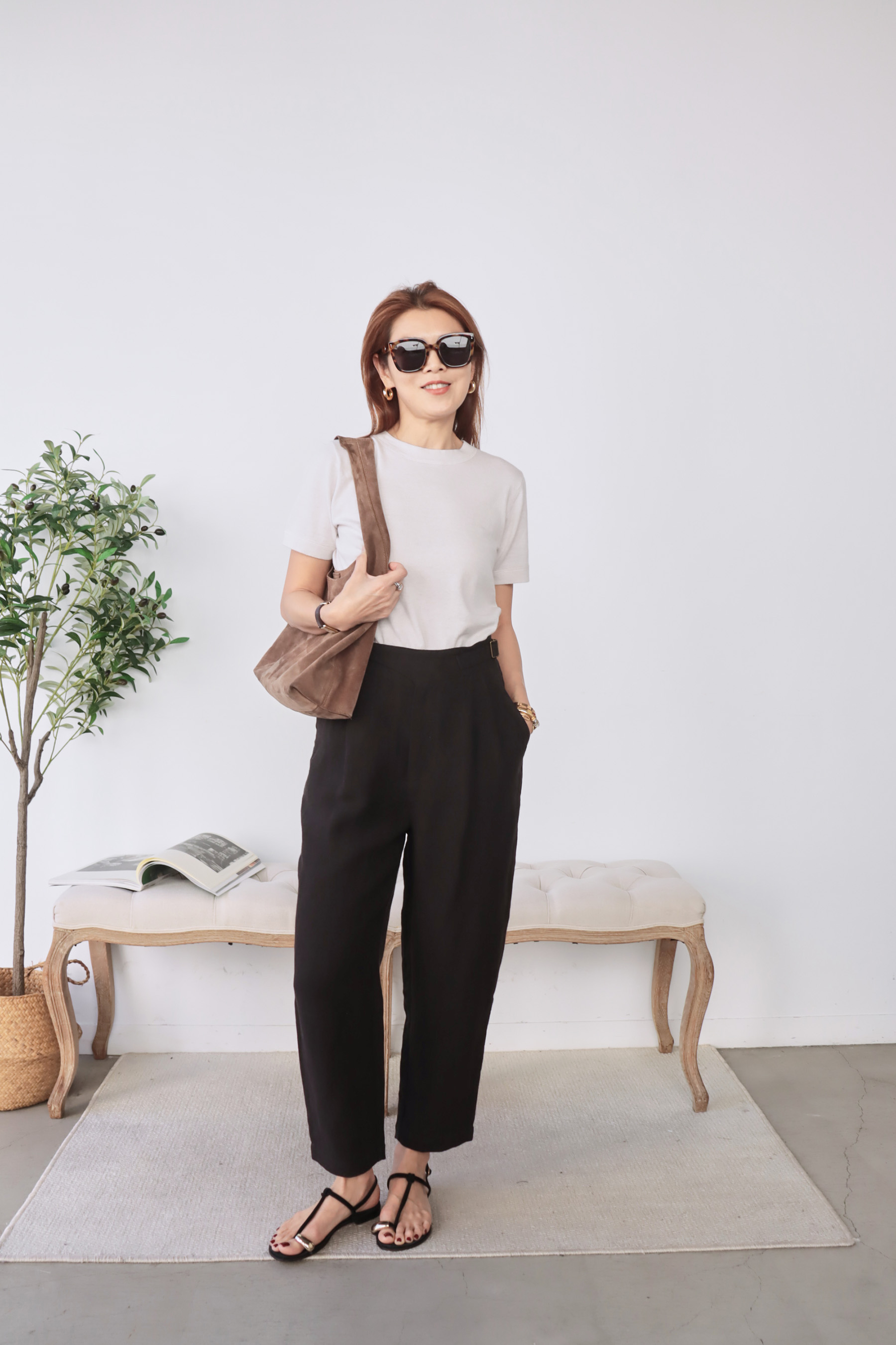 ・下身-挺版雙側可調節綁帶亞麻長褲—黑