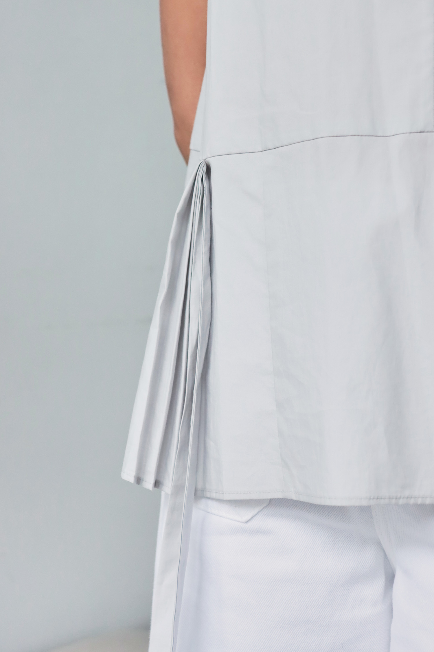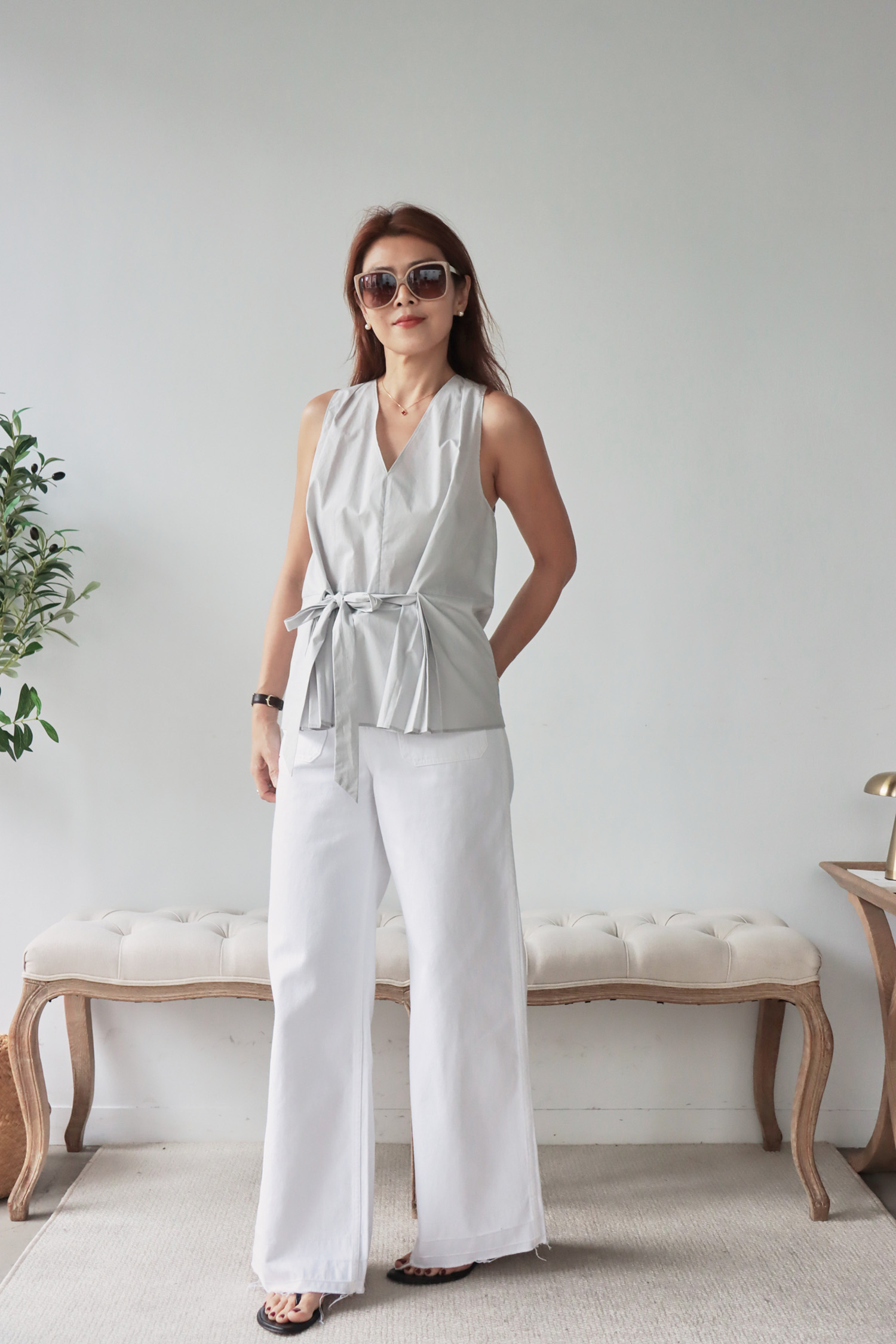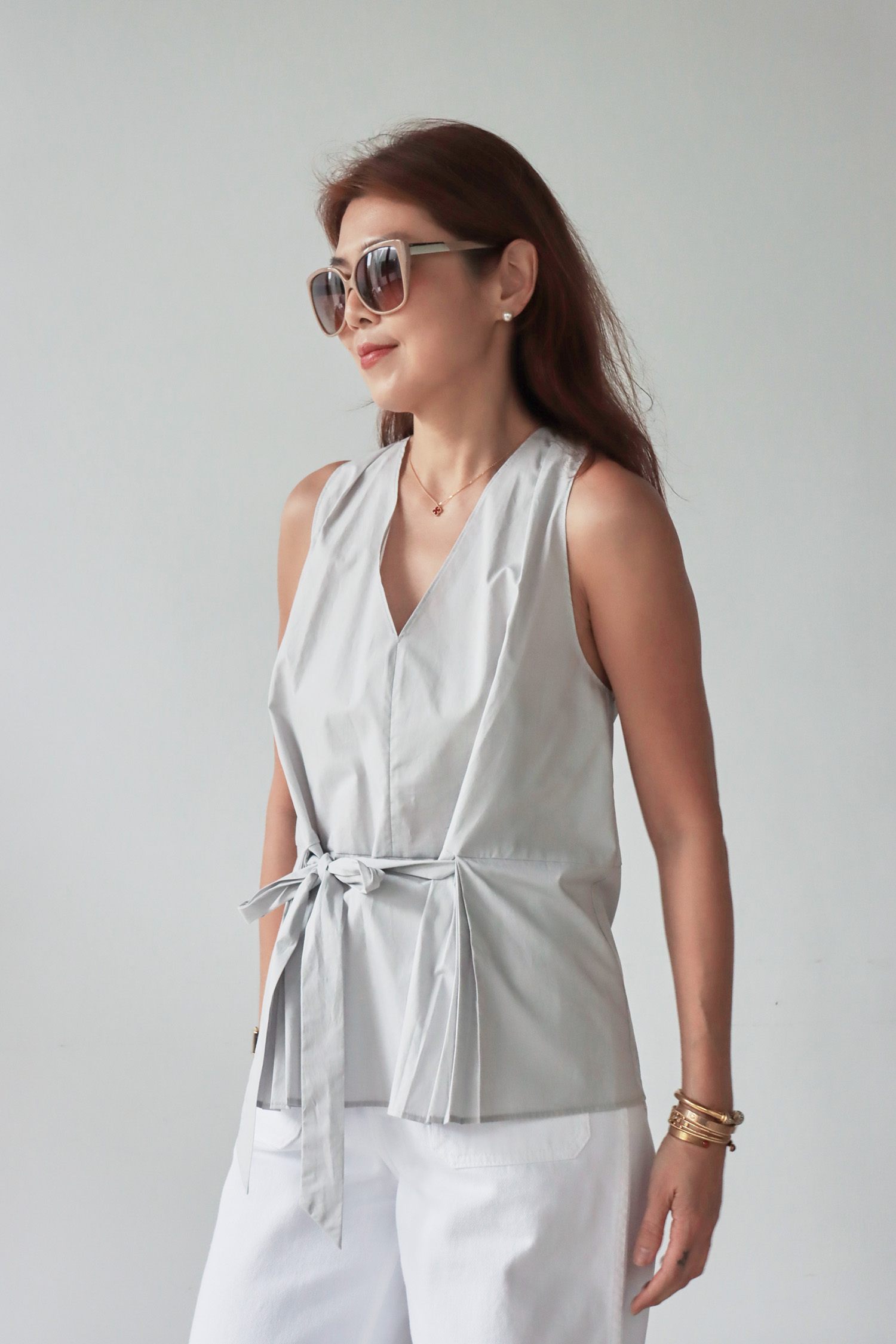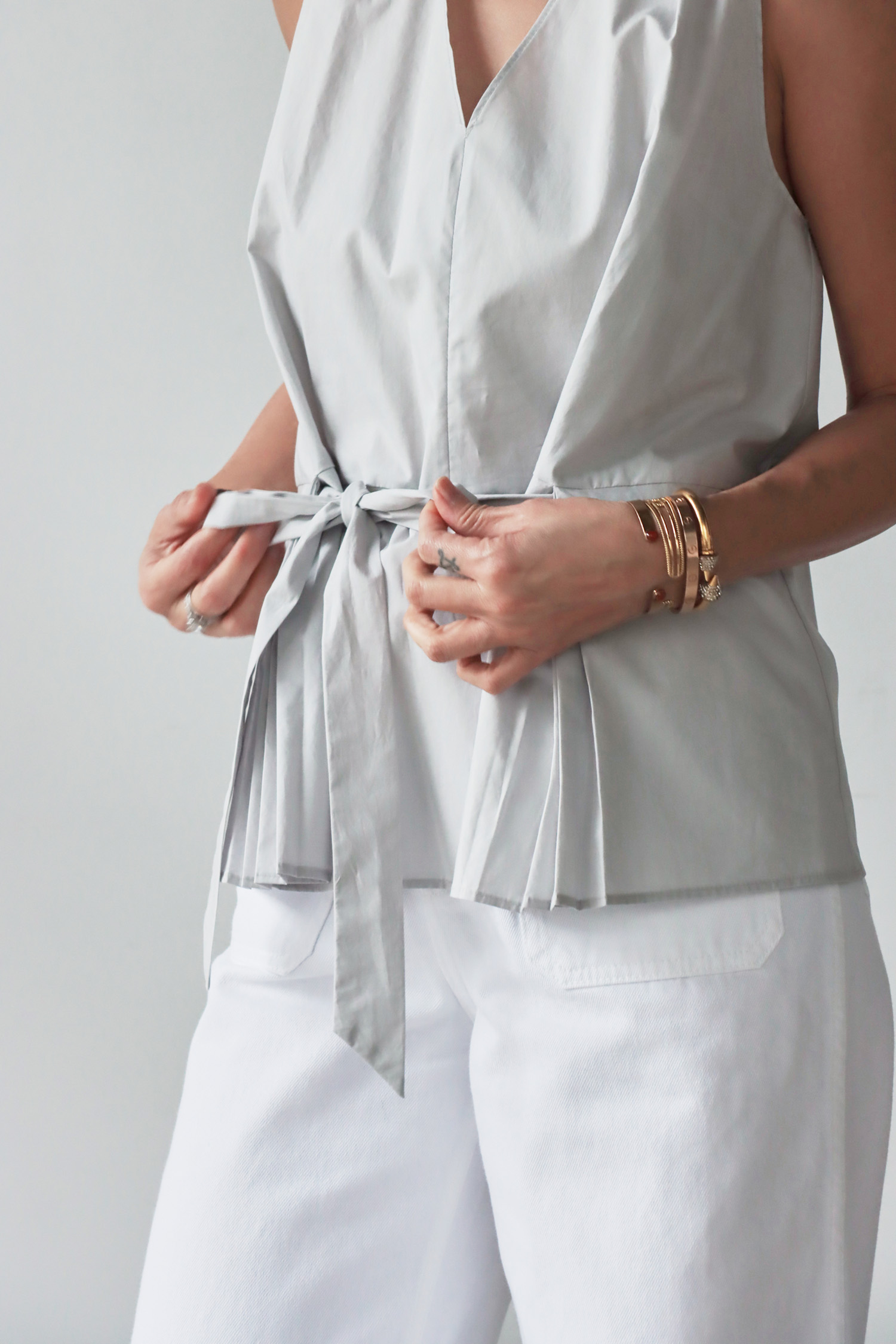 【歐洲精選】腰間綁帶下擺百褶V領無袖上衣