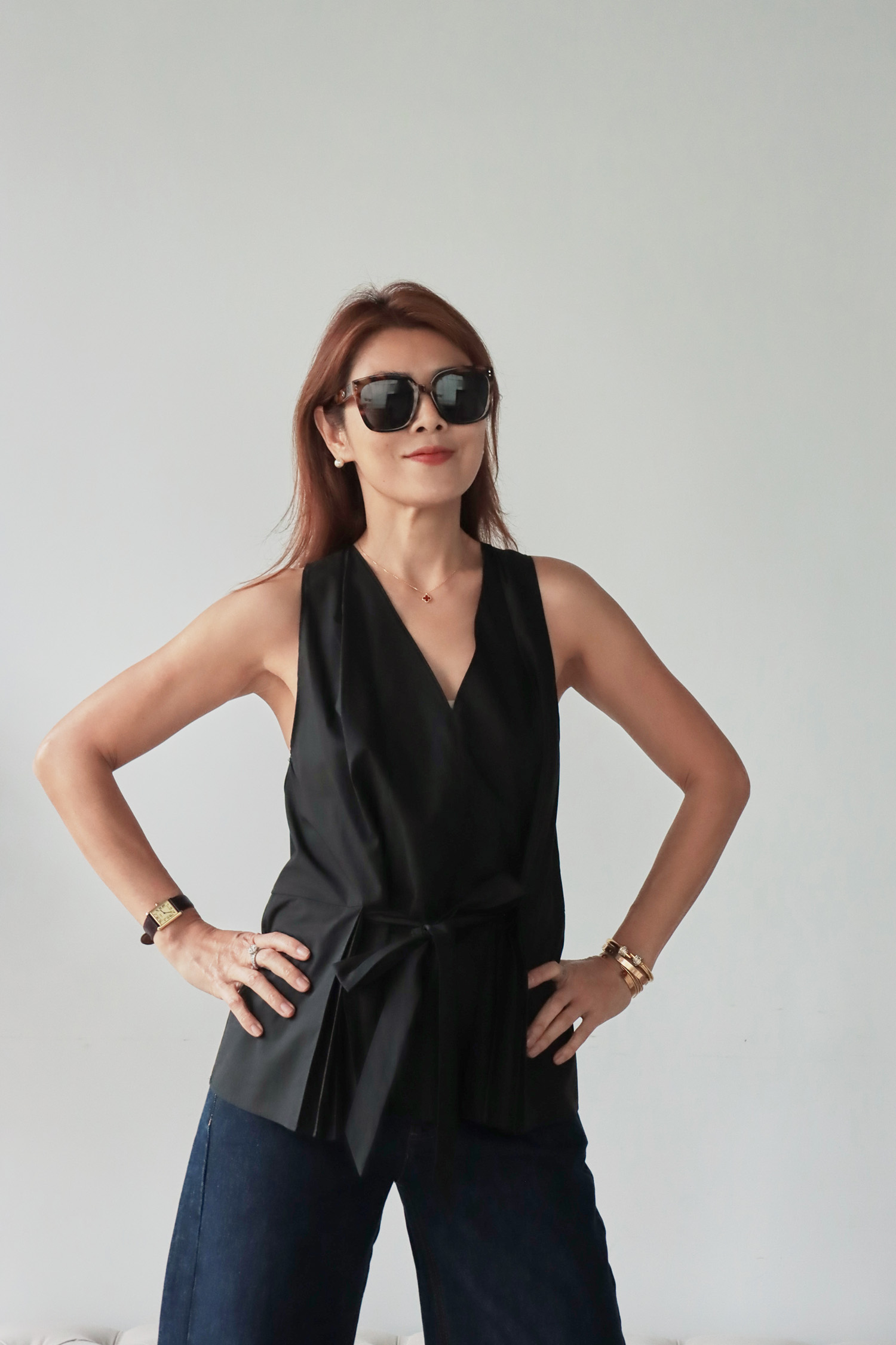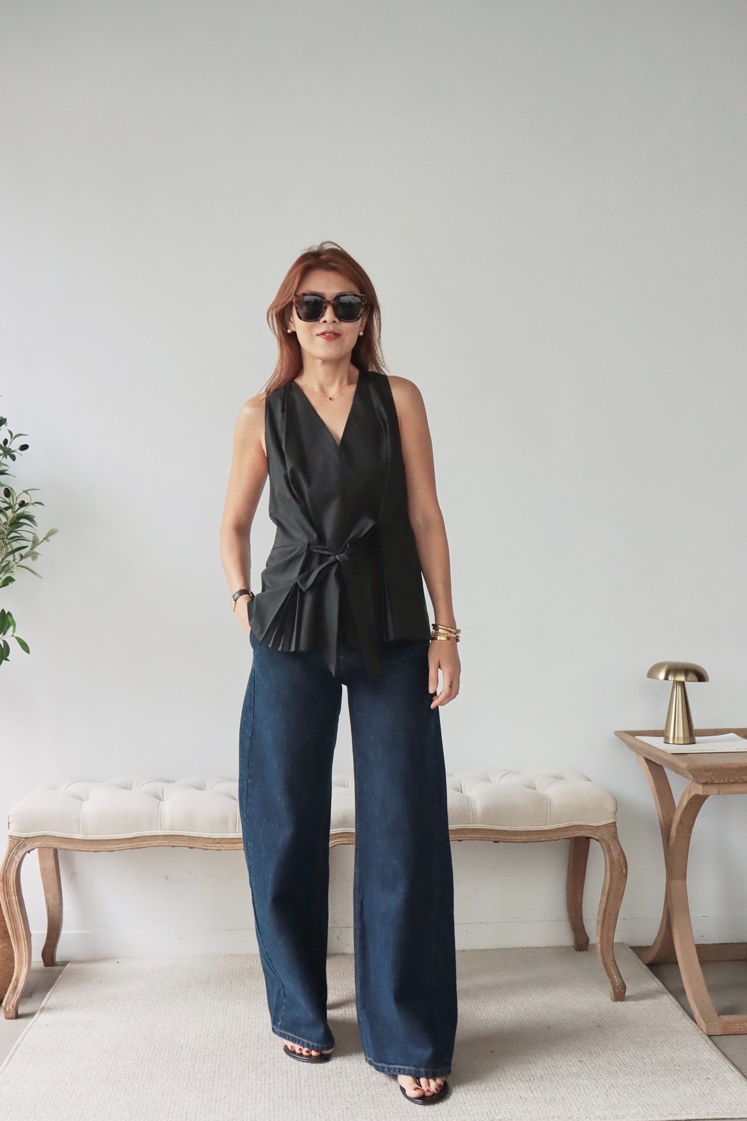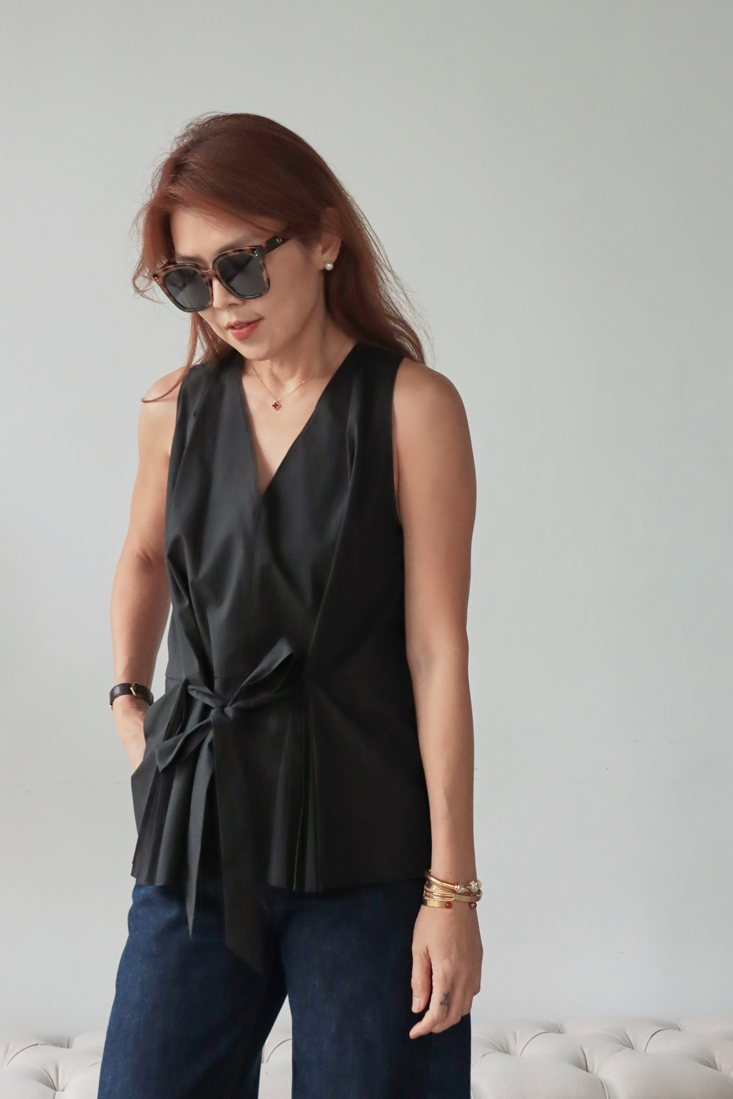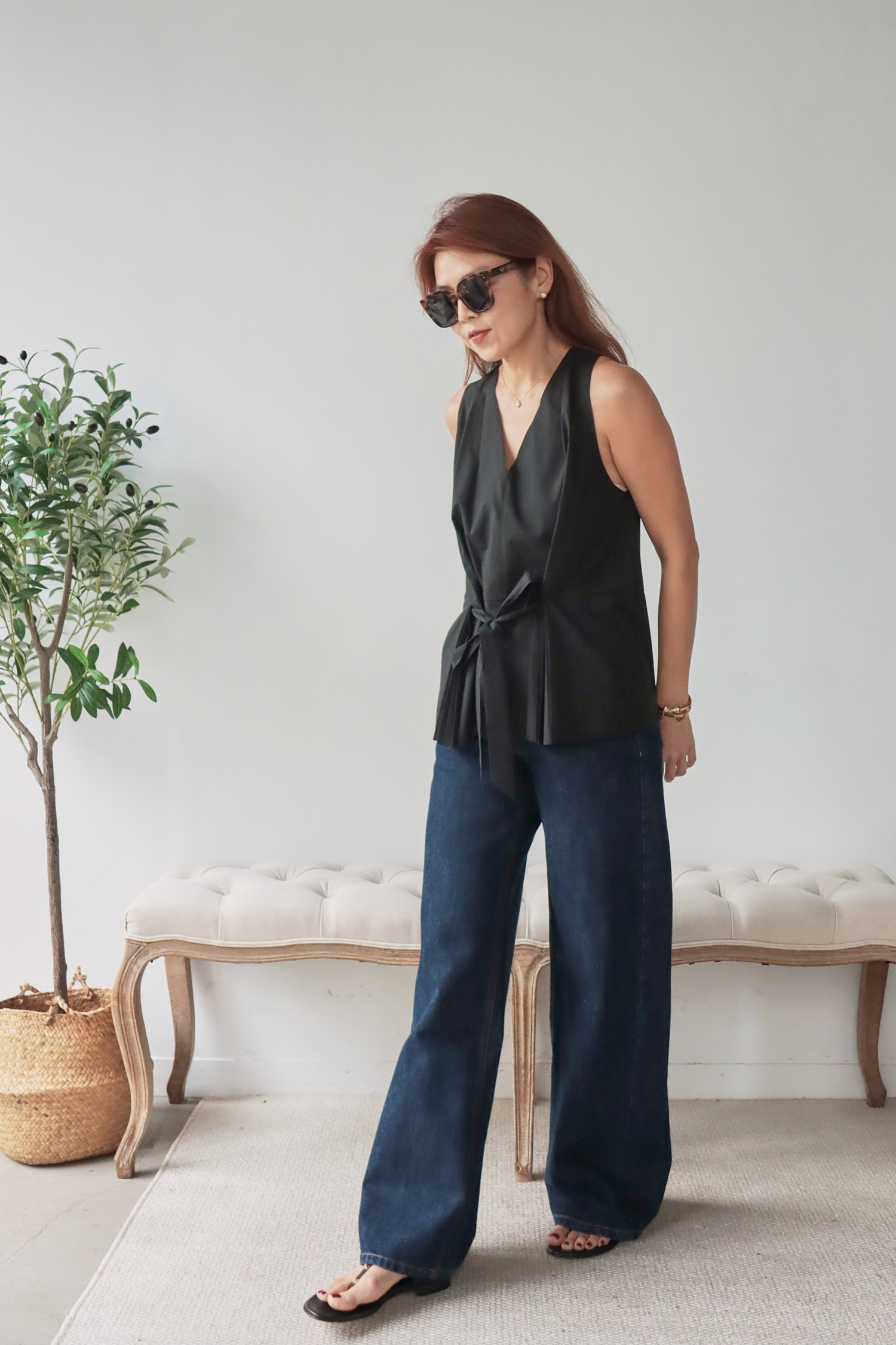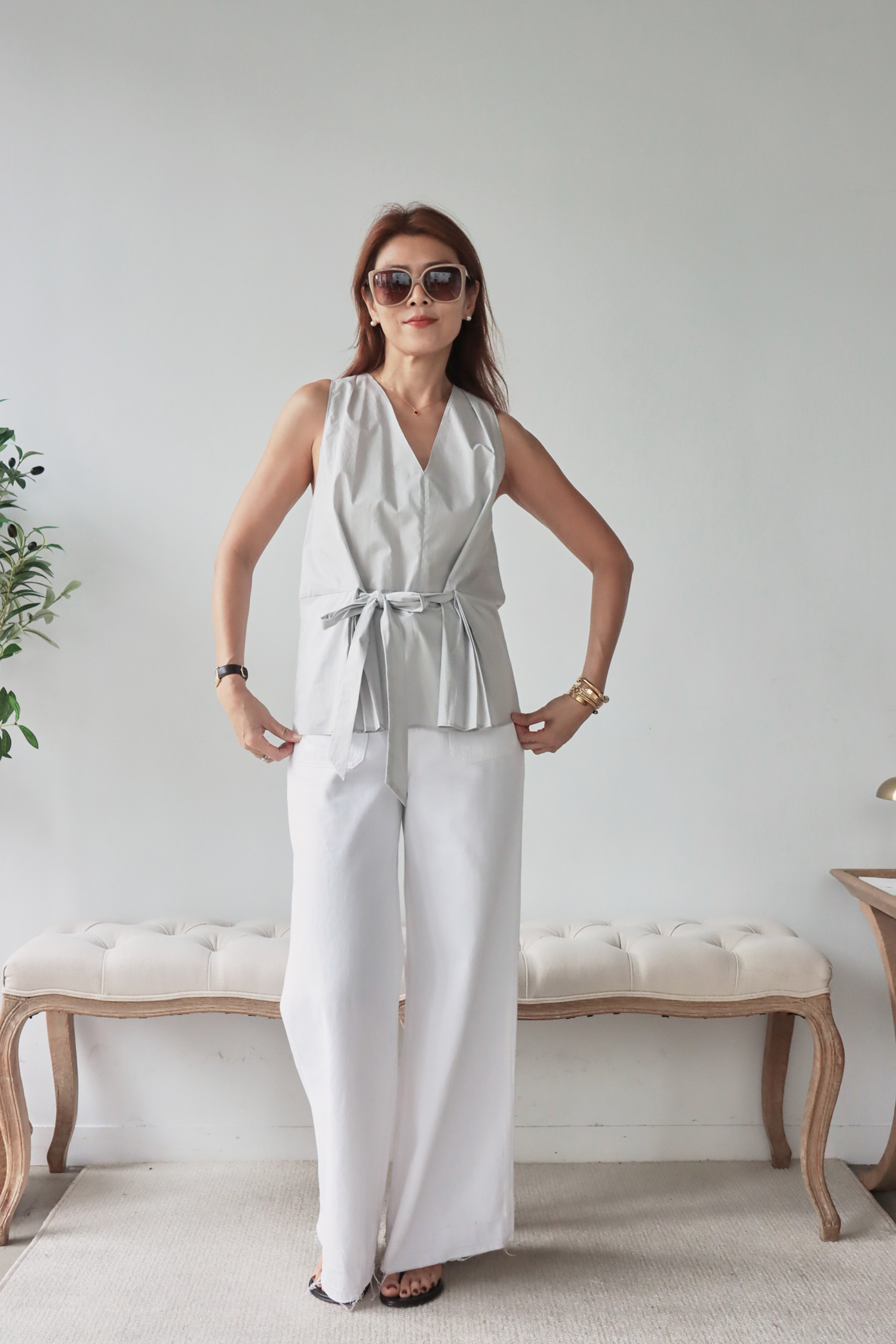 【歐洲精選】腰間綁帶下擺百褶V領無袖上衣