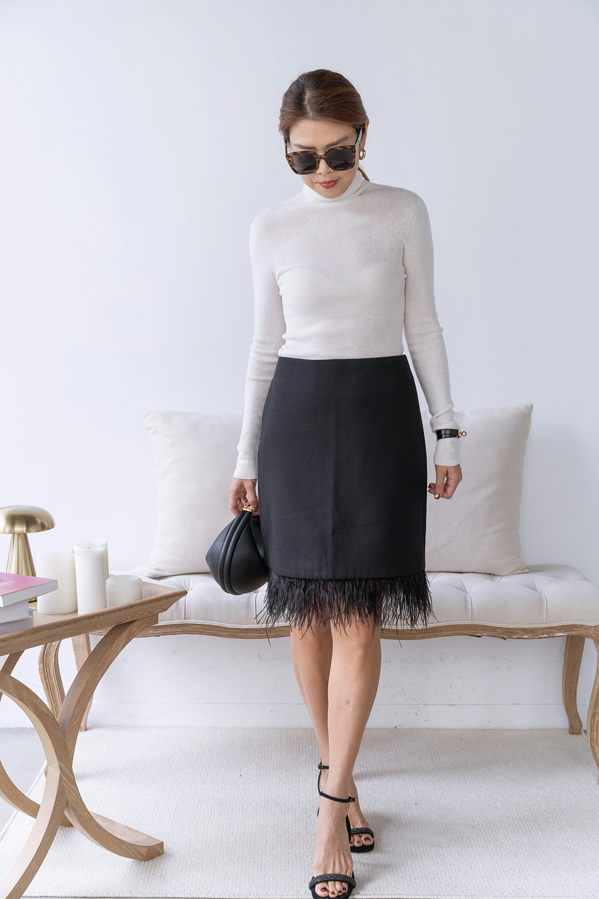 ・下擺細緻羽毛拼接,飄逸效果增添整體輕盈感
