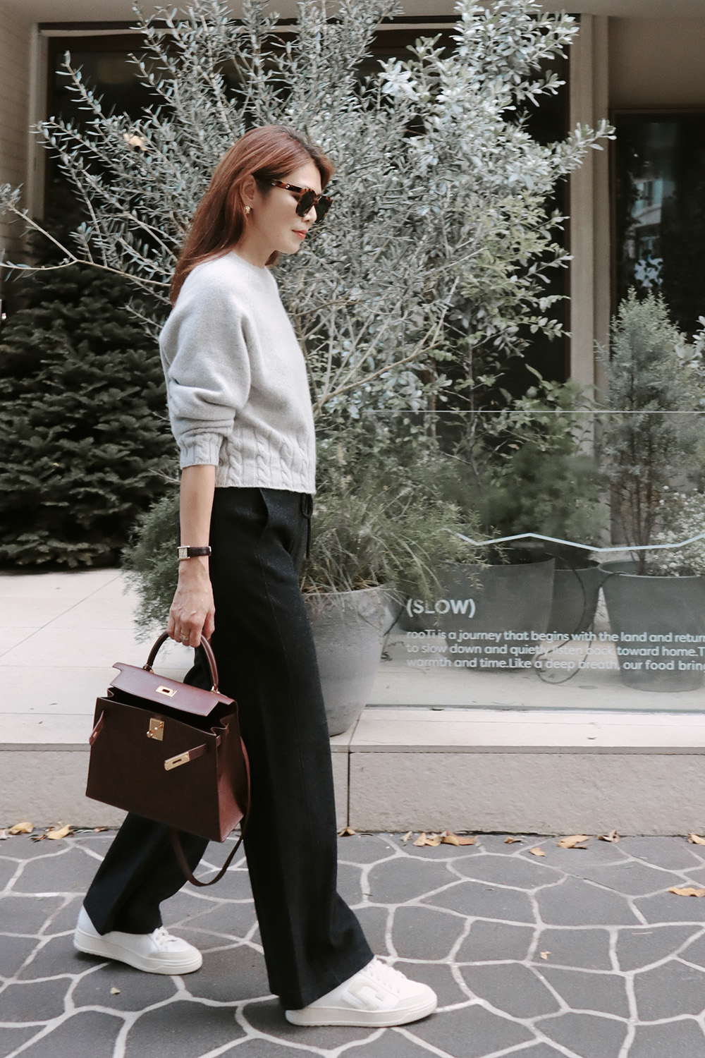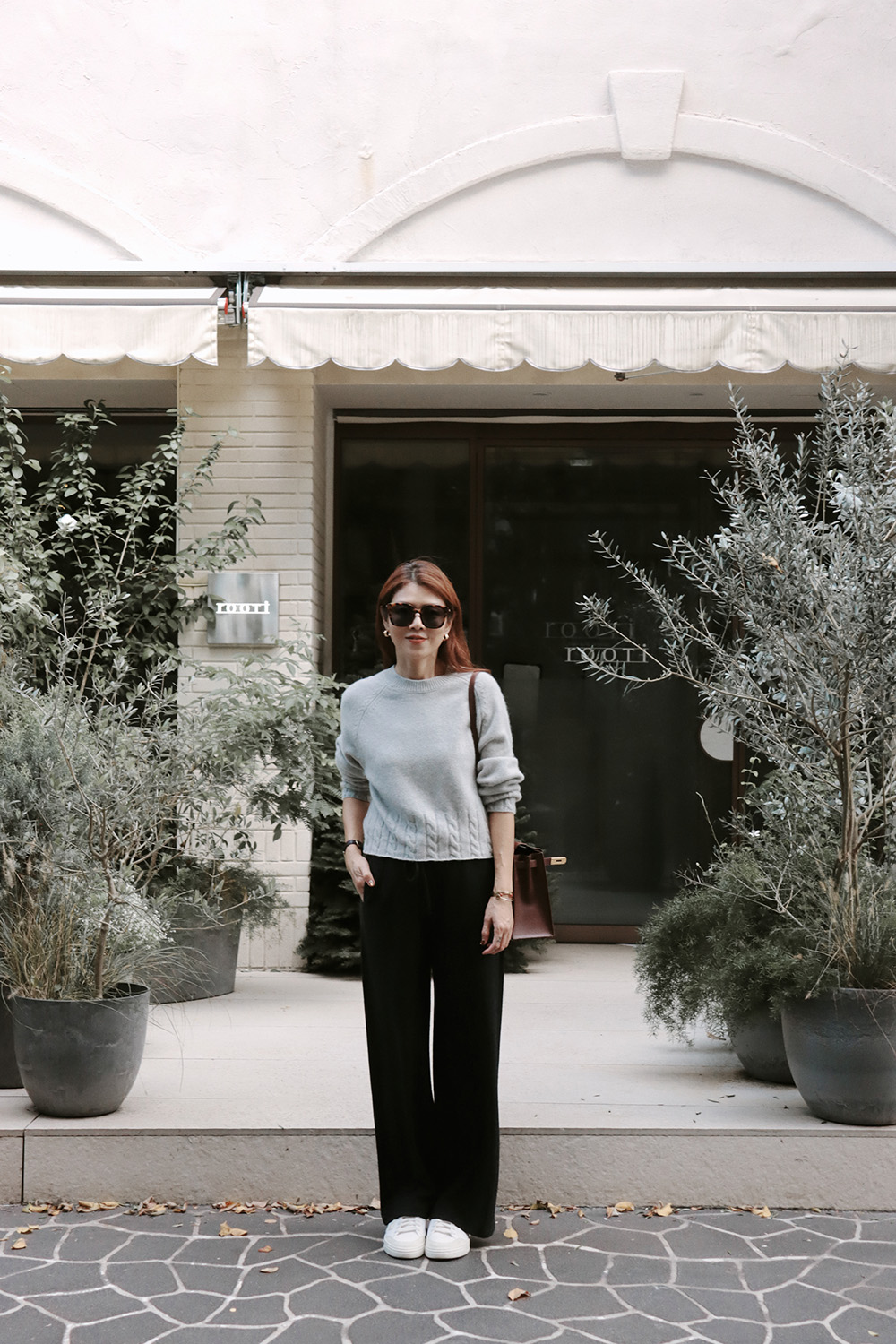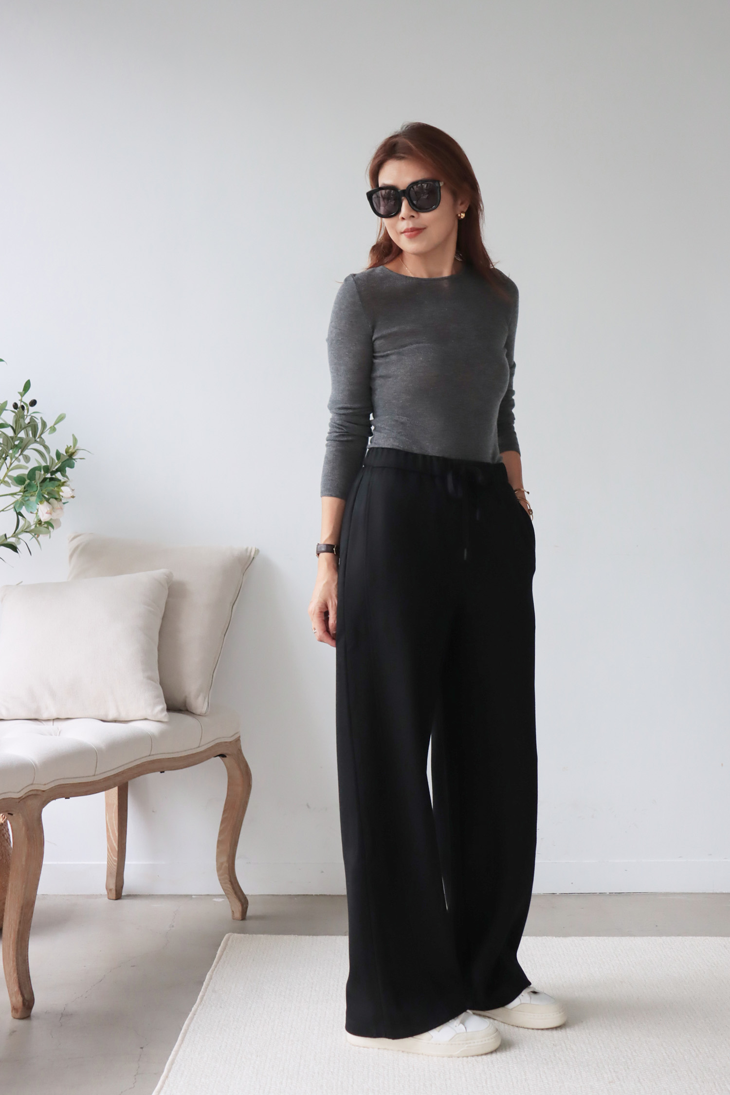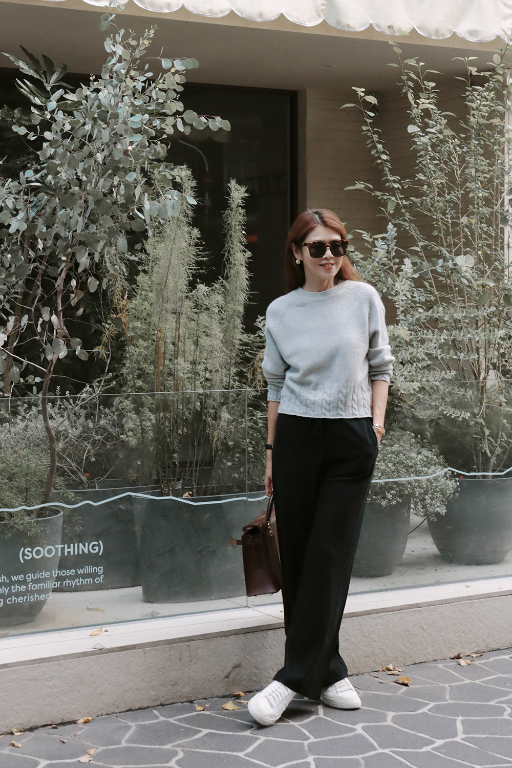 ・上衣-下擺麻花針織毛衣—淺灰 / 羊毛蠶絲圓領後壓線打底長袖上衣—深灰
