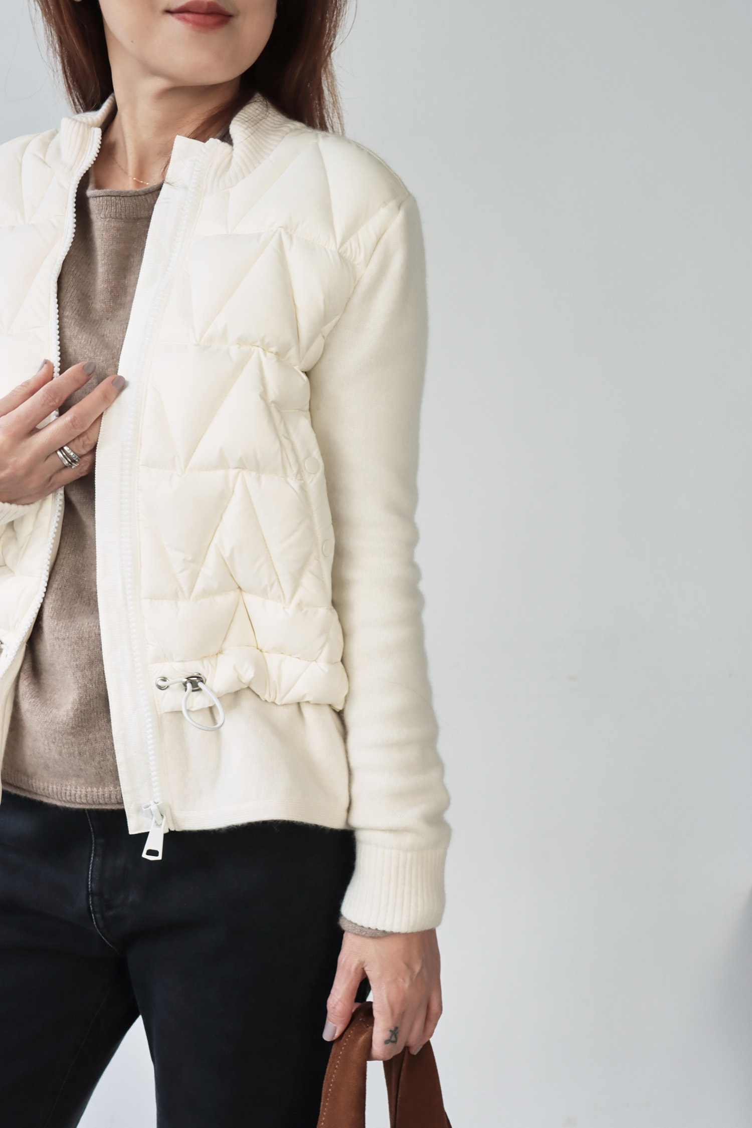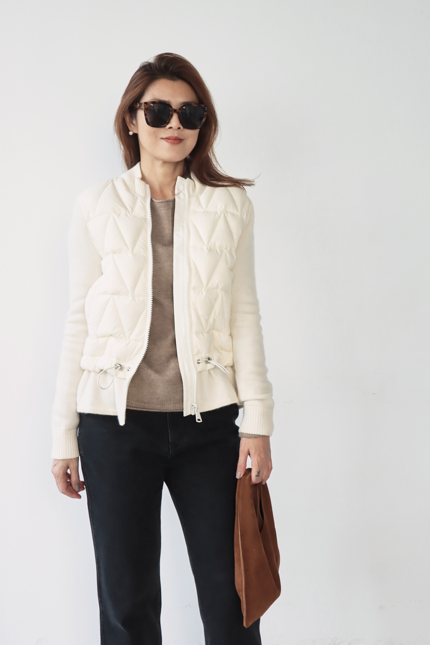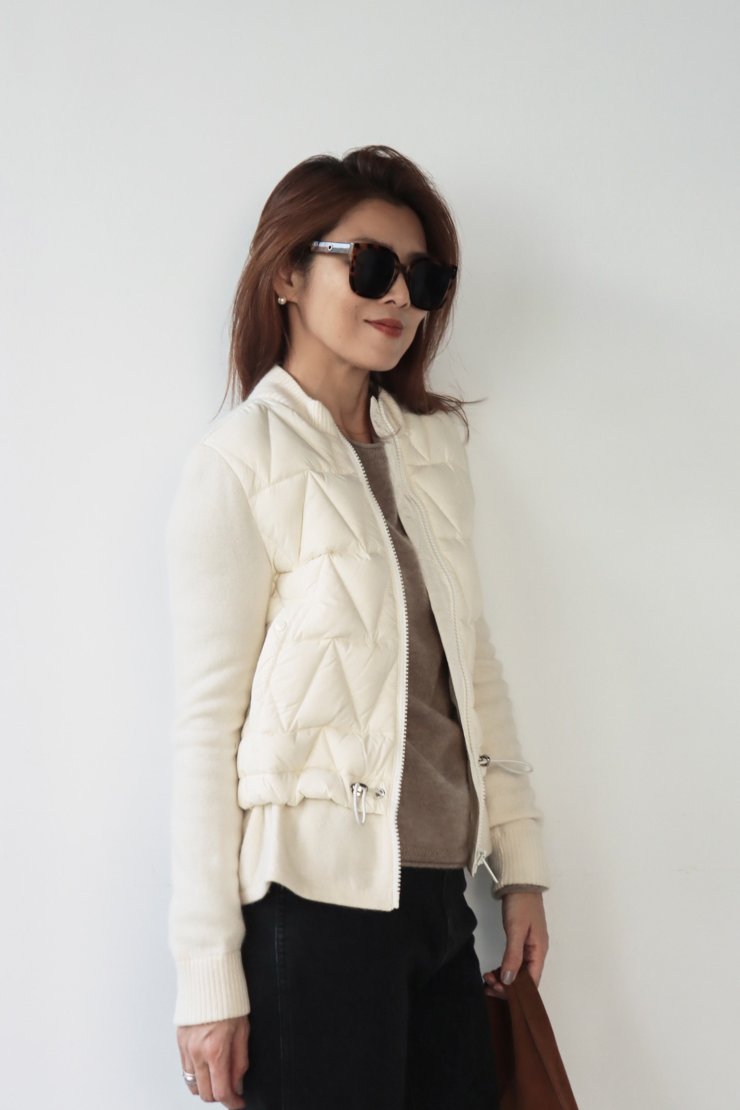 ・這款羽絨外套採用高級喀什米爾羊絨(Cashmere)紗線拼接,觸感柔軟細膩,輕盈舒適不刺膚,兼具輕量防風特性,穿起來溫暖卻不厚重,將機能性與精品感完美融合。內裡填充 90% 白鵝絨,蓬鬆輕盈,保暖度極佳,同時塑造俐落立體的外型輪廓。下擺縮口設計有效鎖溫,提升整體保暖度,讓寒冬穿著依然舒適自在,兼具質感與實用性。