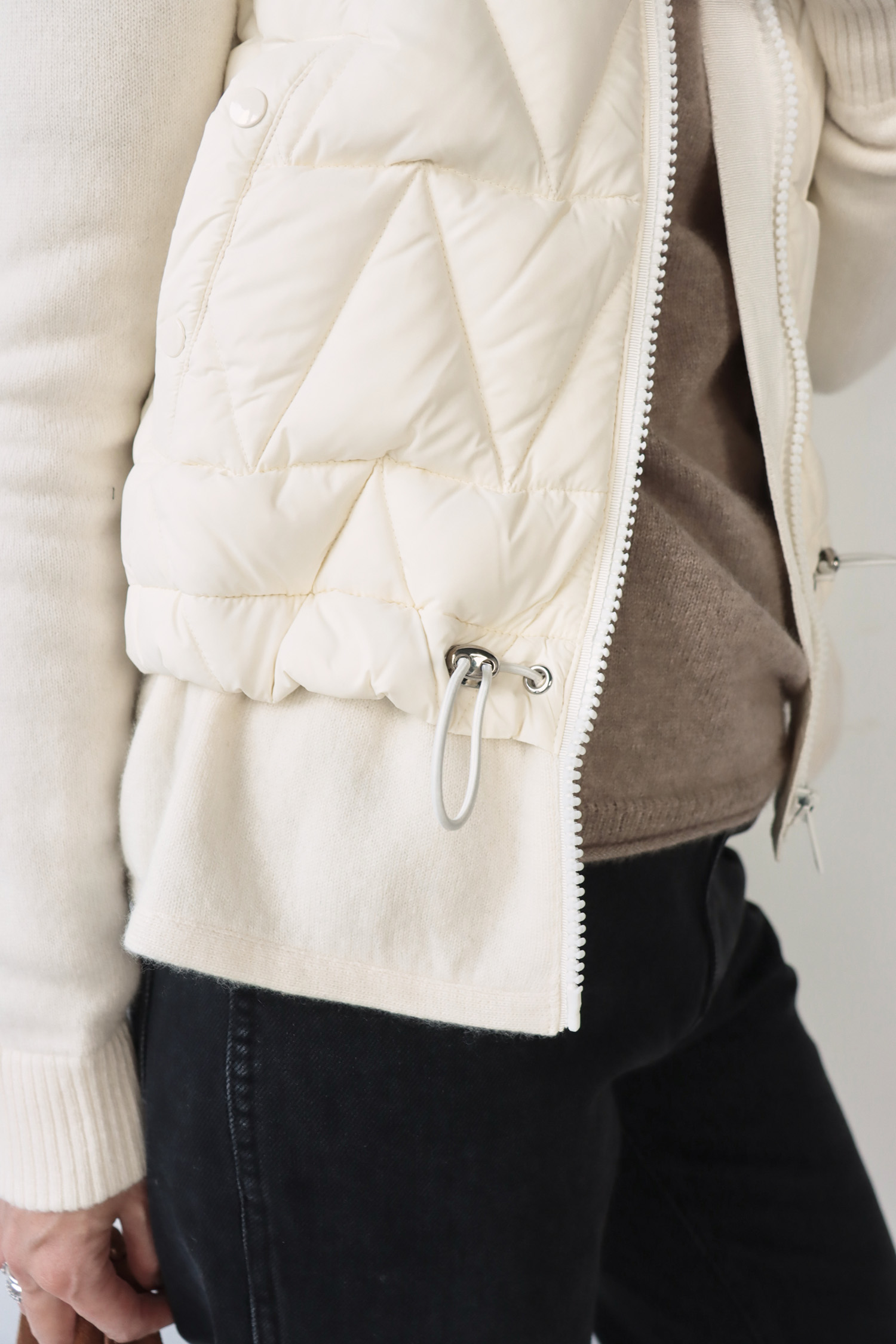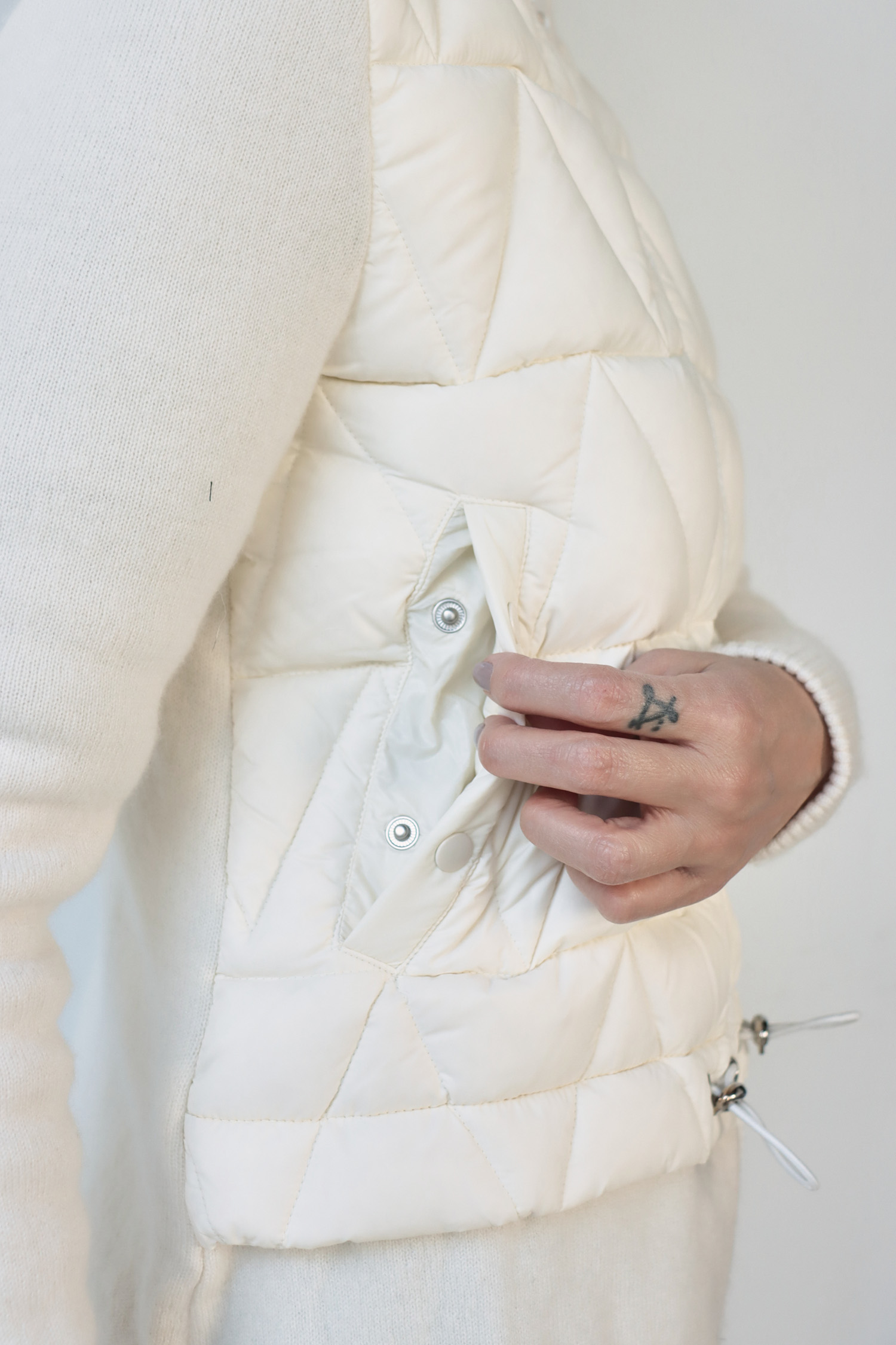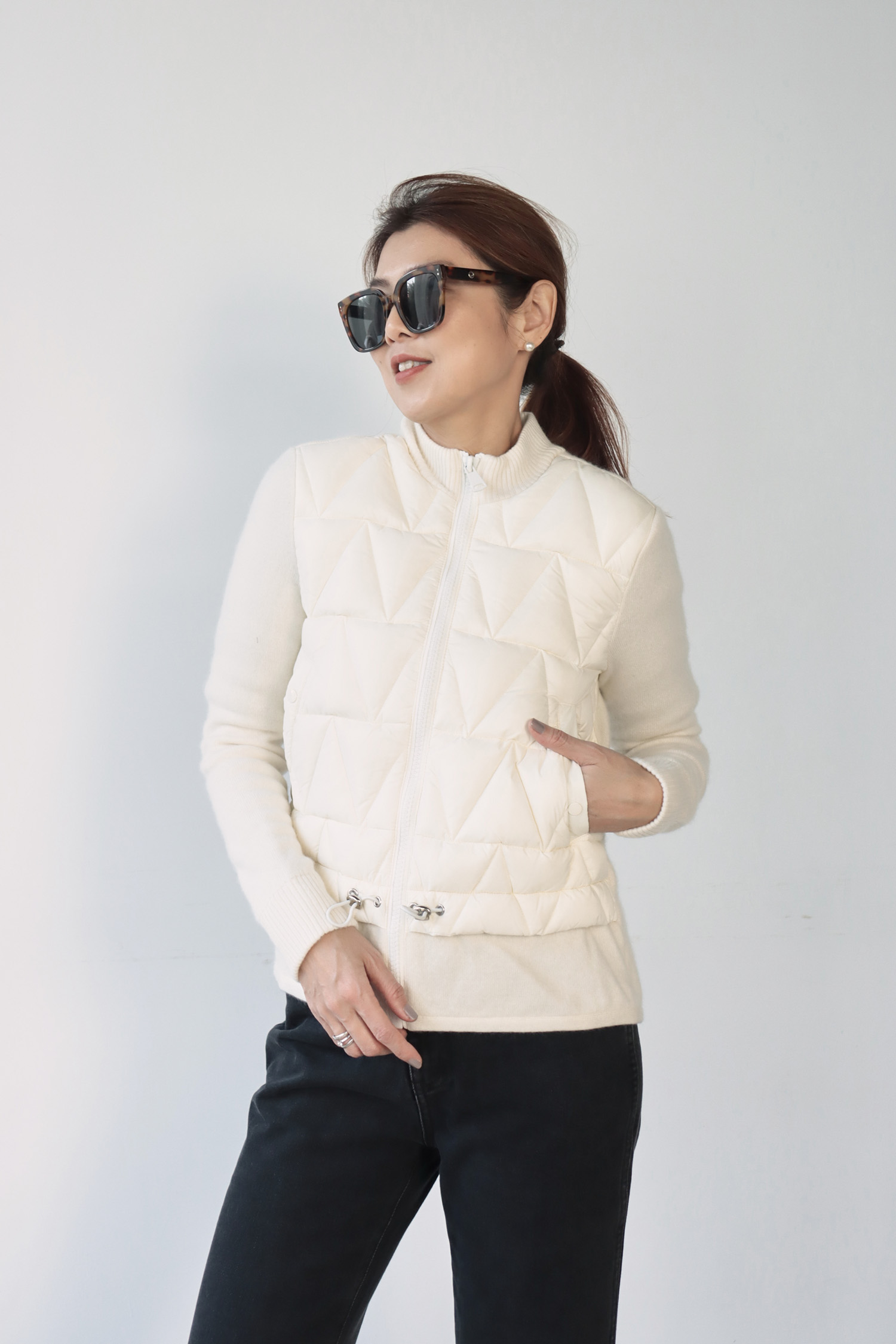 ・這款羽絨外套採用高級喀什米爾羊絨(Cashmere)紗線拼接,觸感柔軟細膩,輕盈舒適不刺膚,兼具輕量防風特性,穿起來溫暖卻不厚重,將機能性與精品感完美融合。內裡填充 90% 白鵝絨,蓬鬆輕盈,保暖度極佳,同時塑造俐落立體的外型輪廓。下擺縮口設計有效鎖溫,提升整體保暖度,讓寒冬穿著依然舒適自在,兼具質感與實用性。