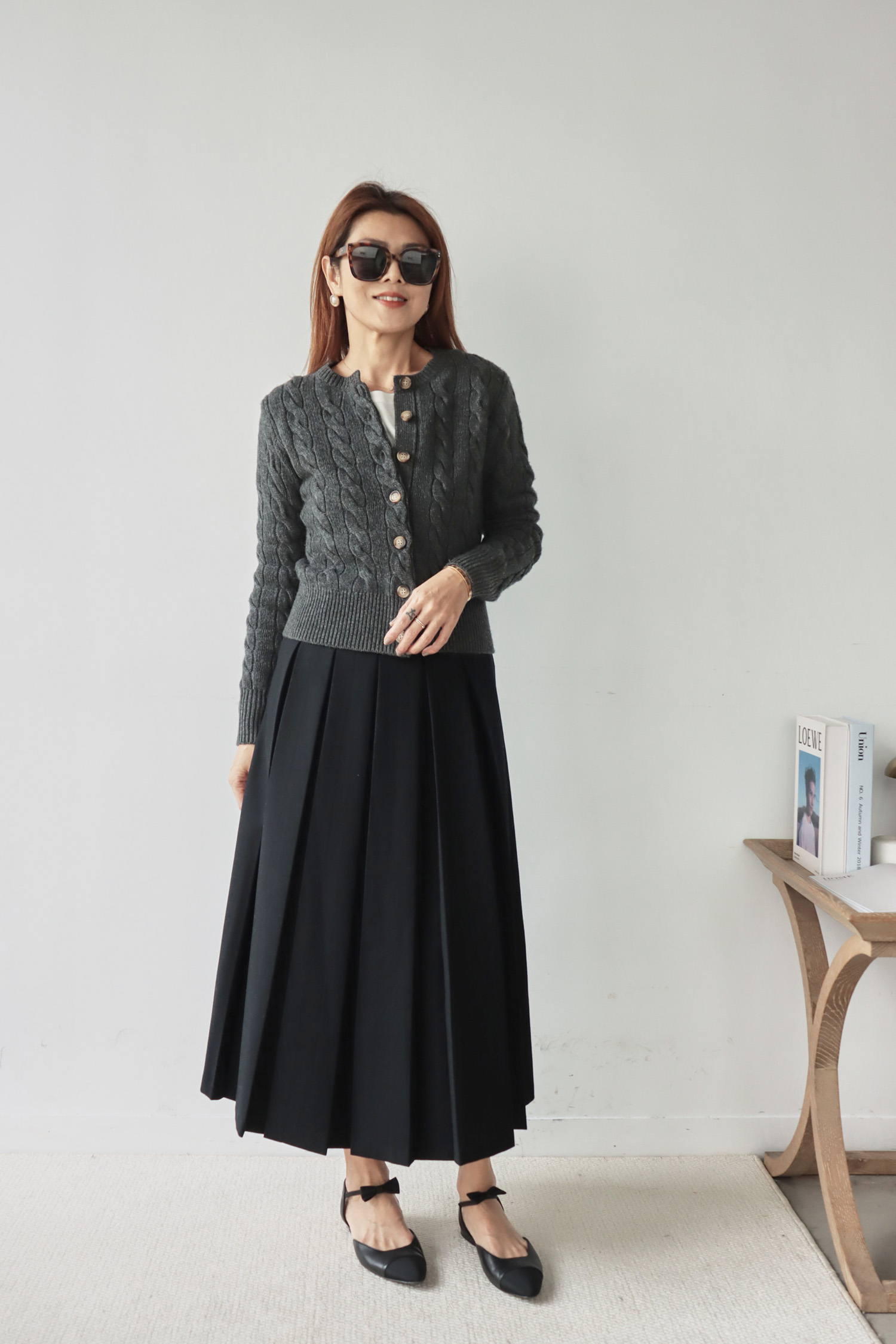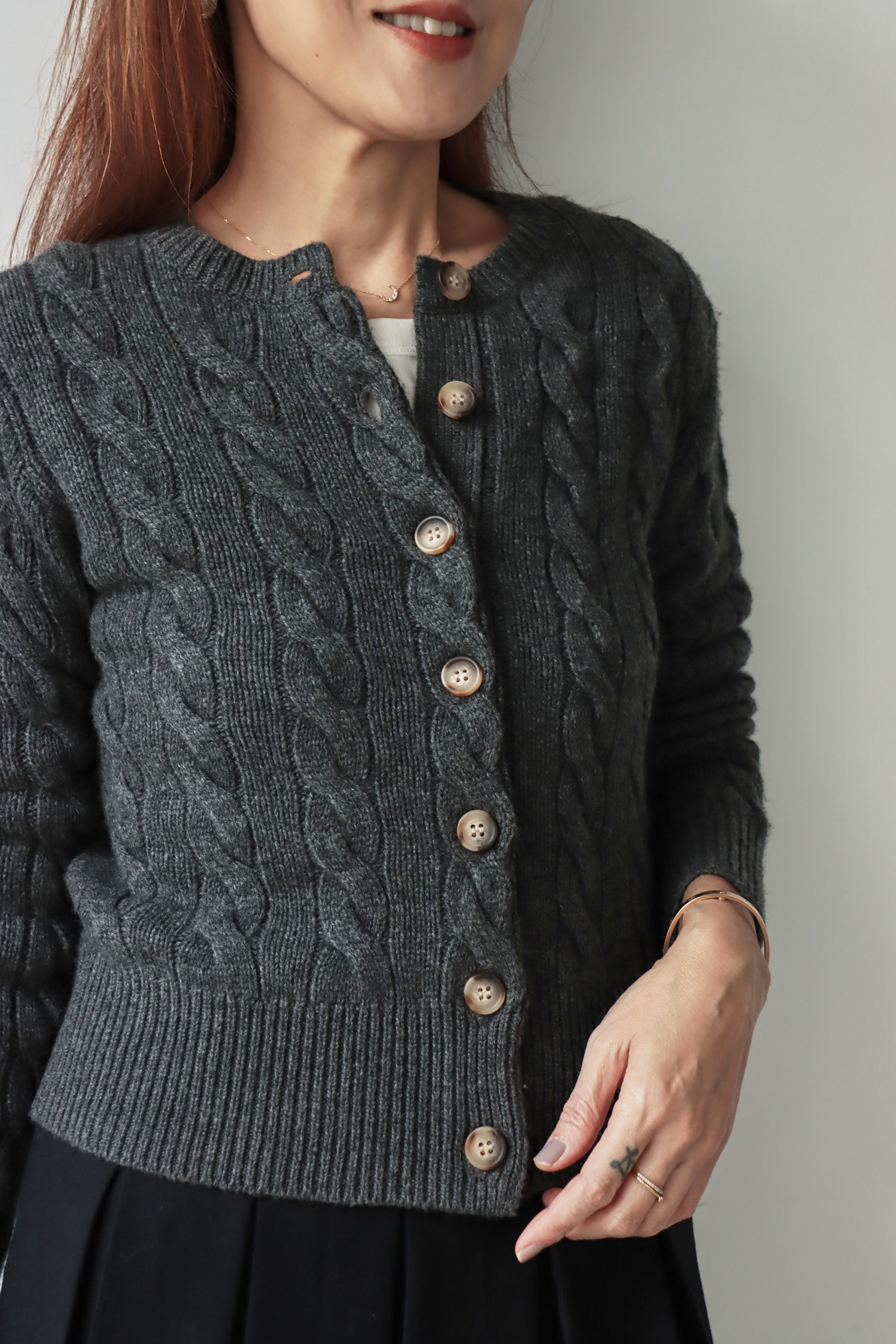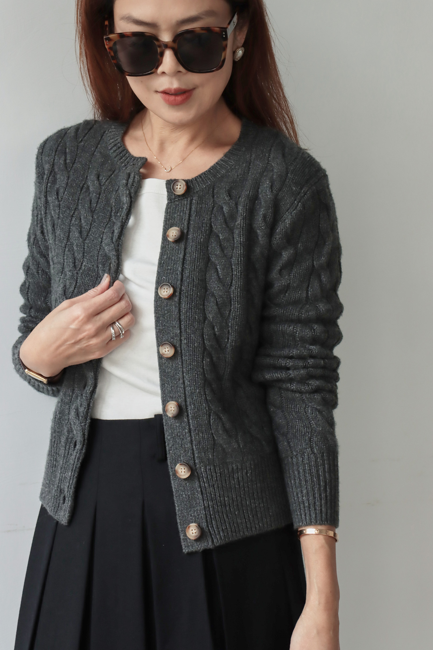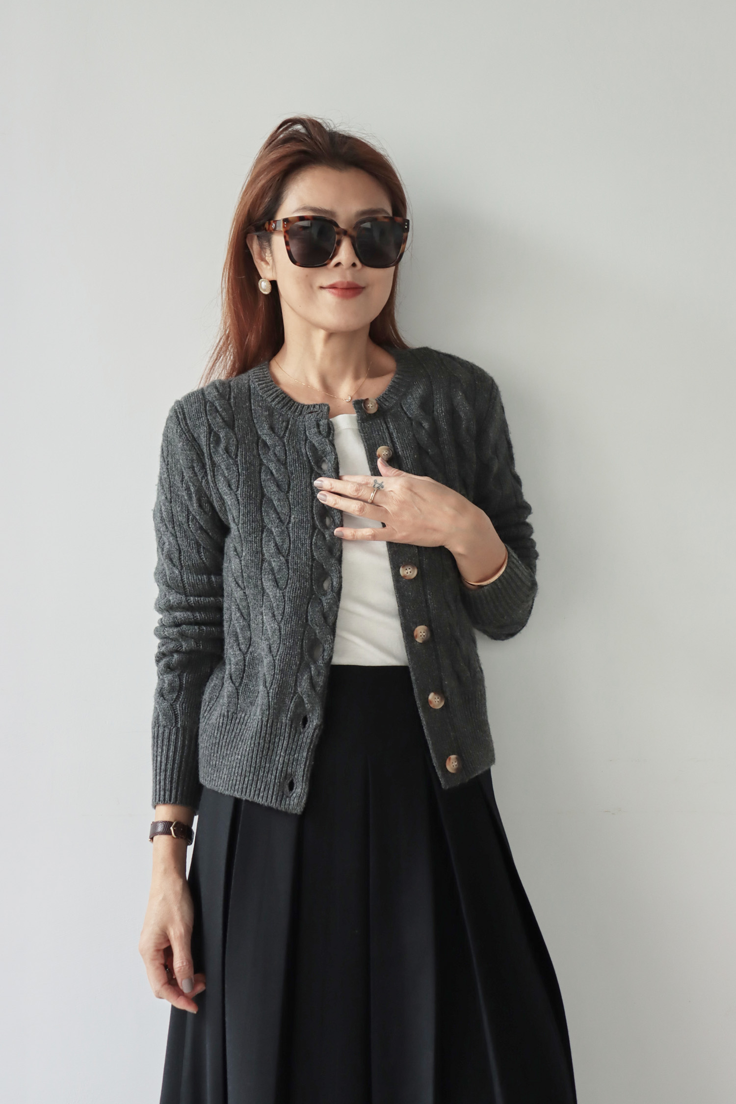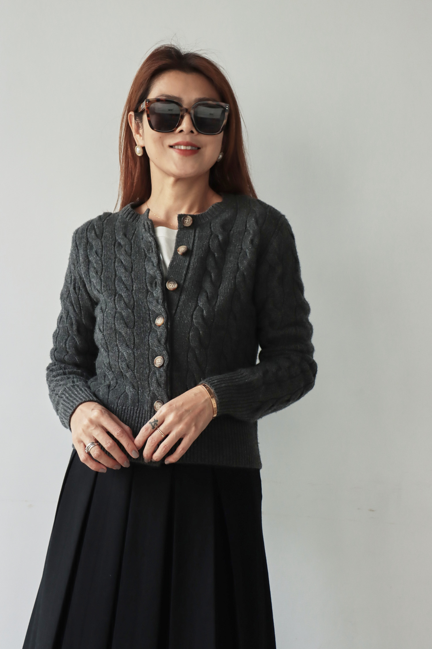・選用90% Cotton + 10% Cashmere混紡材質,觸感柔軟親膚,兼具良好透氣度與細緻保暖性。經典麻花編織為整體增添立體紋理,展現因潤細膩的質感層次;圓領設計修飾頸部線條,合身版型勾勒俐落身形,穿著更顯精神,搭配溫潤光澤的琥珀釦點綴,低調中展現精緻細節,無論單穿或作為外套,都能輕鬆演繹優雅耐看的日常風格。