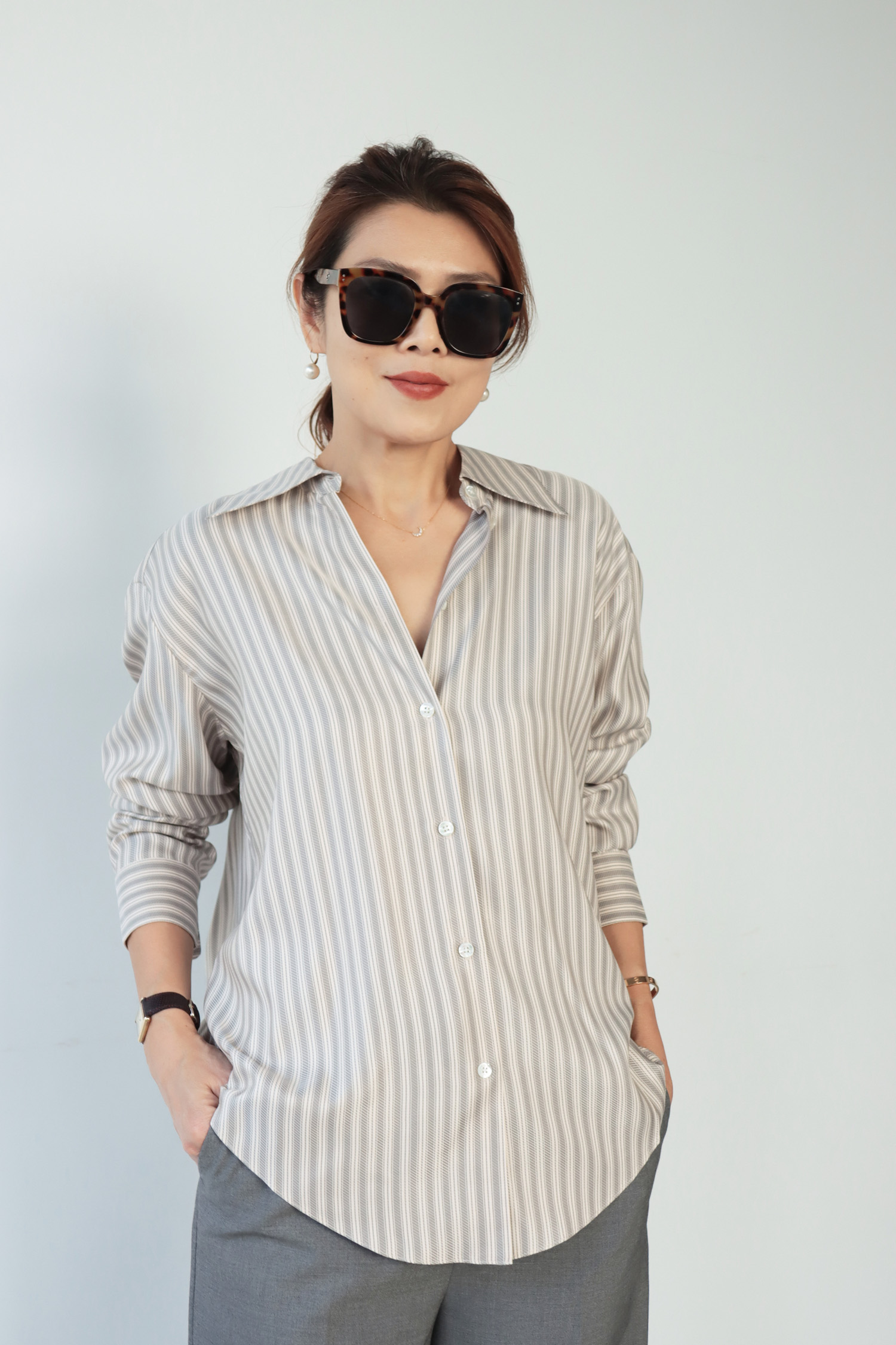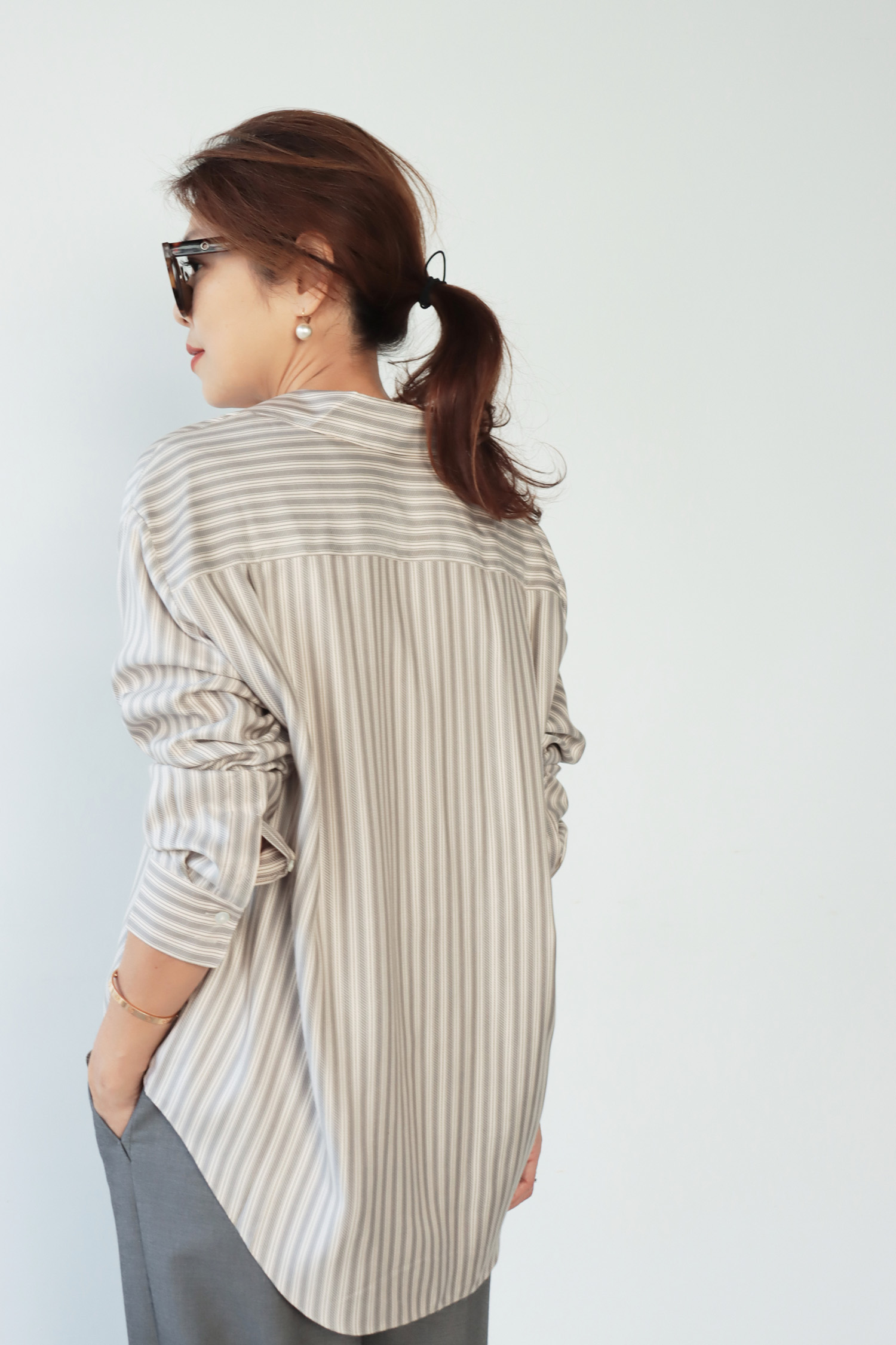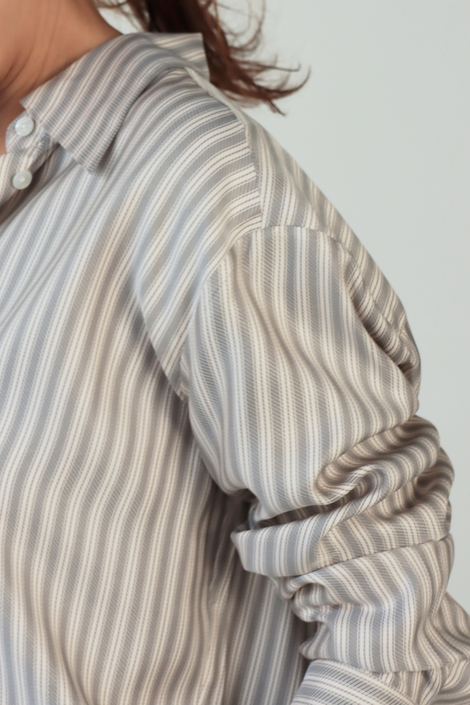 ・採用真絲面料,質地細膩輕柔,布面自然流動,呈現優雅細緻的垂墜感與柔和光澤。條紋設計為整體增添俐落感,在輕盈材質中保留清爽結構。下擺圓弧剪裁,搭配前短後長的比例,自然拉長身形線條,無論紮入或放出穿著皆能呈現平衡輪廓;整體為寬鬆版型,穿著不拘束,隨著身體動作自然垂落,展現真絲特有的流暢線條感,兼具舒適與質感。