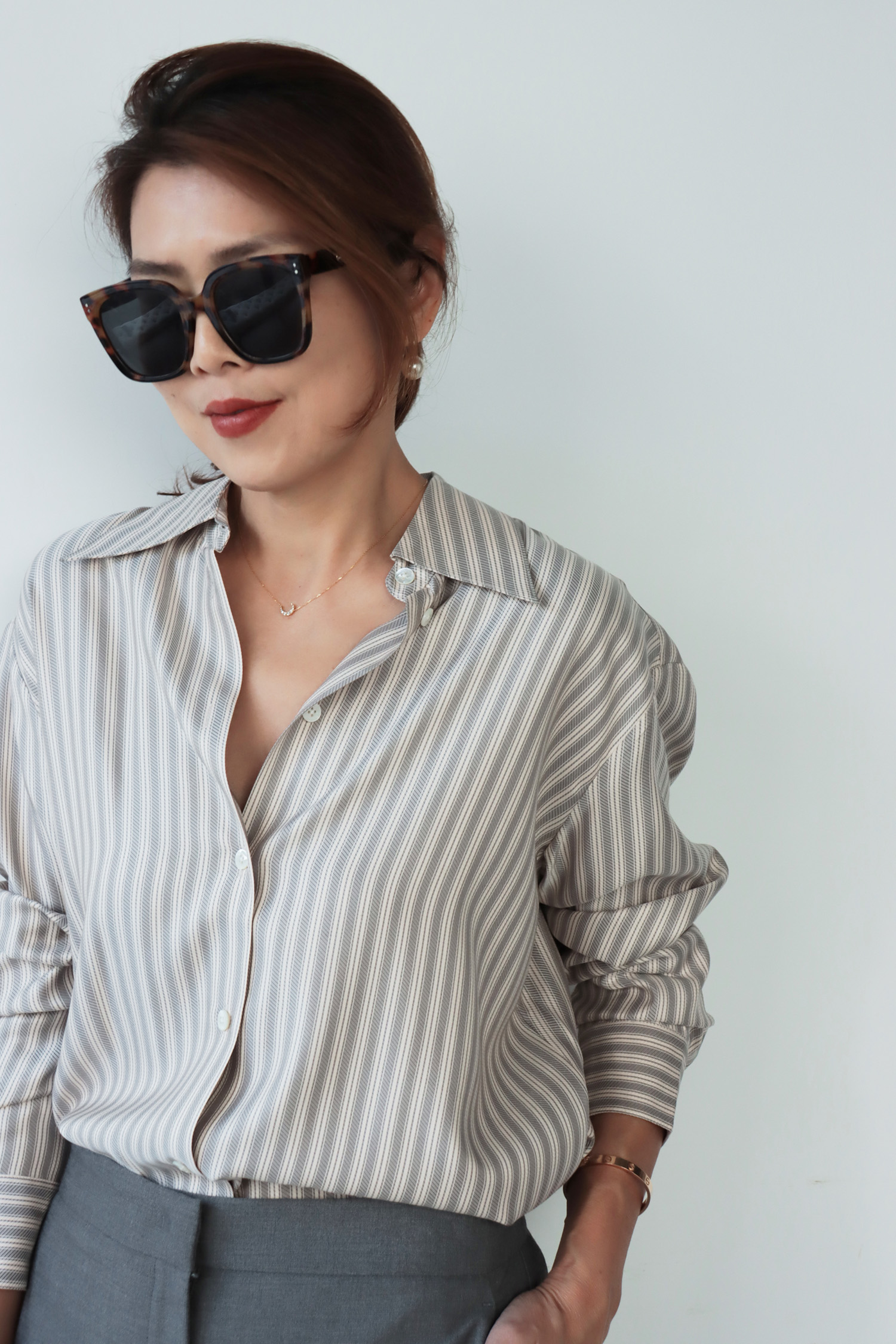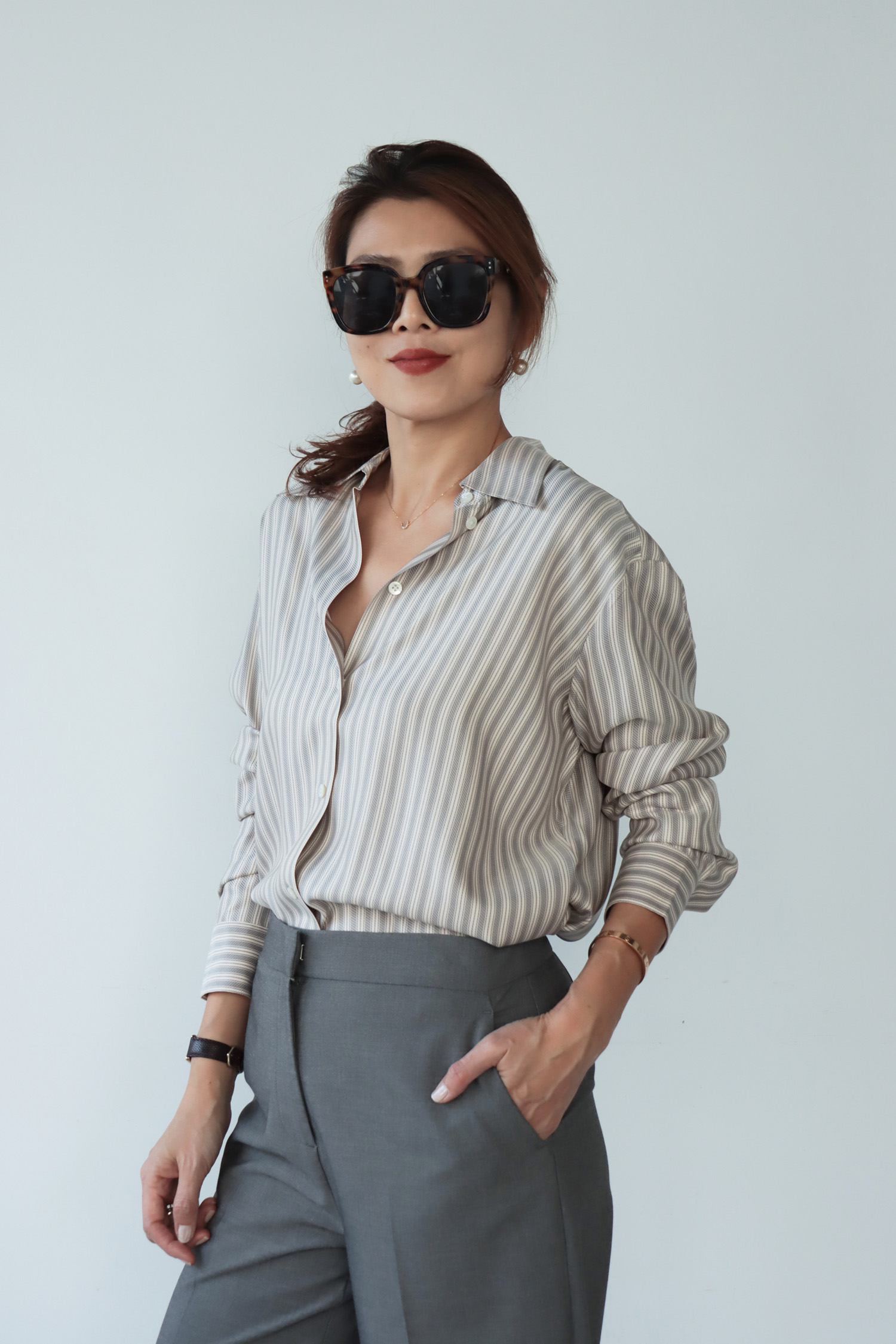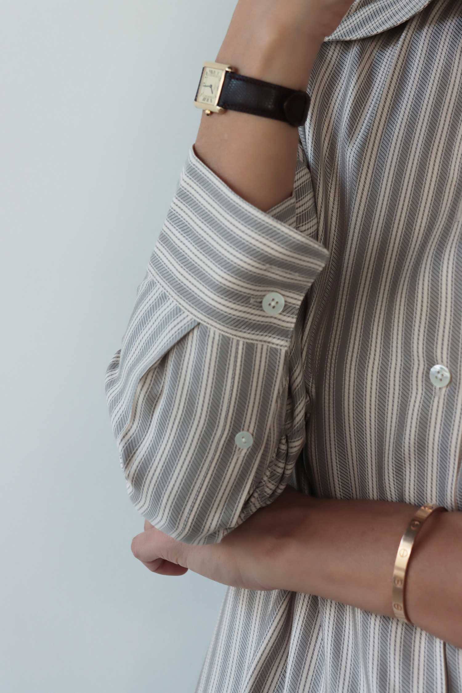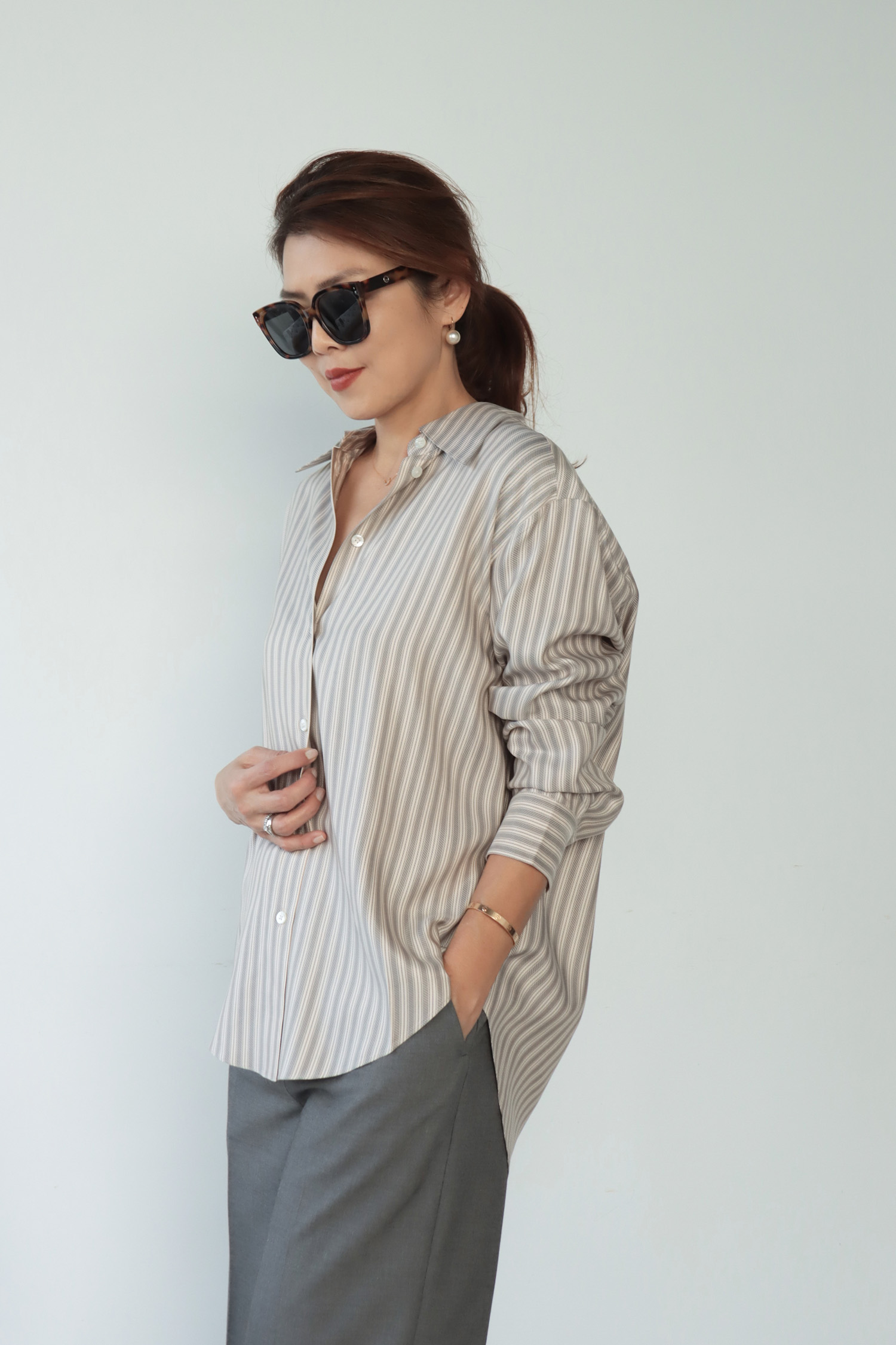 ・採用真絲面料,質地細膩輕柔,布面自然流動,呈現優雅細緻的垂墜感與柔和光澤。條紋設計為整體增添俐落感,在輕盈材質中保留清爽結構。下擺圓弧剪裁,搭配前短後長的比例,自然拉長身形線條,無論紮入或放出穿著皆能呈現平衡輪廓;整體為寬鬆版型,穿著不拘束,隨著身體動作自然垂落,展現真絲特有的流暢線條感,兼具舒適與質感。