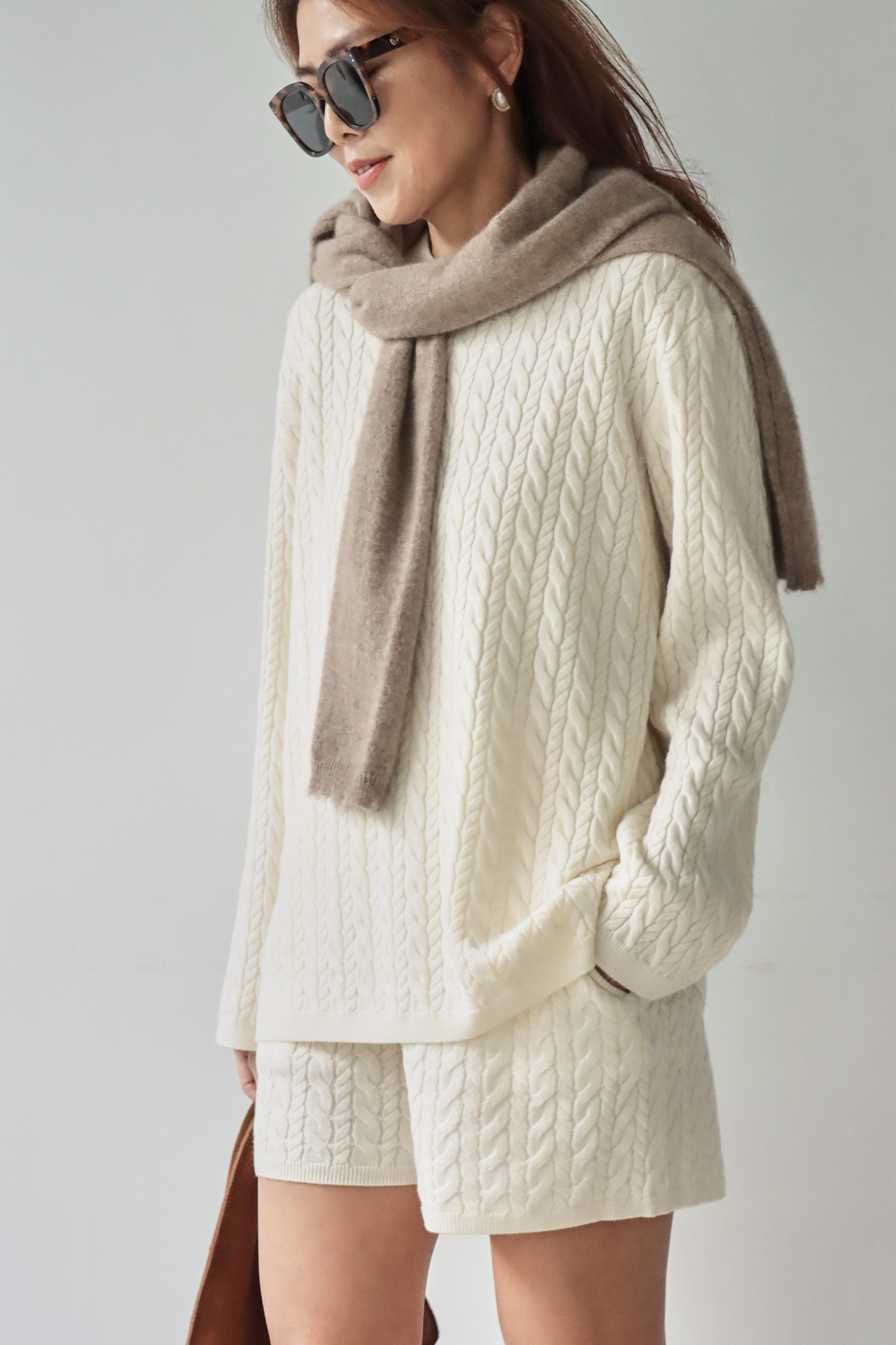 ・採用100% Wool純羊毛織製,質地溫潤細緻,兼具保暖性與良好挺度。以粗麻花編織呈現立體層次與豐富手感,褲型不貼合大腿,穿著舒適自在並修飾線條。兩側設有實用口袋,兼顧造型與機能性;整體輪廓挺而不硬,垂墜自然,結合細緻的羅紋收邊提升整體完成度,使線條更俐落耐看。