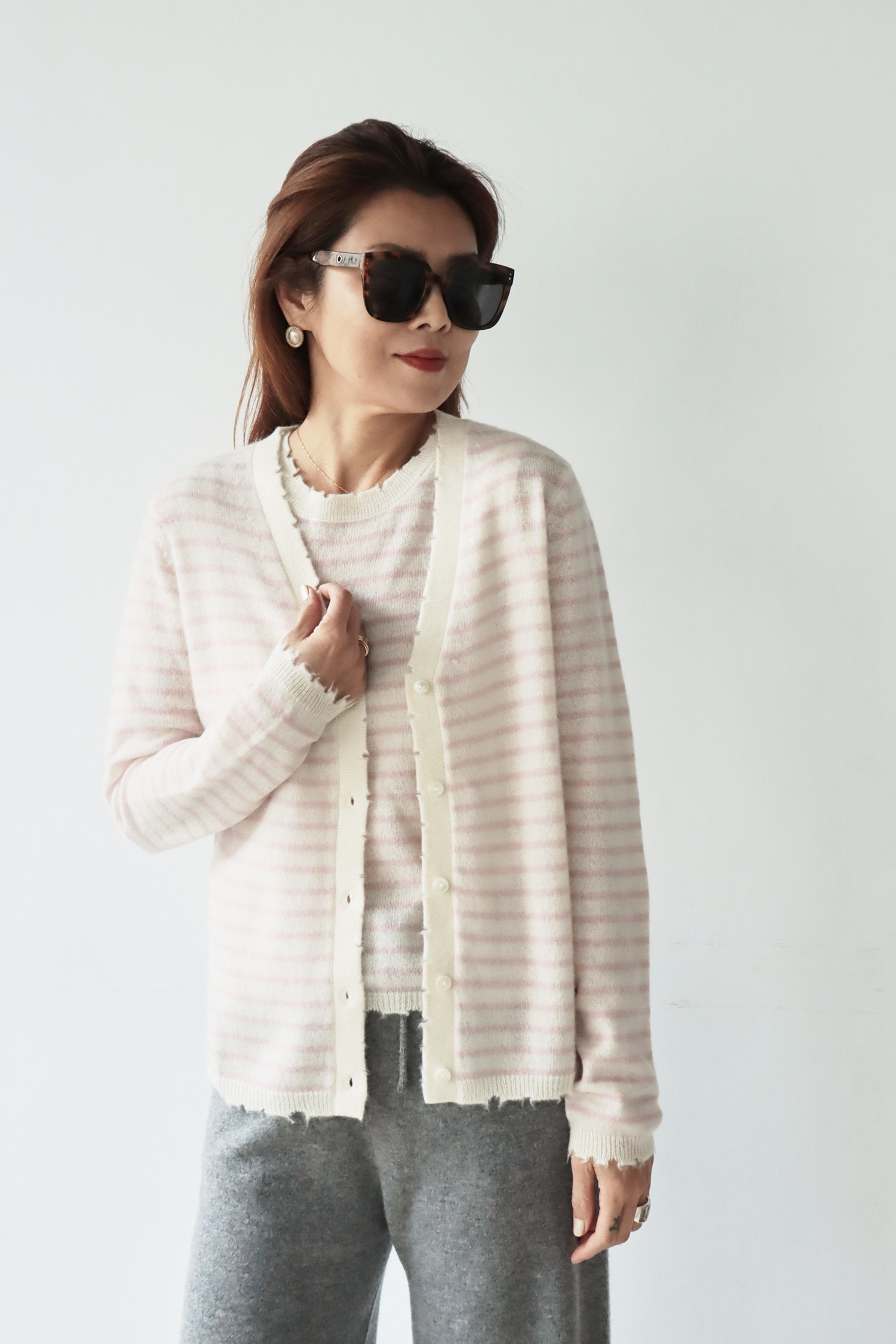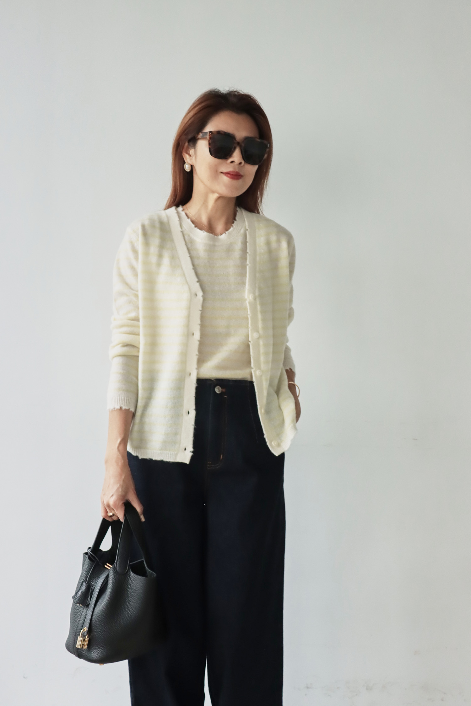 ・選用100% Cashmere高級紗線,柔軟絨毛感,質地柔軟不刺膚,帶來輕盈卻保暖的高級觸感。柔和如馬卡龍般的色調,為整體造型帶來溫柔卻不甜膩的視覺效果,不刻意修飾的毛邊細節,自然流露鬆弛與自在;經典開襟設計可敞開或扣合穿著,自由調整造型層次,實穿度高,不貼身也不厚重,穿著舒適同時達到顯瘦效果,輕鬆融入日常生活。