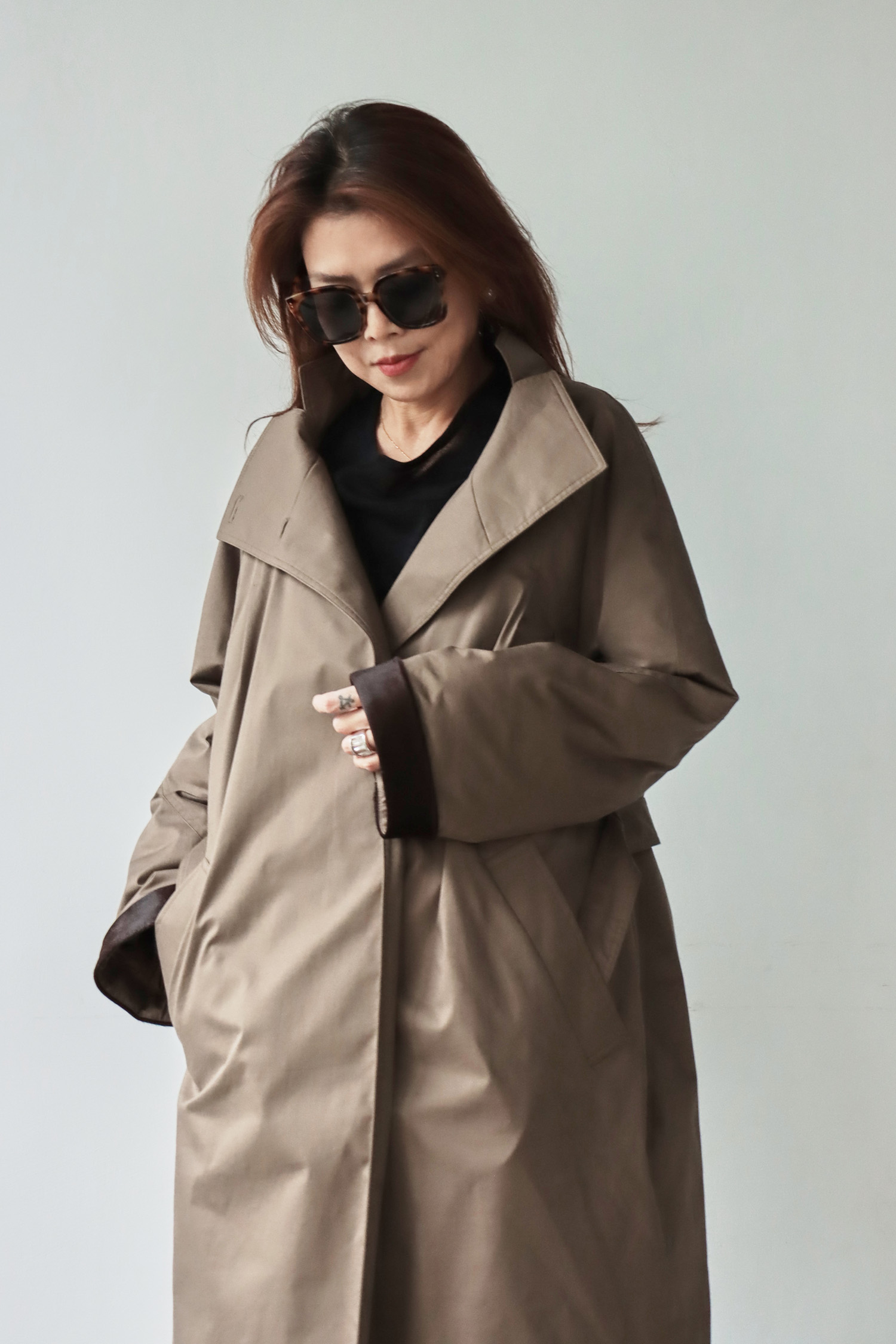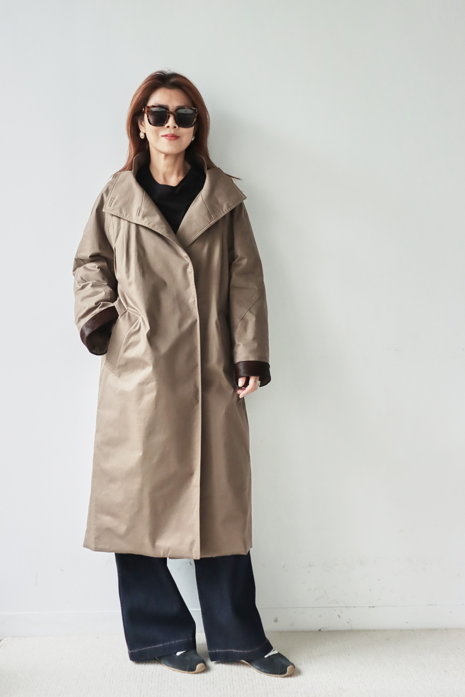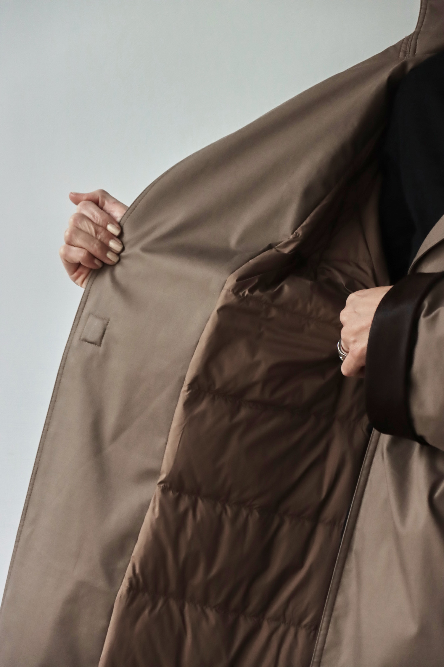 ・外觀俐落如風衣,內裡卻是蓬鬆保軟的羽絨結構,完美結合造型感與實穿性。表布觸感細緻挺拔,低調中展現高級質感,內裡填充高品質鵝絨,輕盈卻具備優異保暖度;細節上以磁釦設計提升穿脫便利性,袖口搭配胎牛皮毛增添層次與保暖效果,領口可立領亦可翻領,隨造型自由變化;長版剪裁修飾身形、防風性佳,是一件外表簡約優雅、內在溫暖厚實的秋冬質感單品。