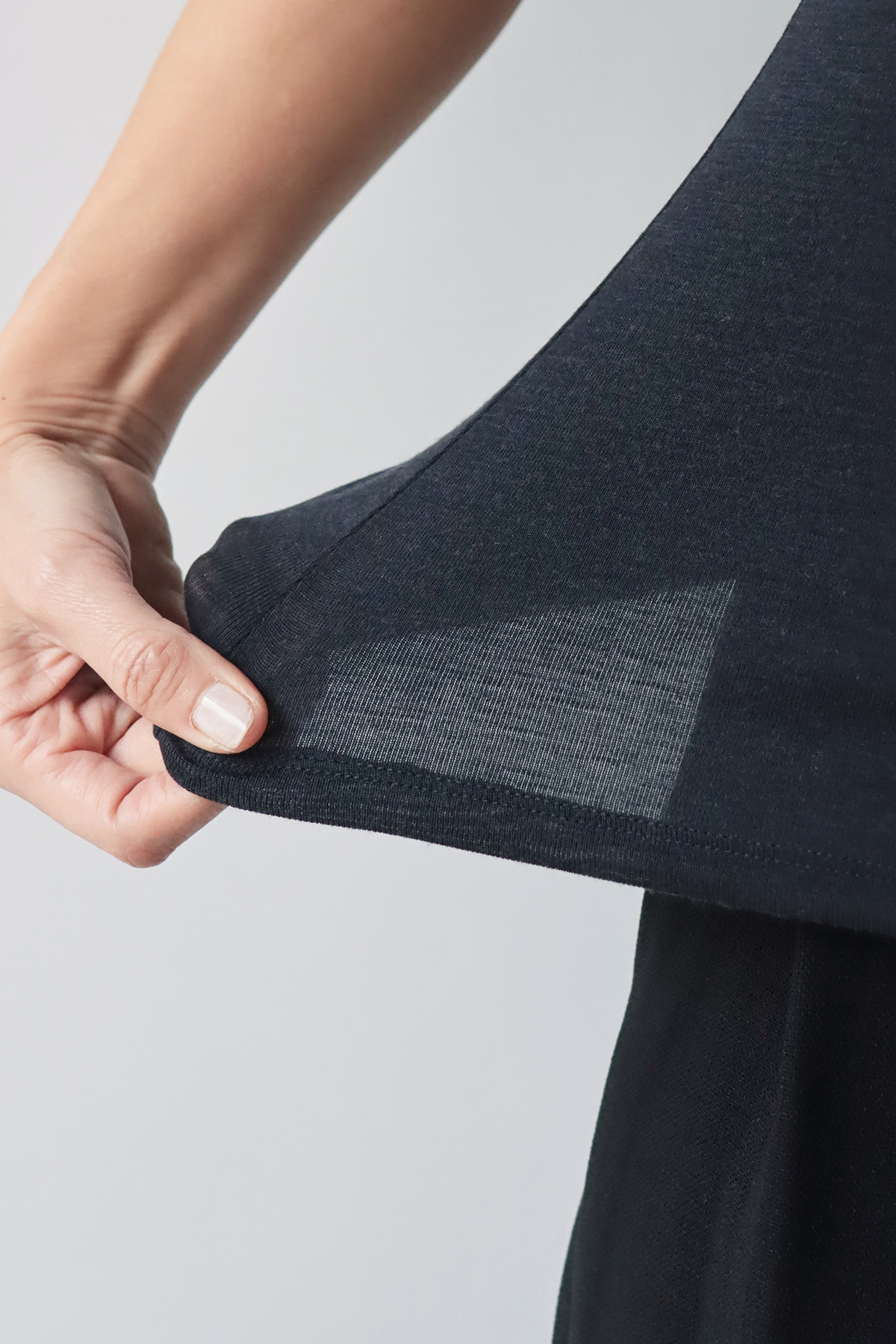 ・選用95% Wool+5% Spandex彈性混紡面料,保有羊毛的細緻溫潤觸感,同時提升延展性與穿著舒適度。摻色混織紗線帶出自然層次感,使布面呈現低調而不單調的視覺效果,增添細節質感。袖口採用斜切設計,線條俐落,修飾手臂輪廓,讓簡約版型更具設計感。整體為合身但不貼身的剪裁,順著身形線條自然延展,修飾比例同時保留舒適空間,適合單穿或作為內搭。