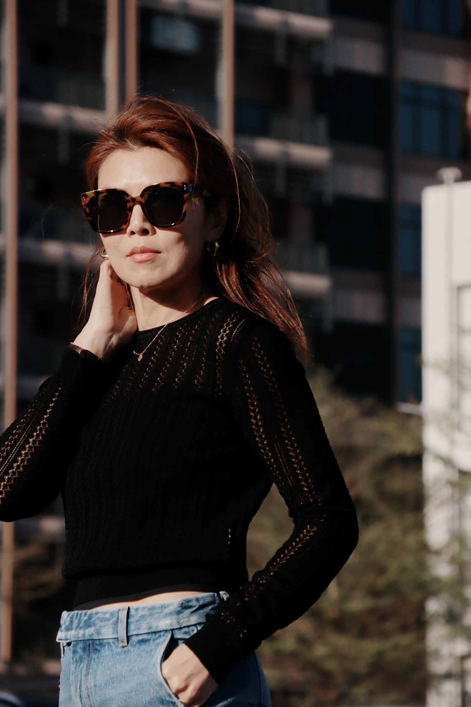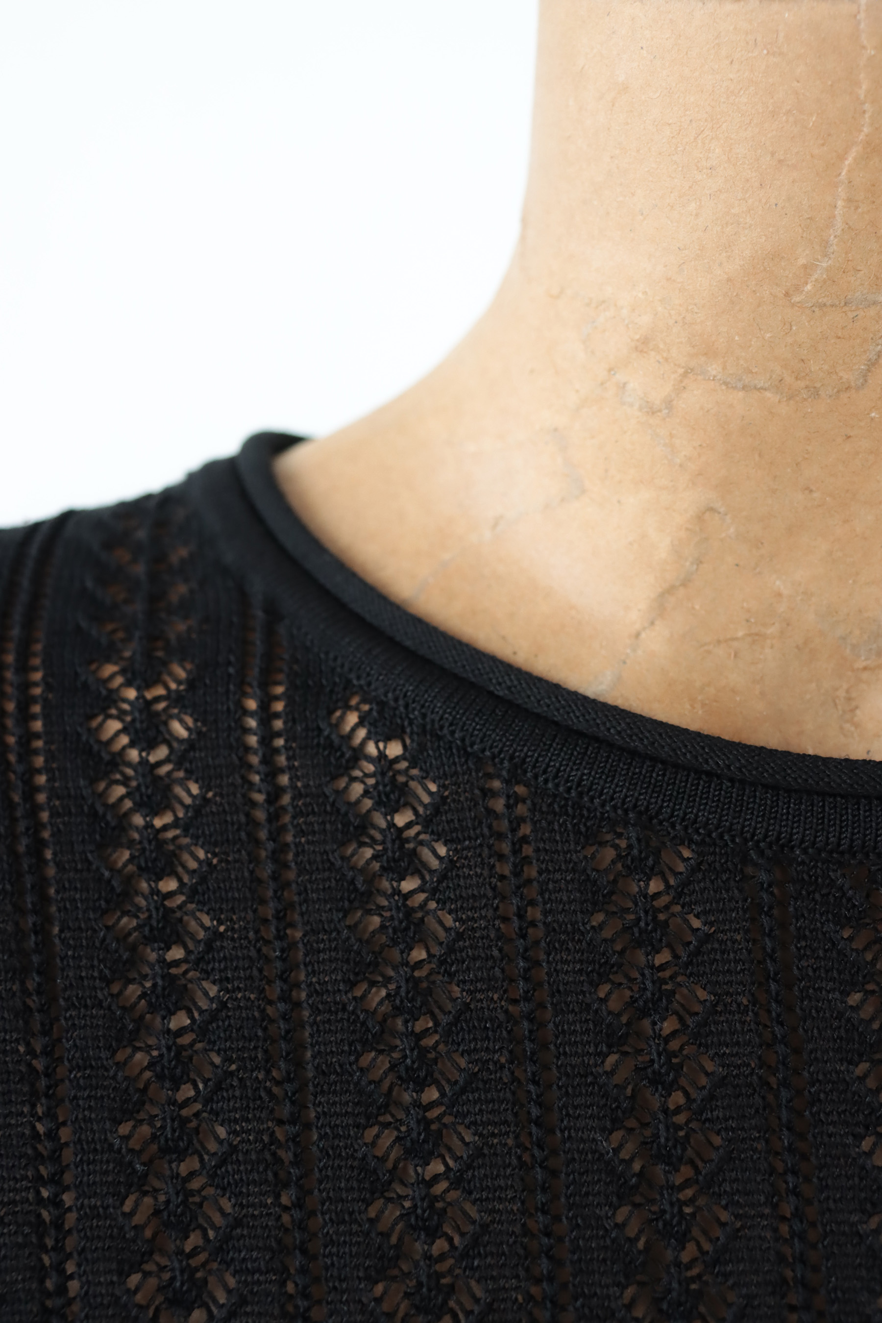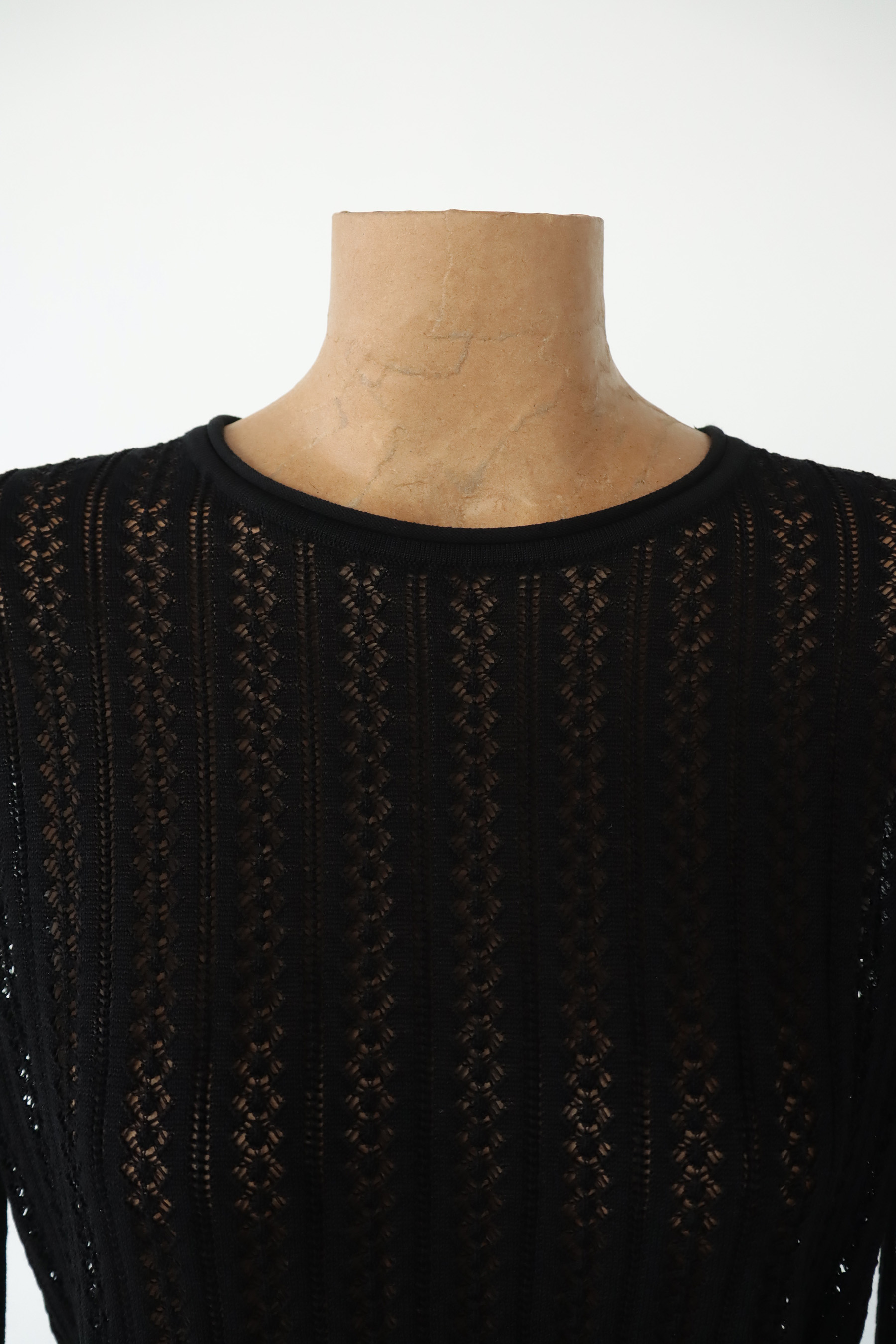 ・布料由多種纖維混紡而成,觸感柔滑細緻輕盈透氣,穿起來貼膚舒適帶有自然垂墜感;細緻蕾絲簍空織紋勾勒出優雅質感,呈現輕盈而富有層次的視覺效果,短版剪裁搭配修身長袖輪廓,在柔美與俐落之間取得恰到好處的平衡。