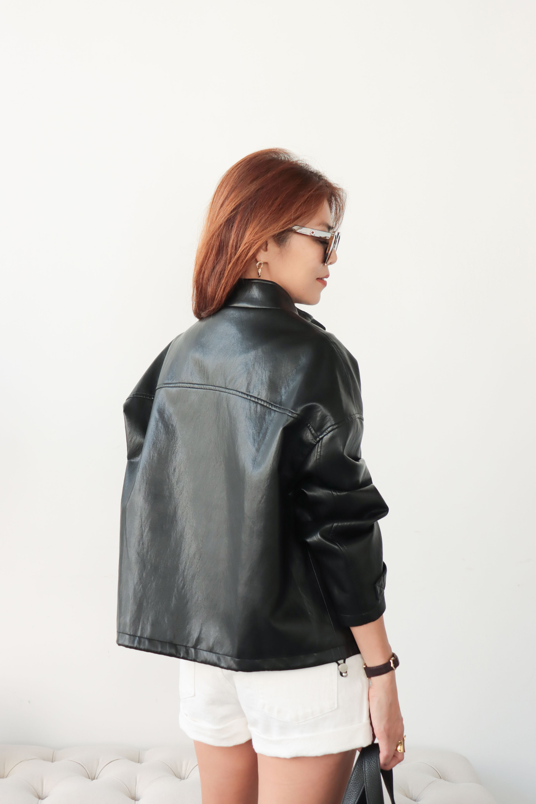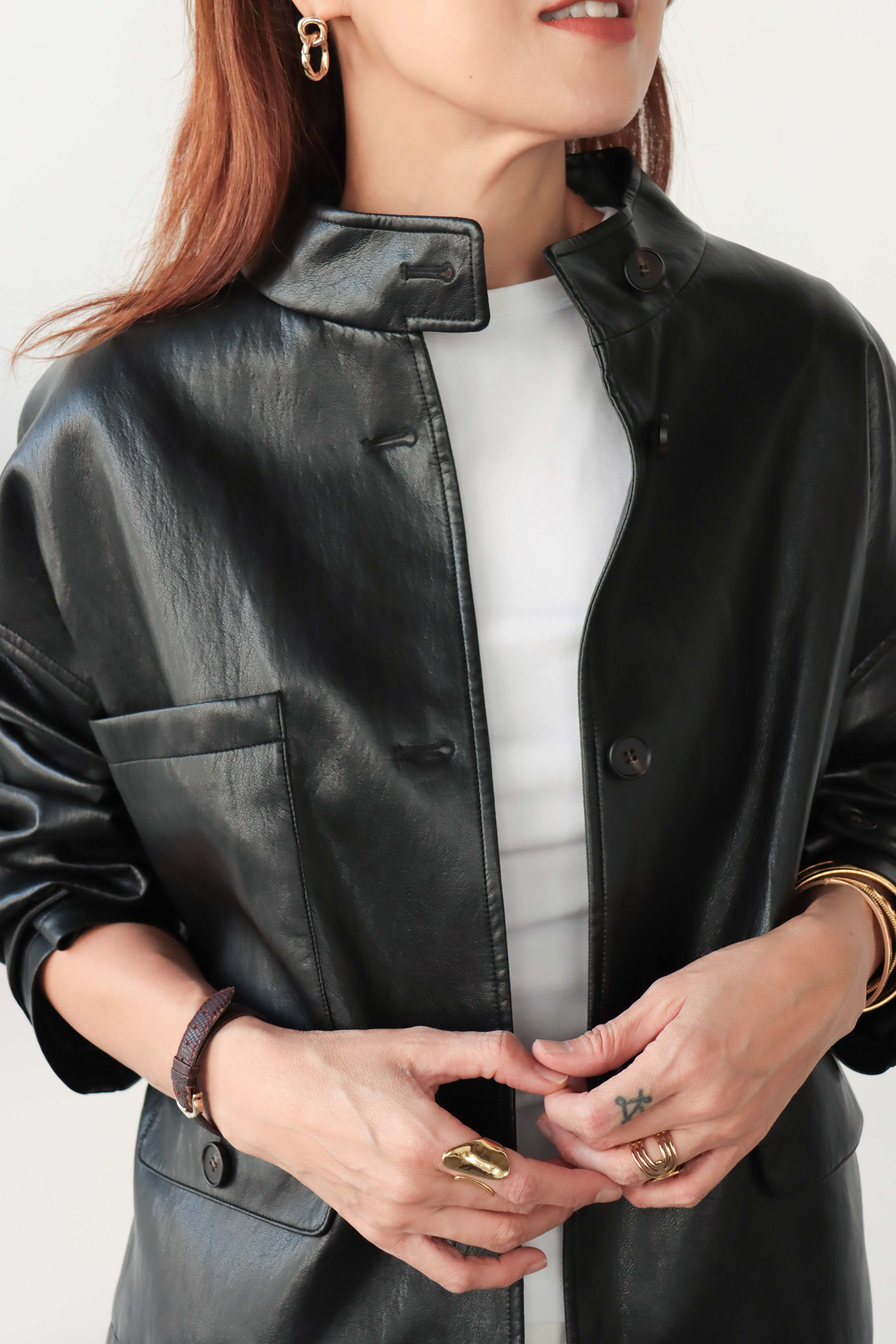採用蛋白皮(Protein Leather)製作,柔軟輕盈、透氣舒適,兼具彈性與挺度穿起來自在俐落,同時保有皮革的質感與環保特性。立領設計與排釦細節展現俐落線條感,兼具時尚與實穿性,大雙貼袋不僅增添造型層次,也提供實用收納空間,下擺可調節縮口則讓整體造型更靈活隨心。